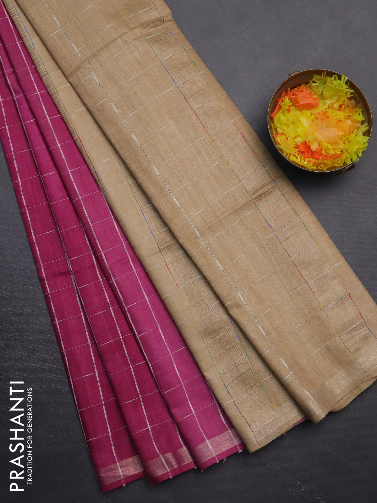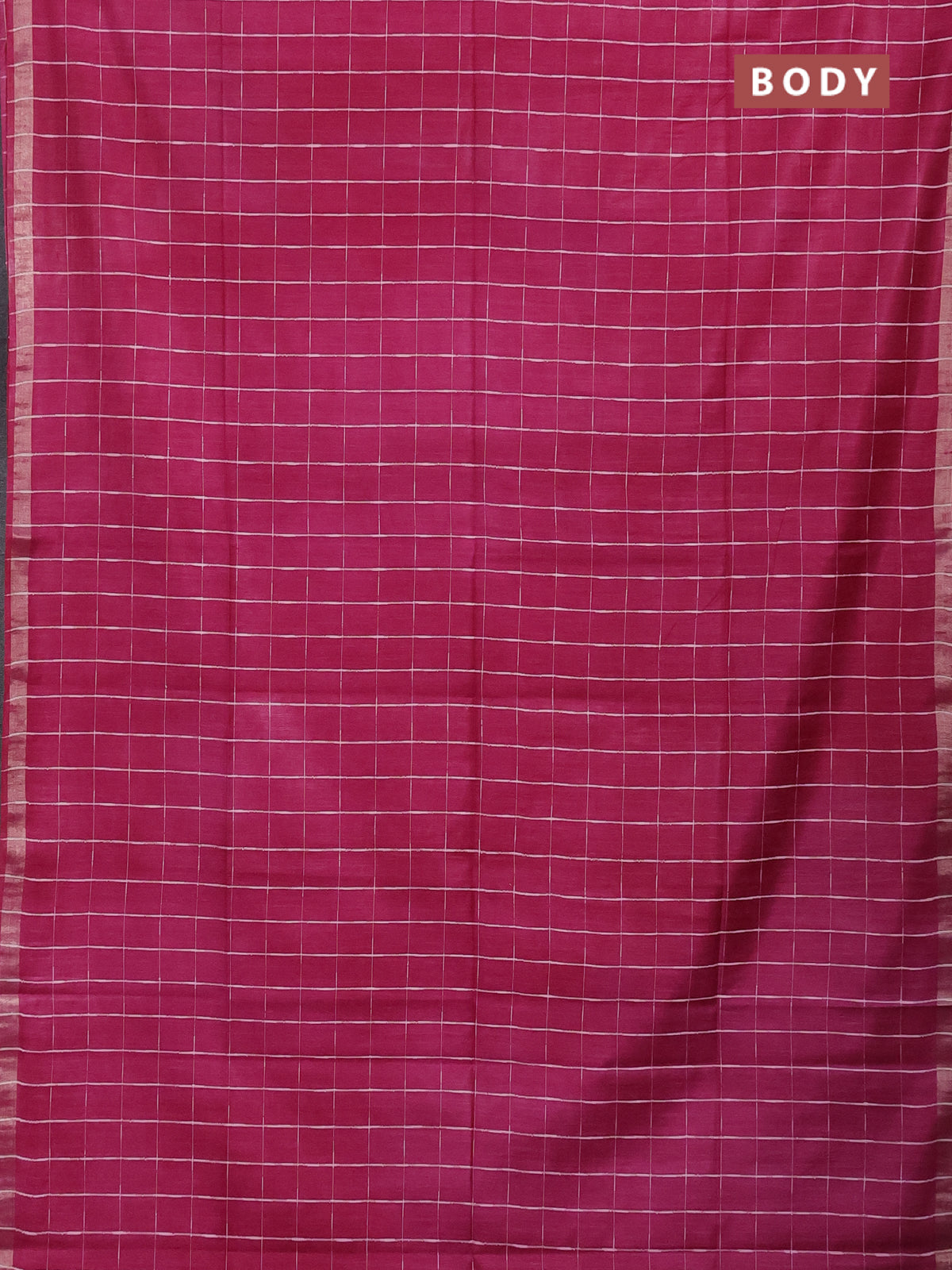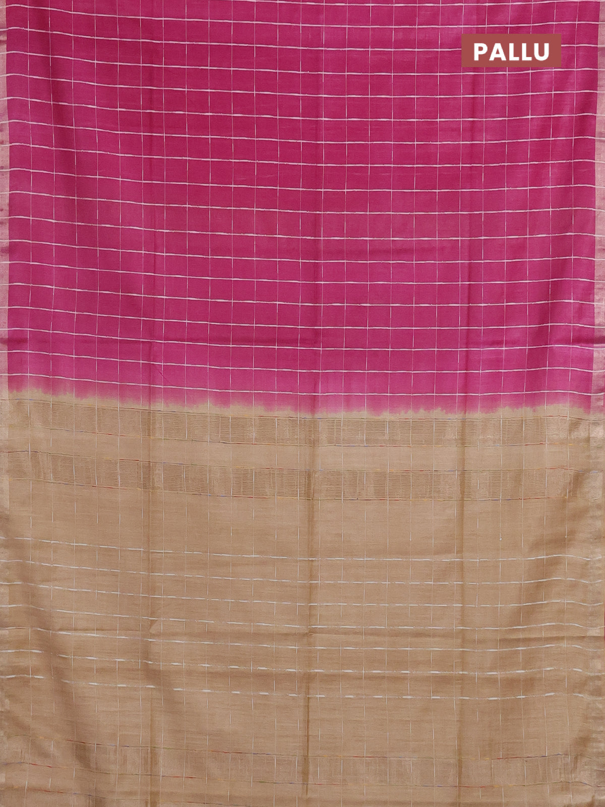 Semi bamboo saree magenta pink and sandal with checked pattern and zari woven border