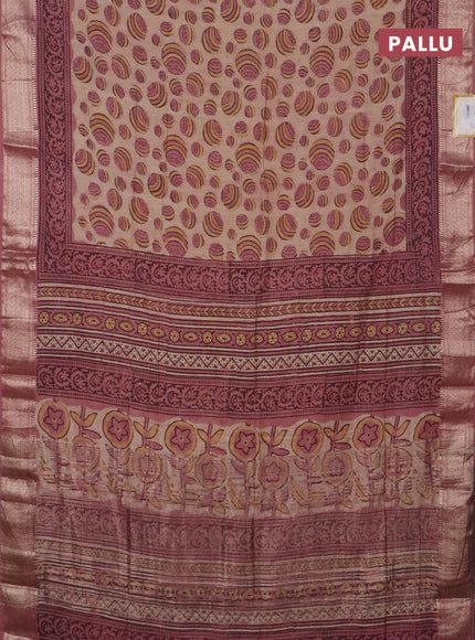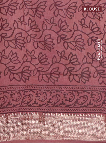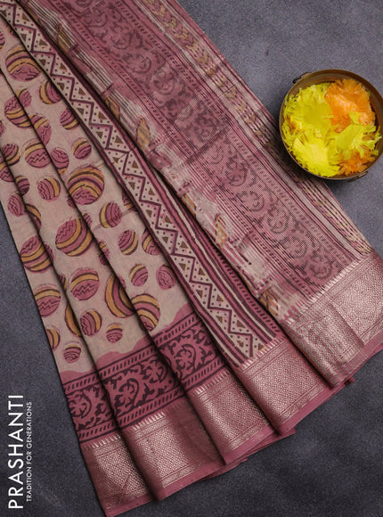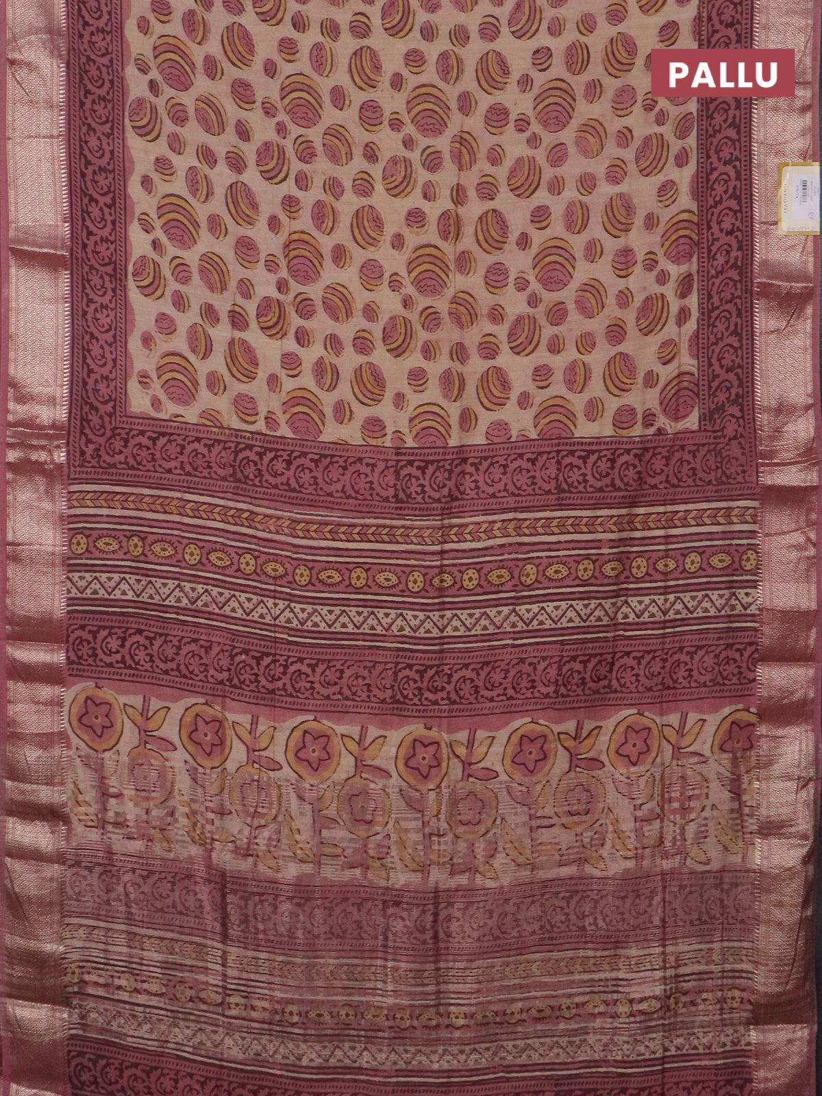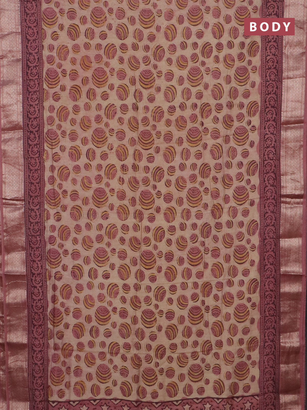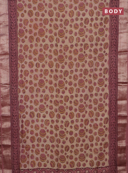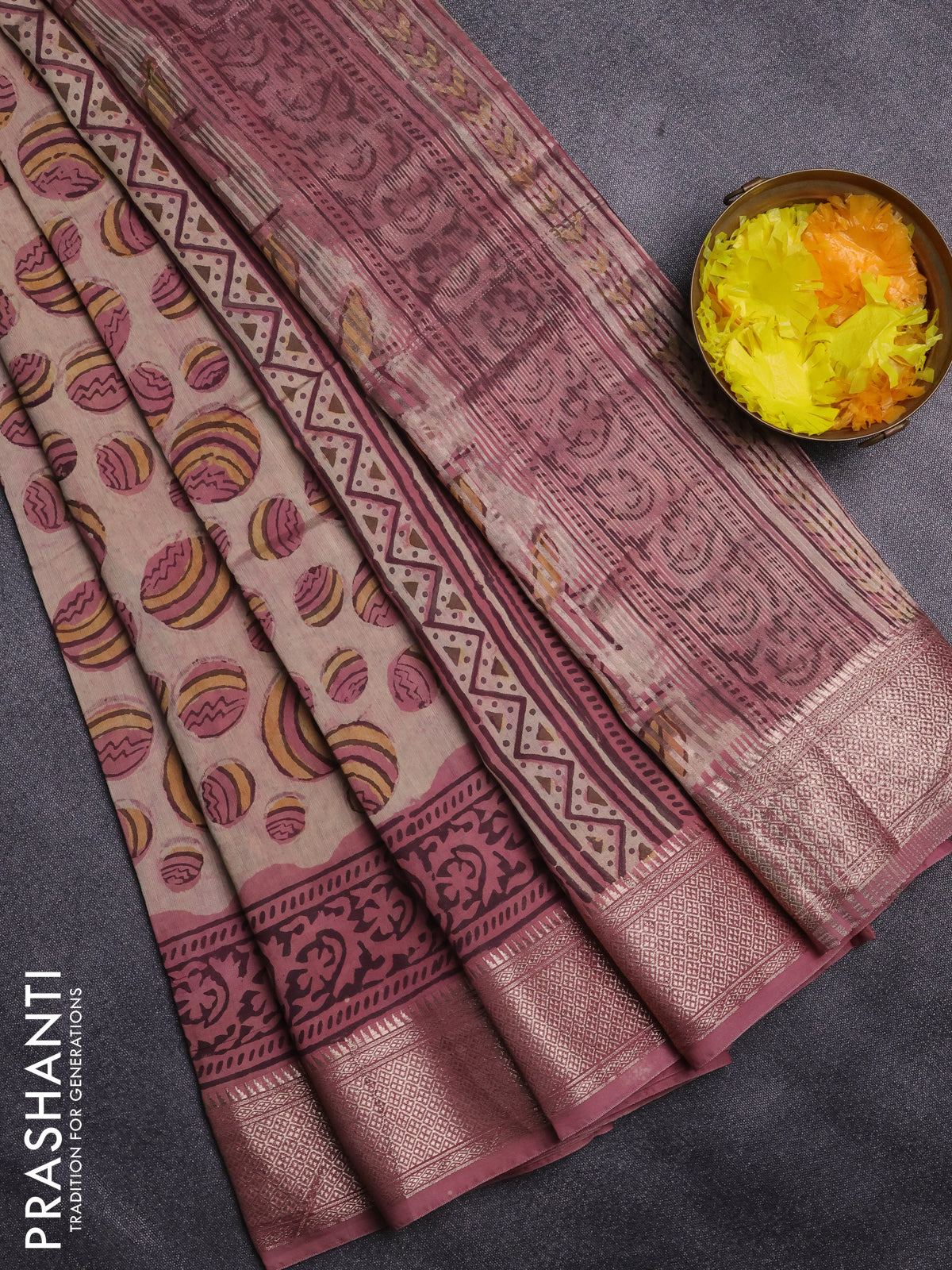 Semi chanderi partly saree sandal and pastel pink with allover vanaspathi prints and zari woven border