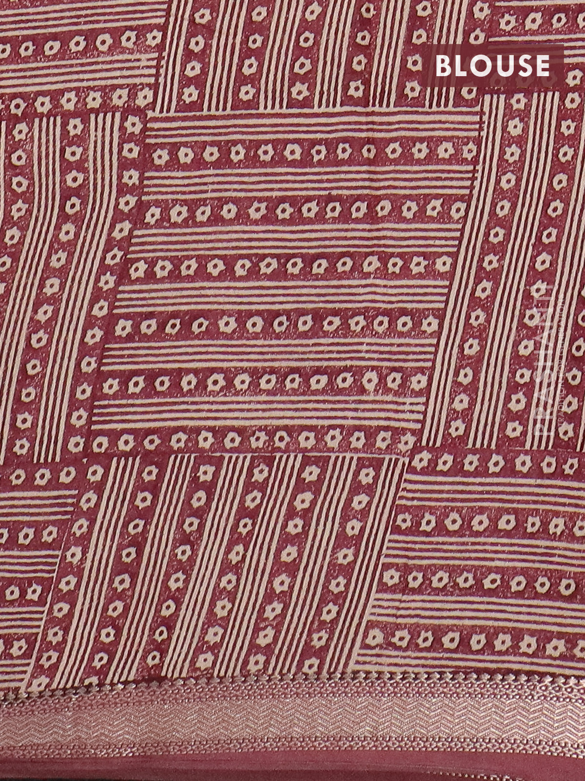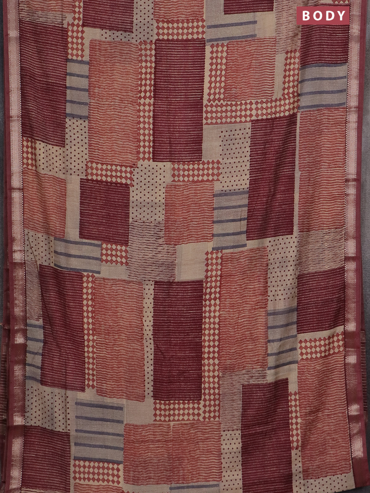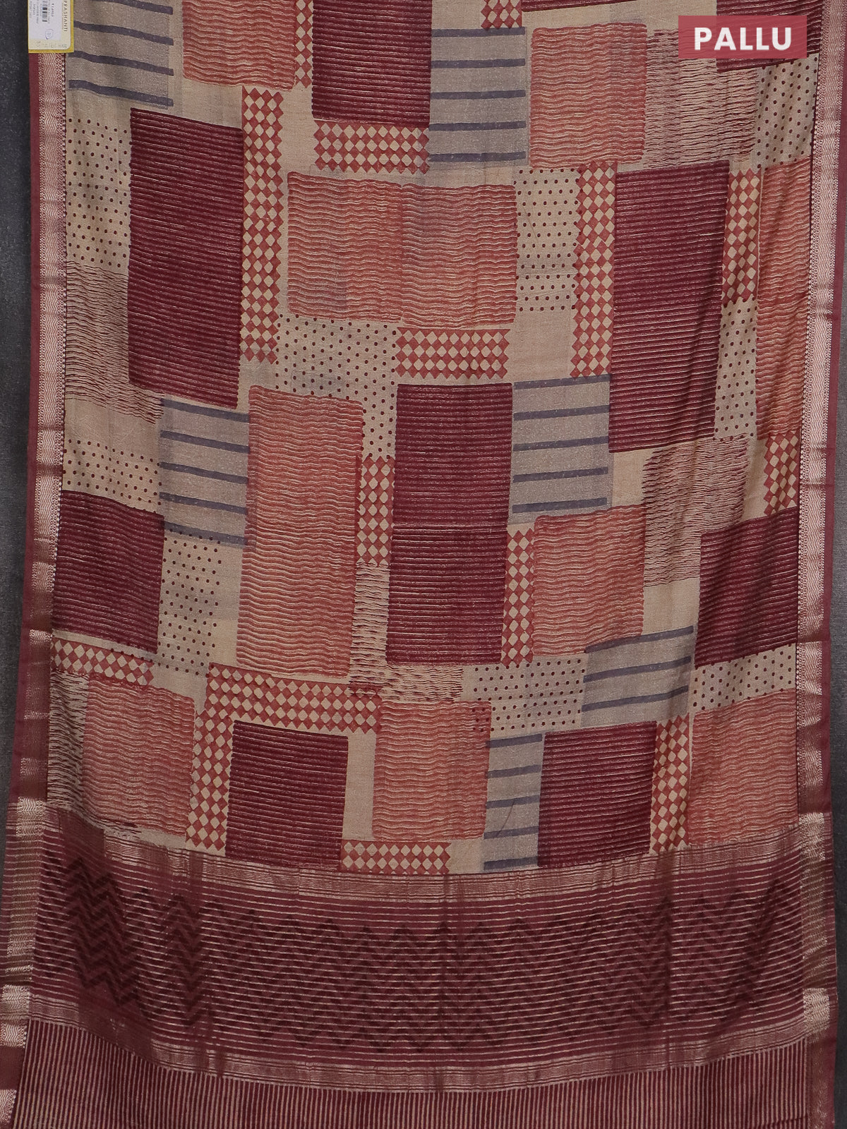 Semi chanderi saree beige and maroon with geometric prints and zari woven border