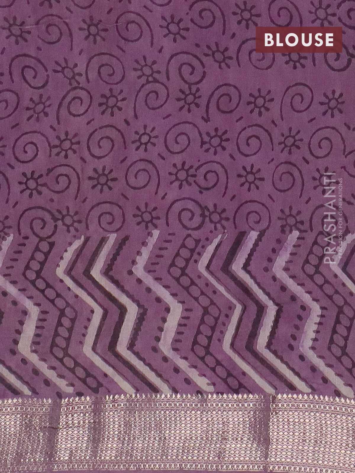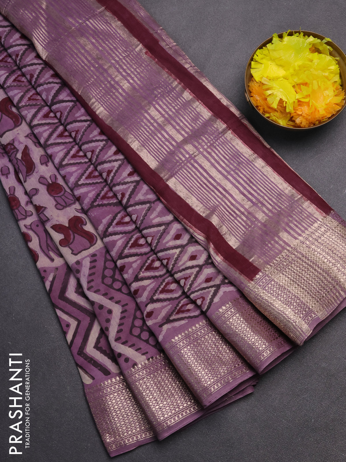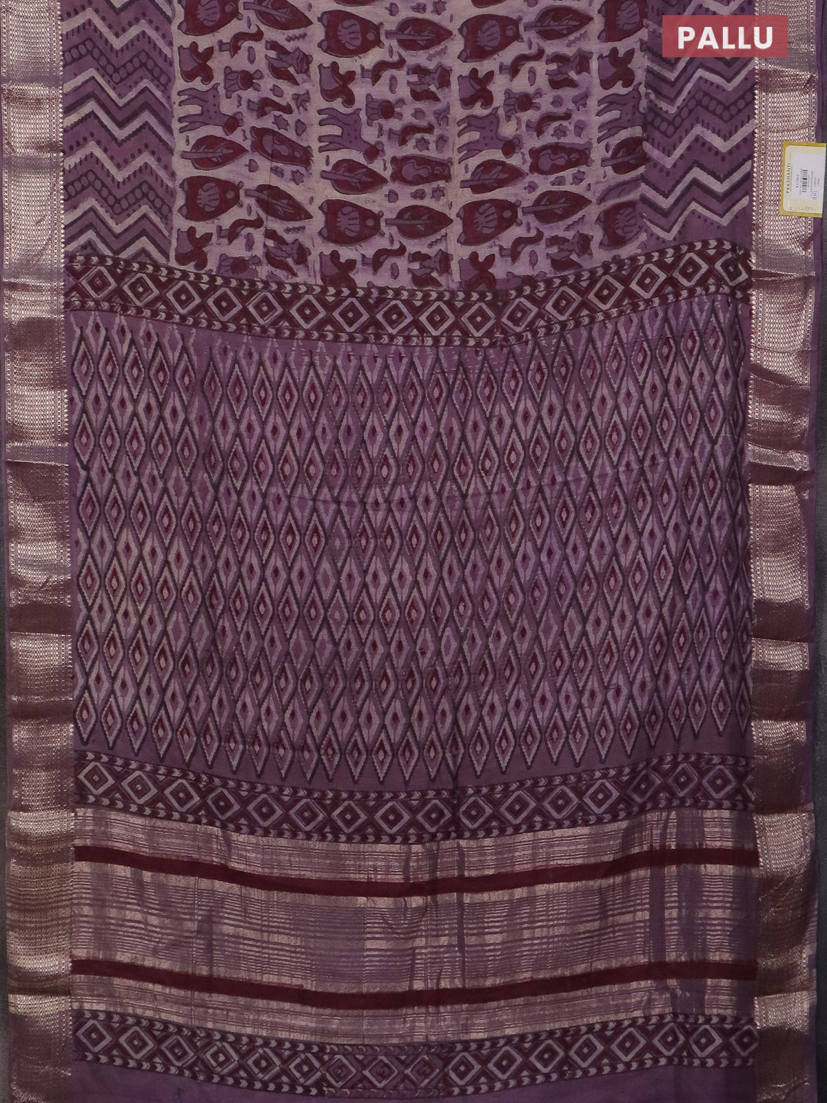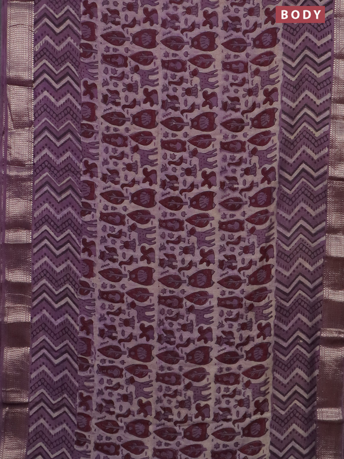 Semi chanderi saree beige and pastel purple with allover vanaspathi prints and zari woven border
