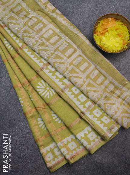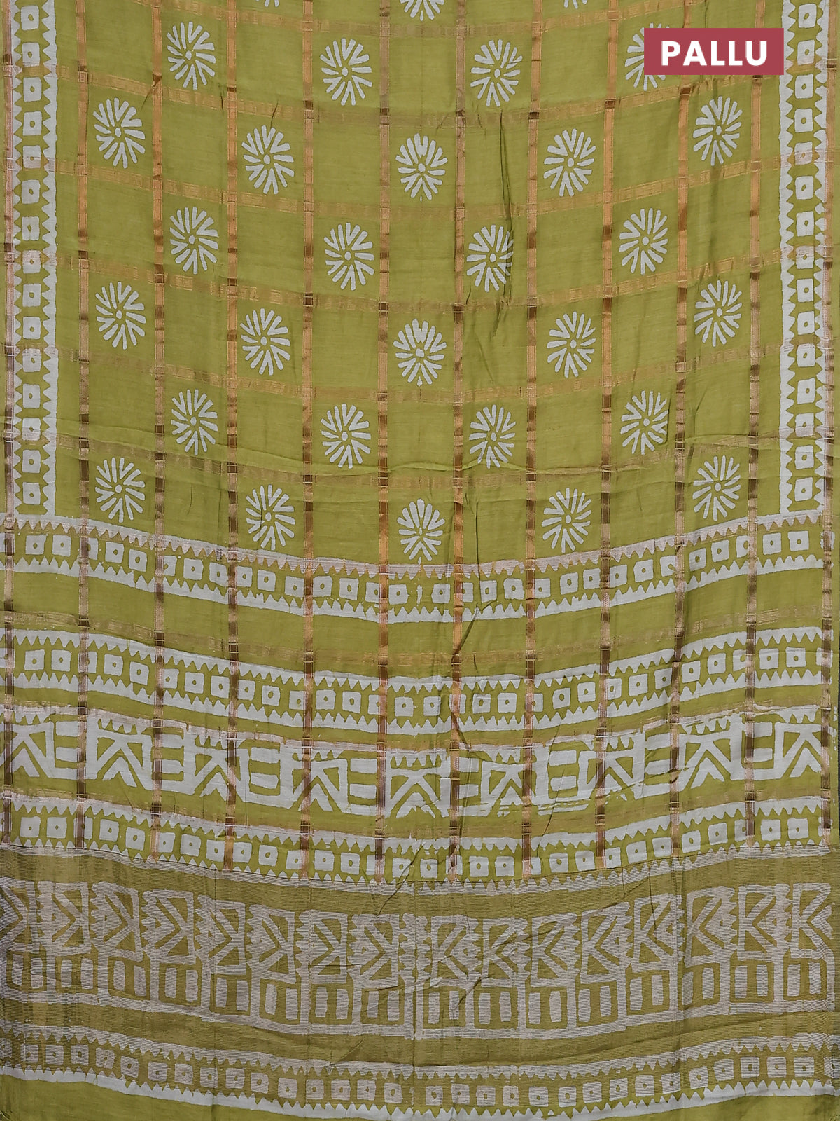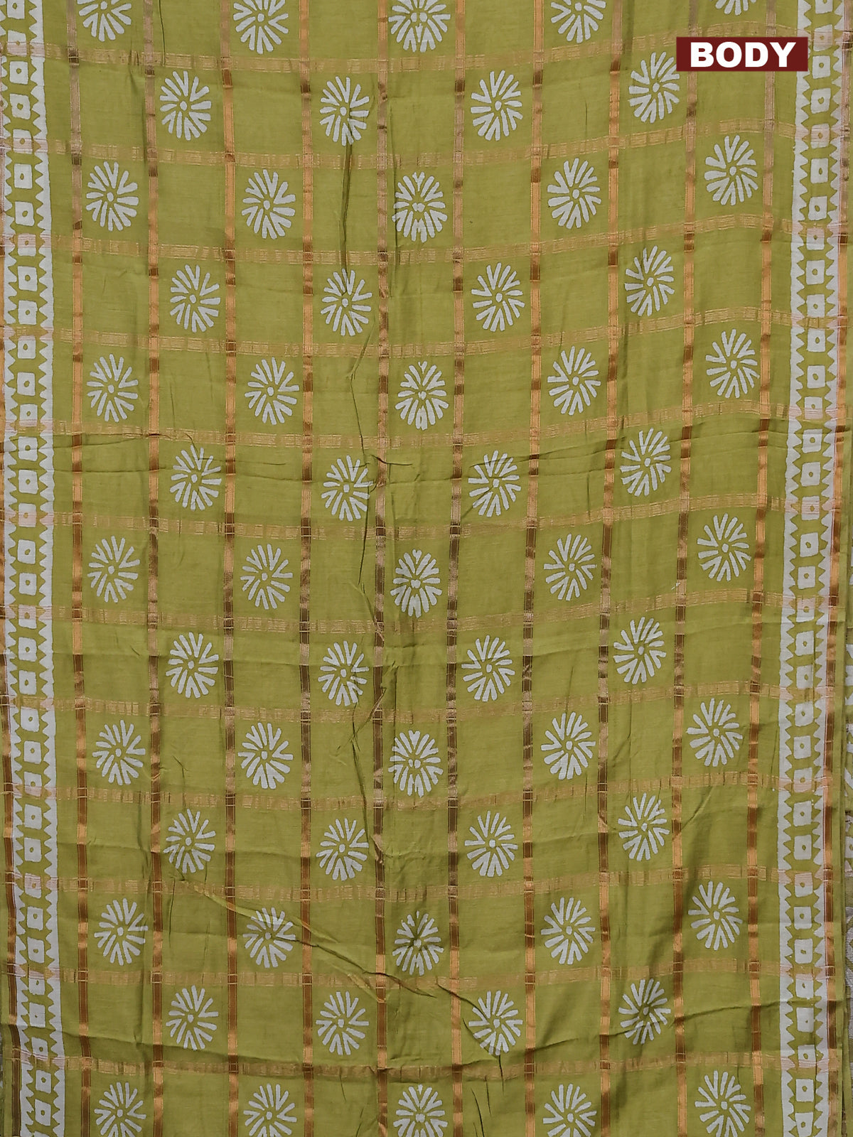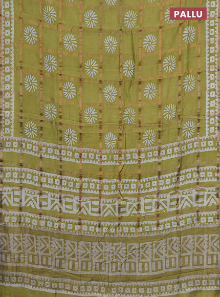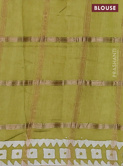 Semi chanderi saree elaichi green and off white with allover zari checks & batik butta prints and printed border