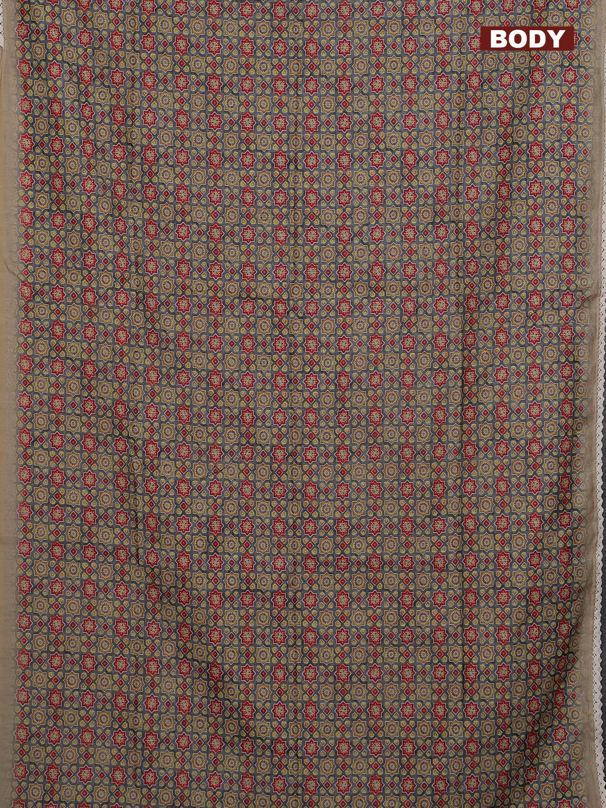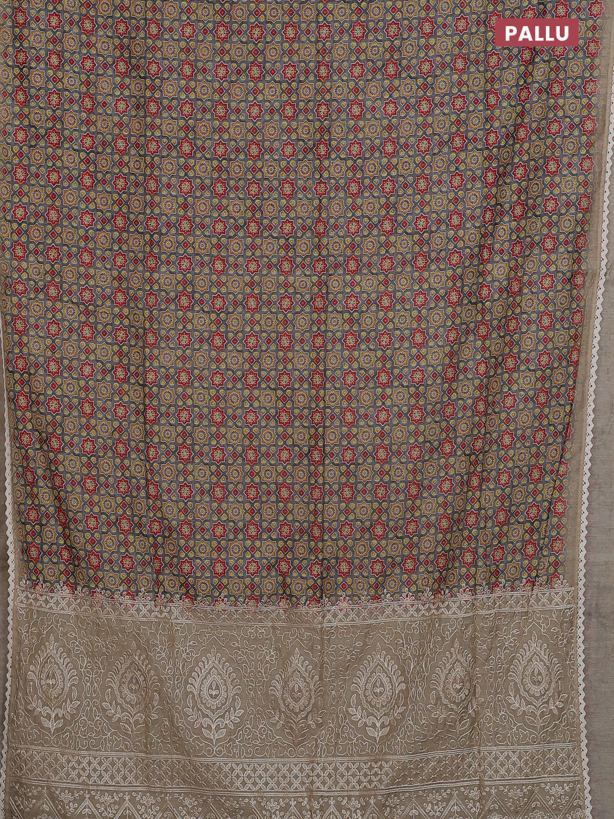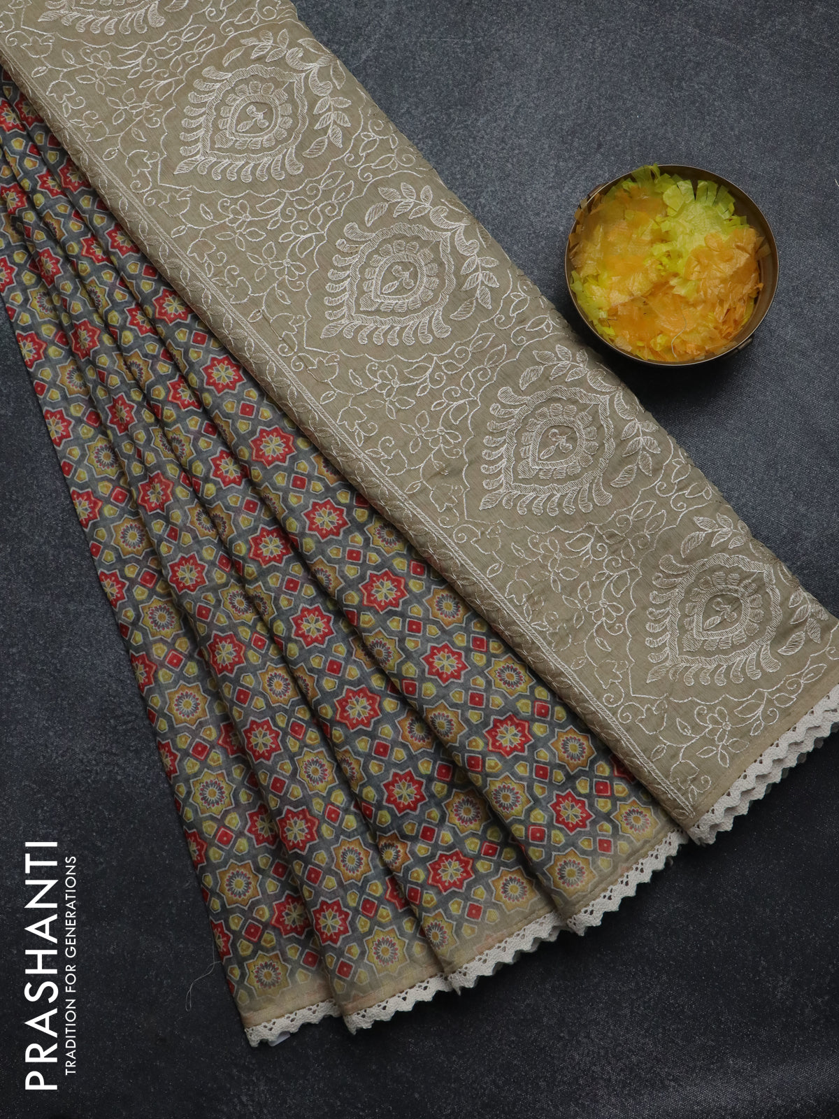 Semi chanderi saree grey and beige with allover ajrakh prints and embroidery pallu