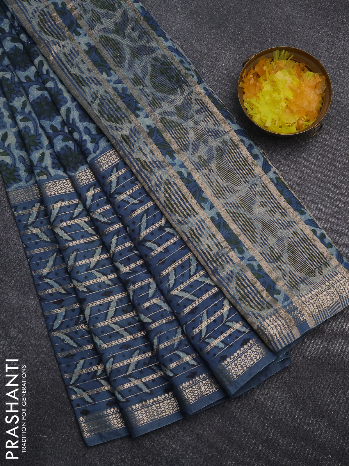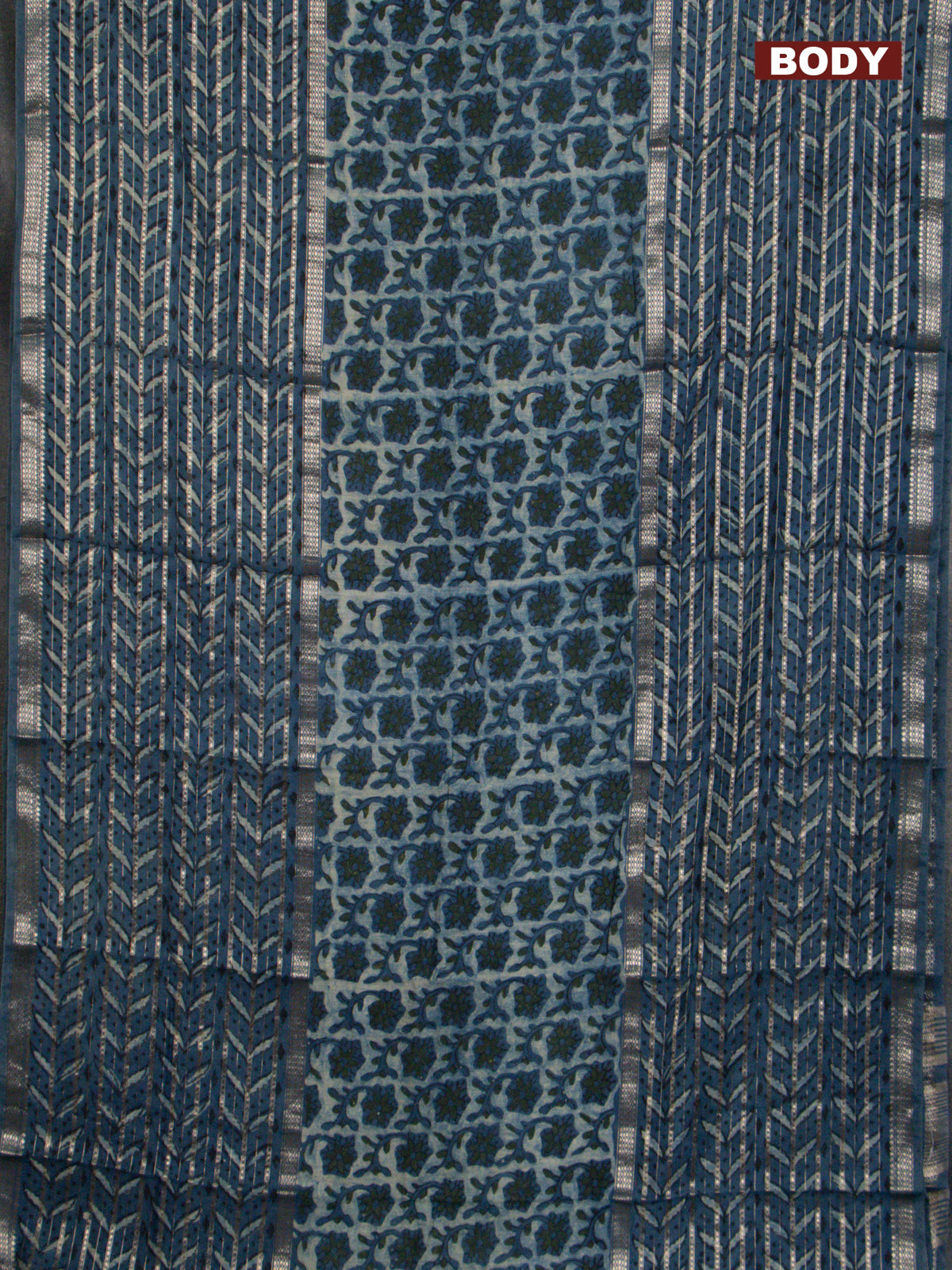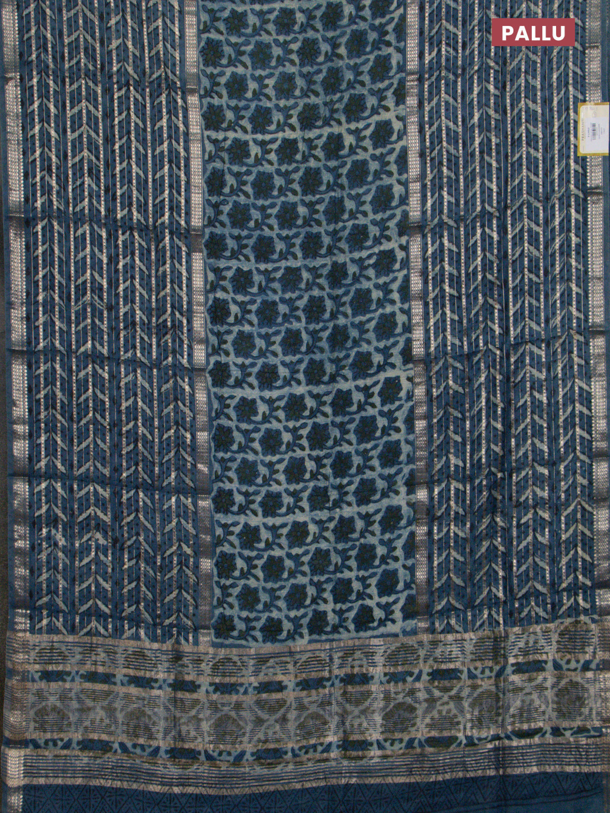 Semi chanderi saree indigo blue with allover ajrakh prints and long printed zari border