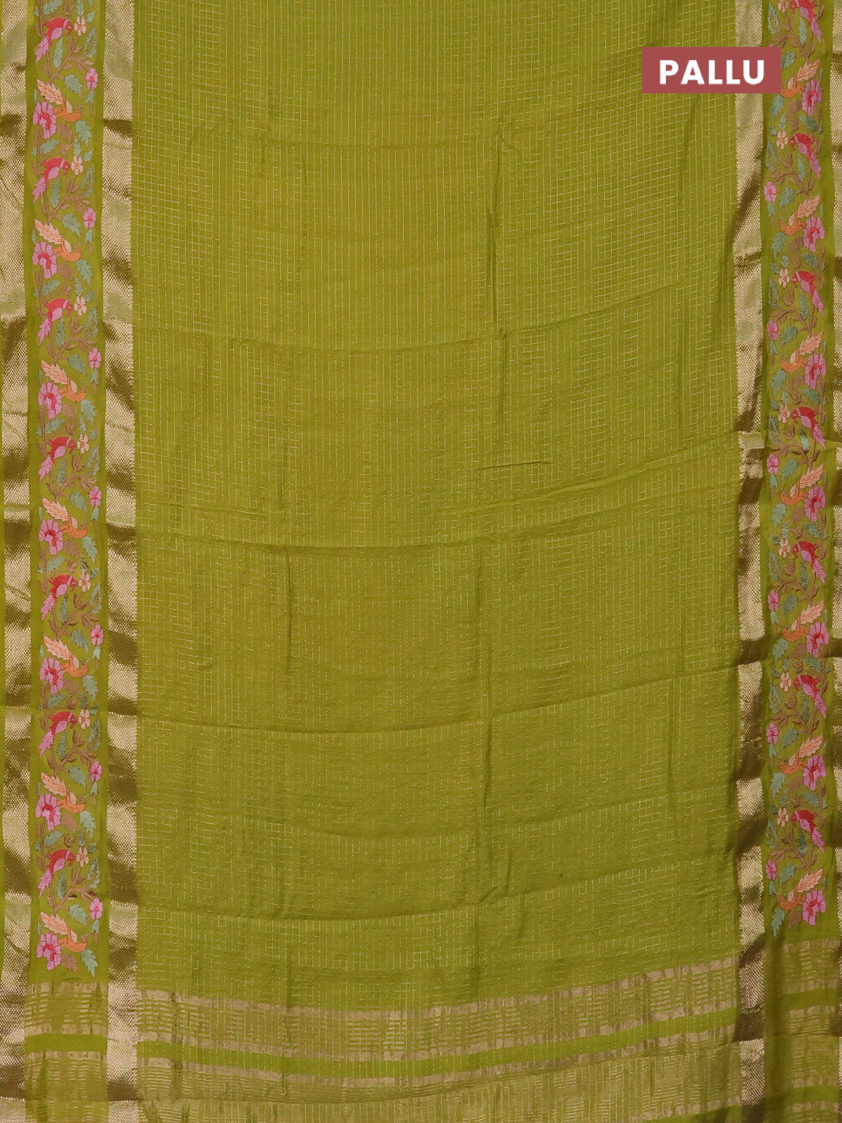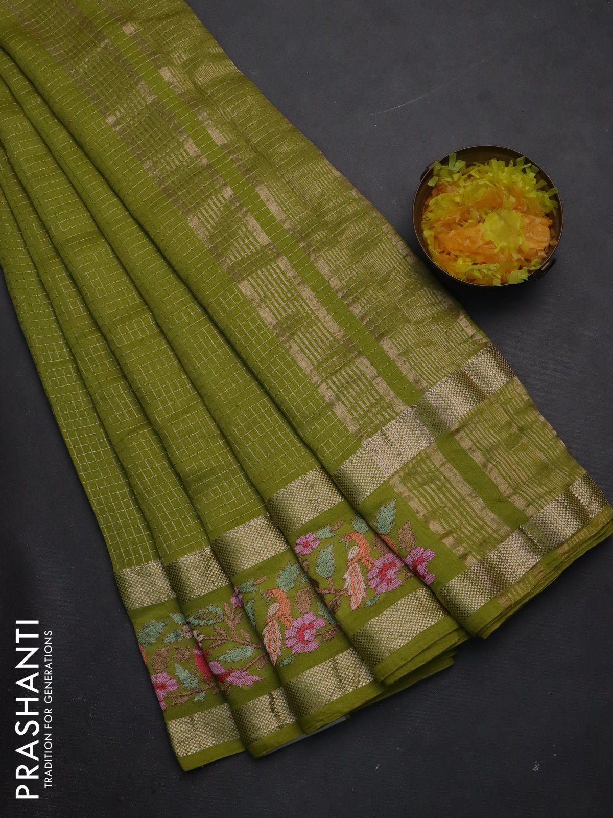 Semi chanderi saree light green with allover zari checked pattern and embroidery border
