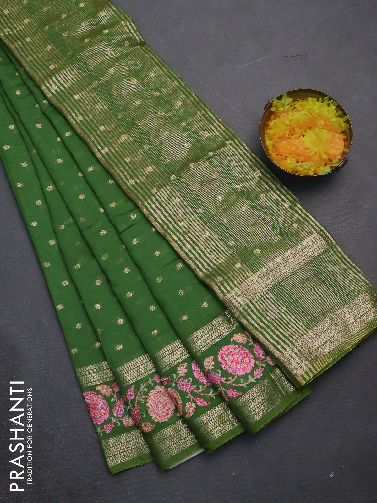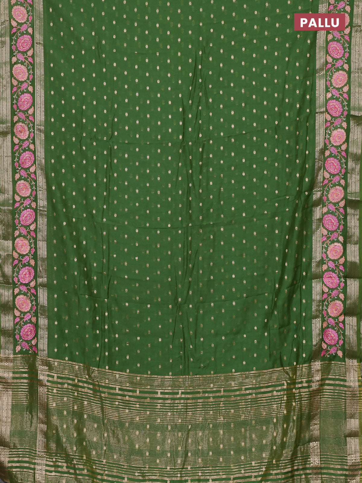 Semi chanderi saree light green with allover zari woven buttas and floral embroidery border