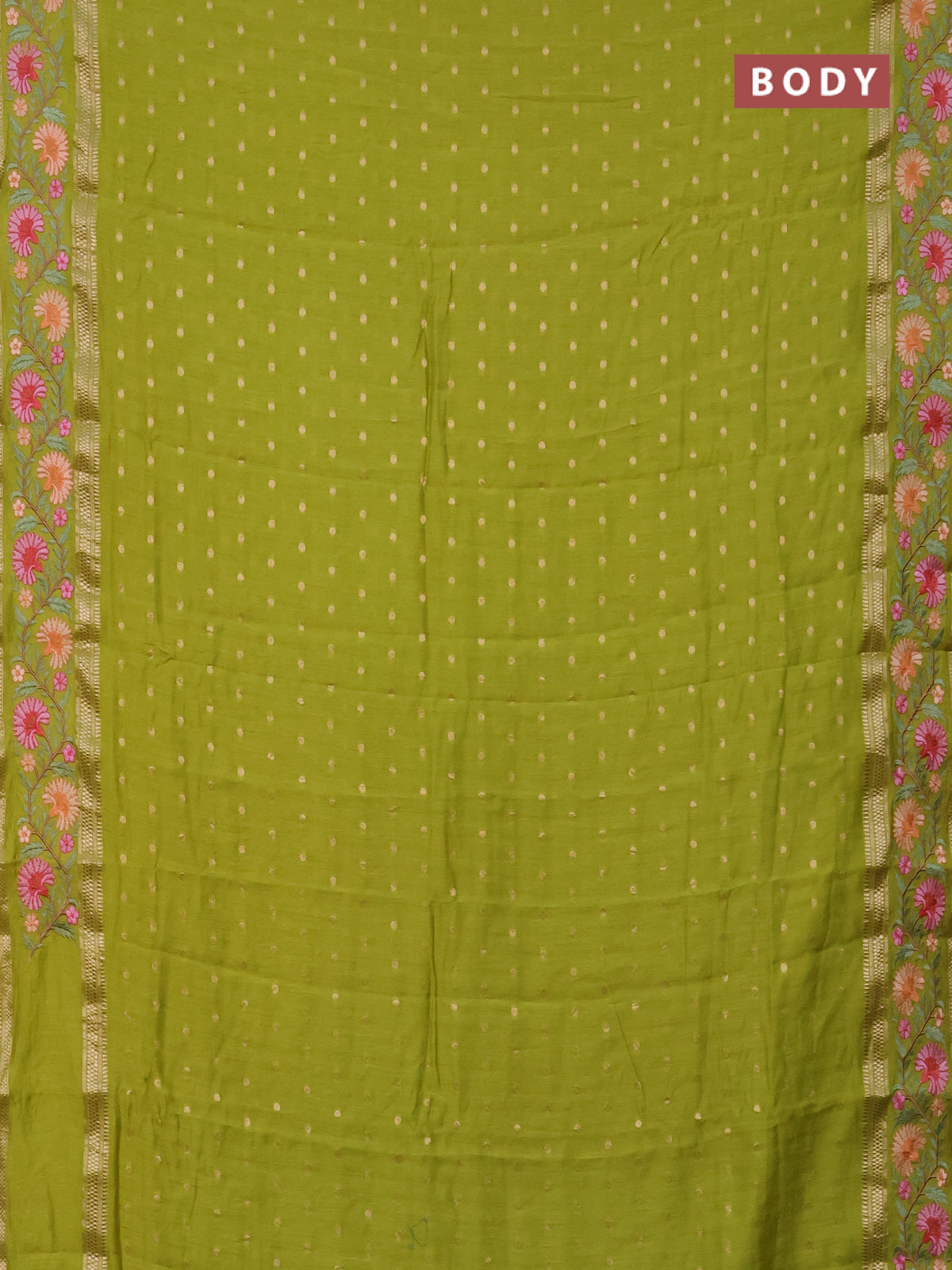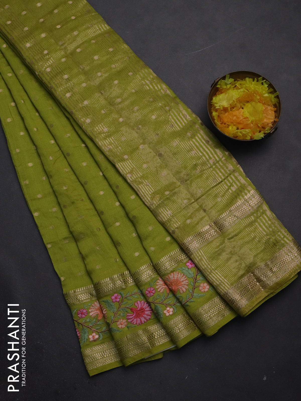 Semi chanderi saree light green with zari woven buttas and floral embroidery border