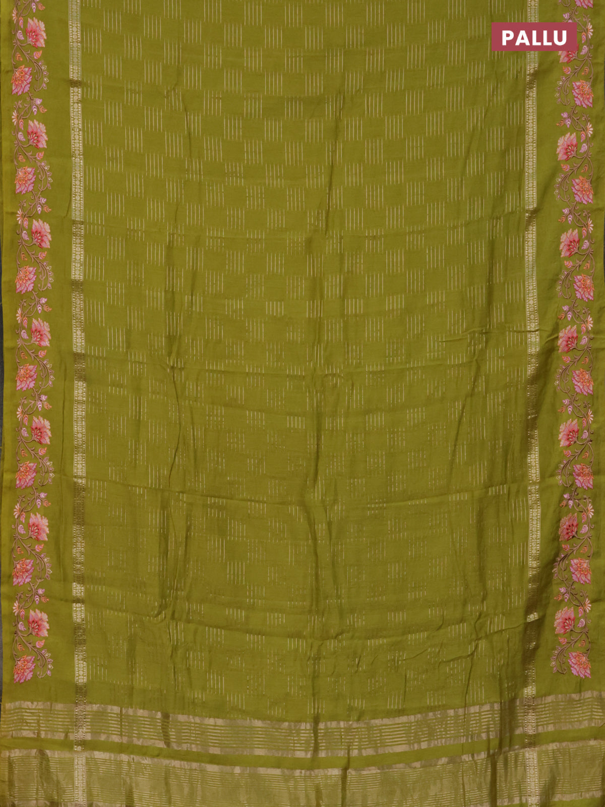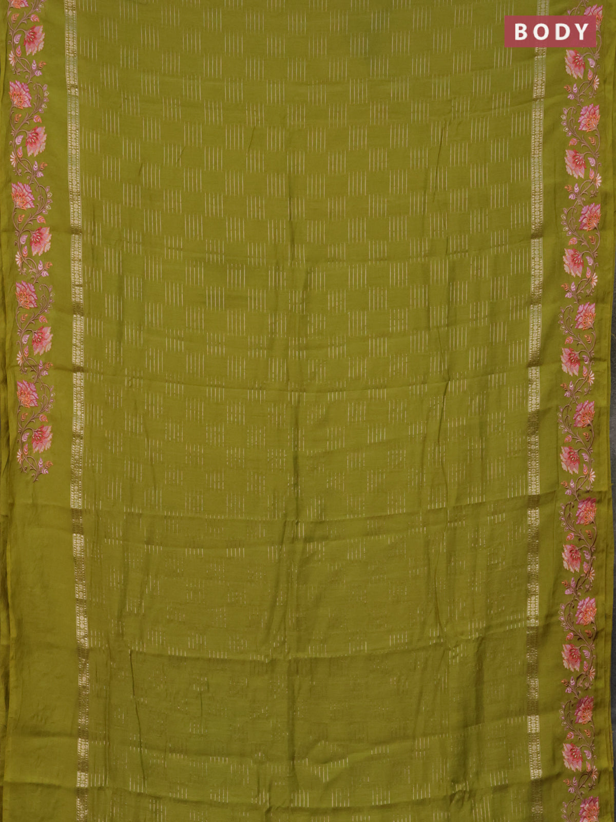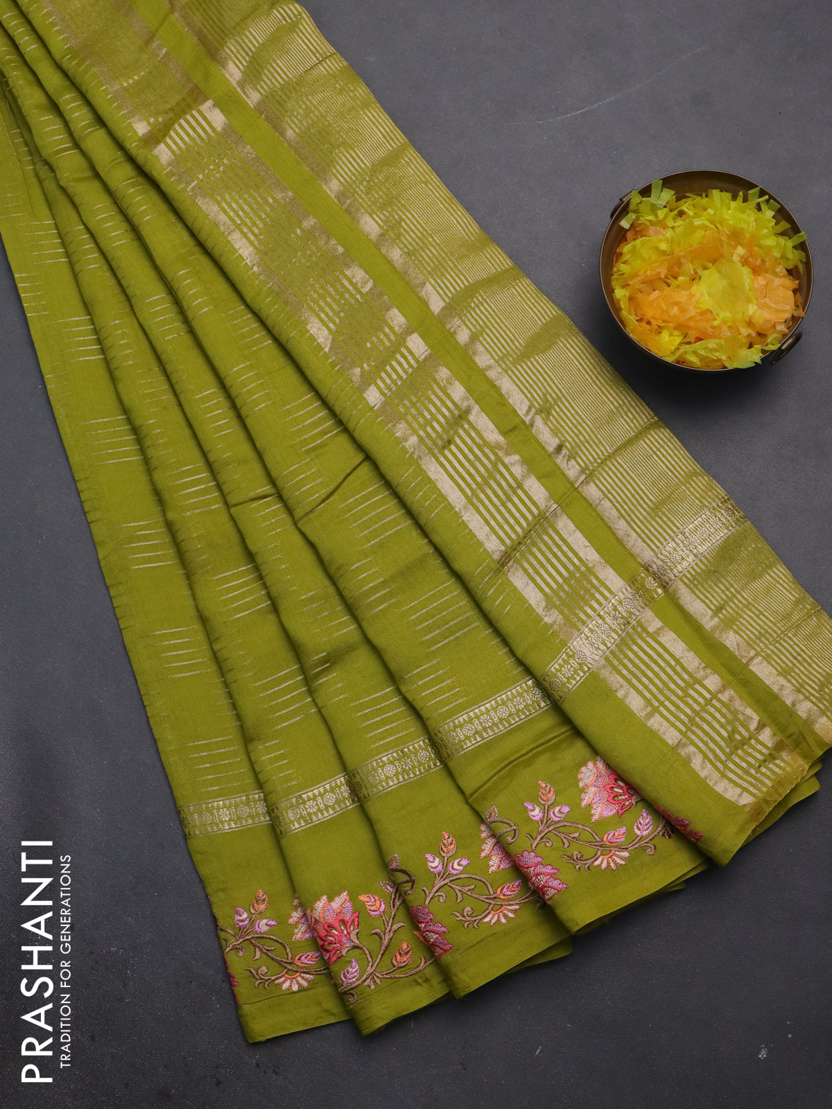 Semi chanderi saree lime green with allover zari woven geometric weaves and floral embroidery border
