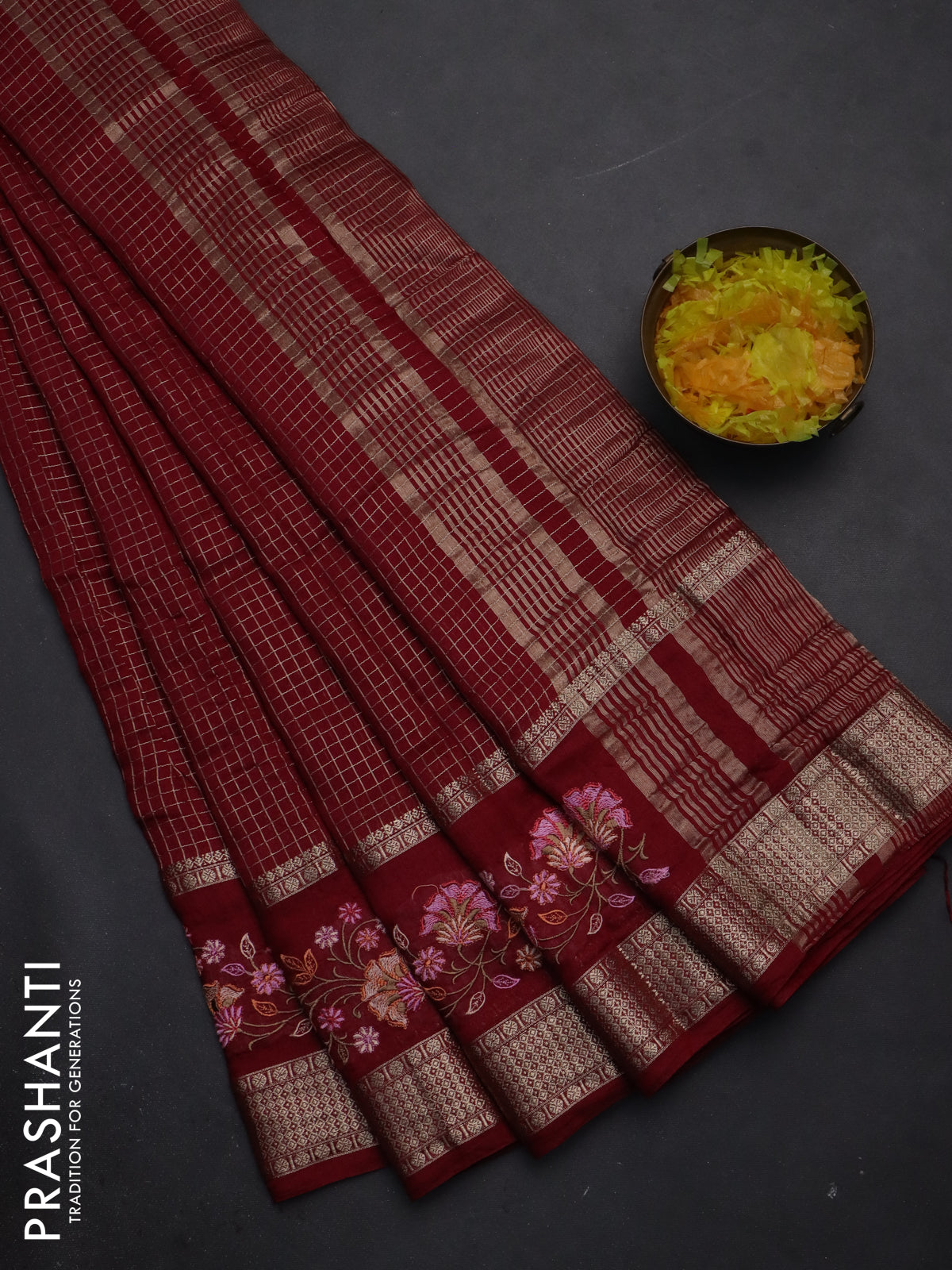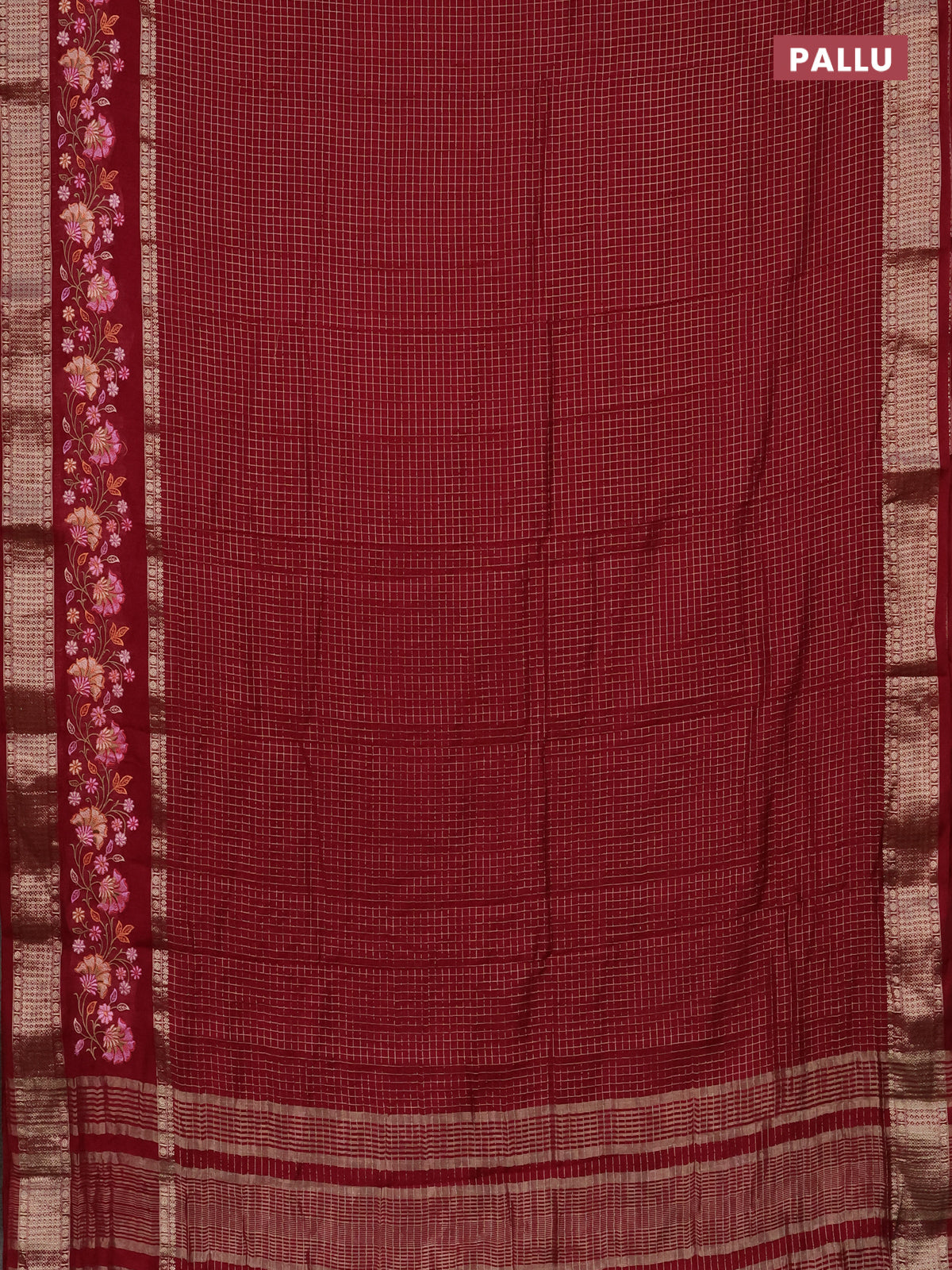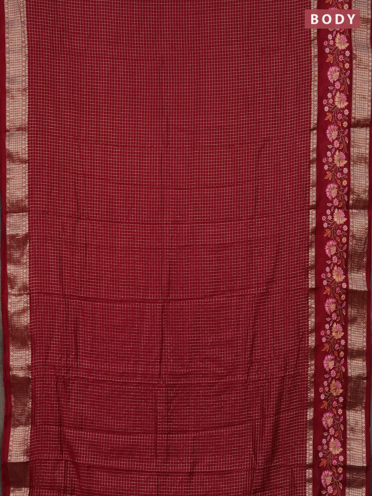Semi chanderi saree maroon with allover zari checked pattern and embroidery border