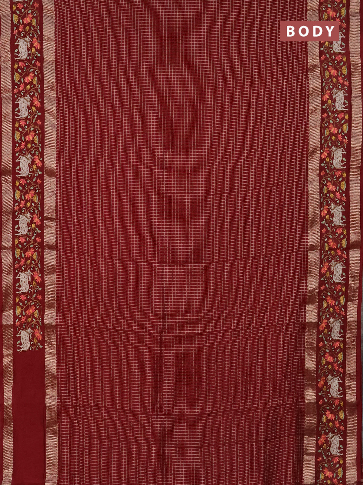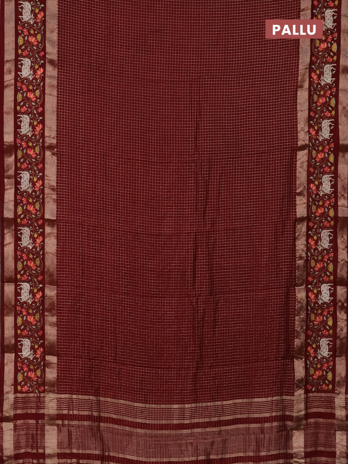 Semi chanderi saree maroon with allover zari checked pattern and pichwai embroidery border