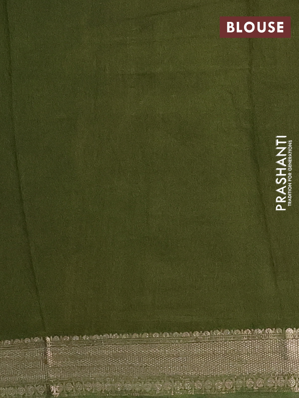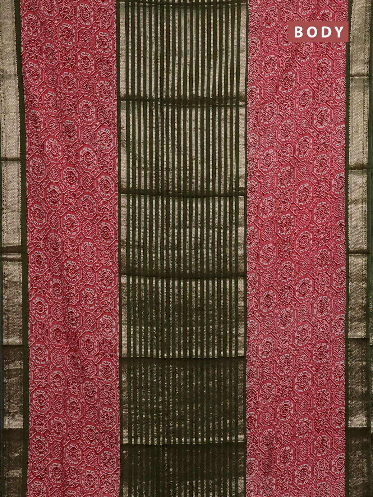 Semi chanderi saree mehendi green and pink with zari weaves and long ajrakh printed zari border