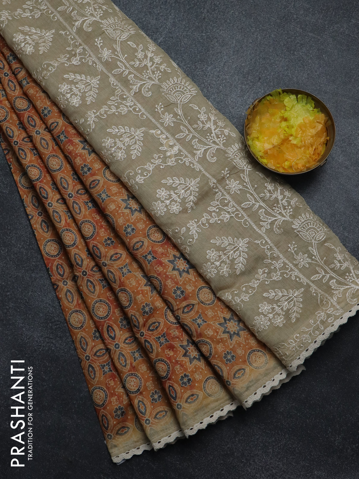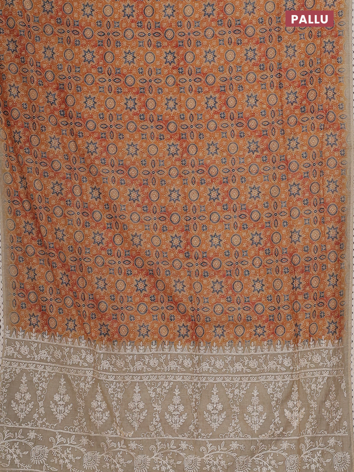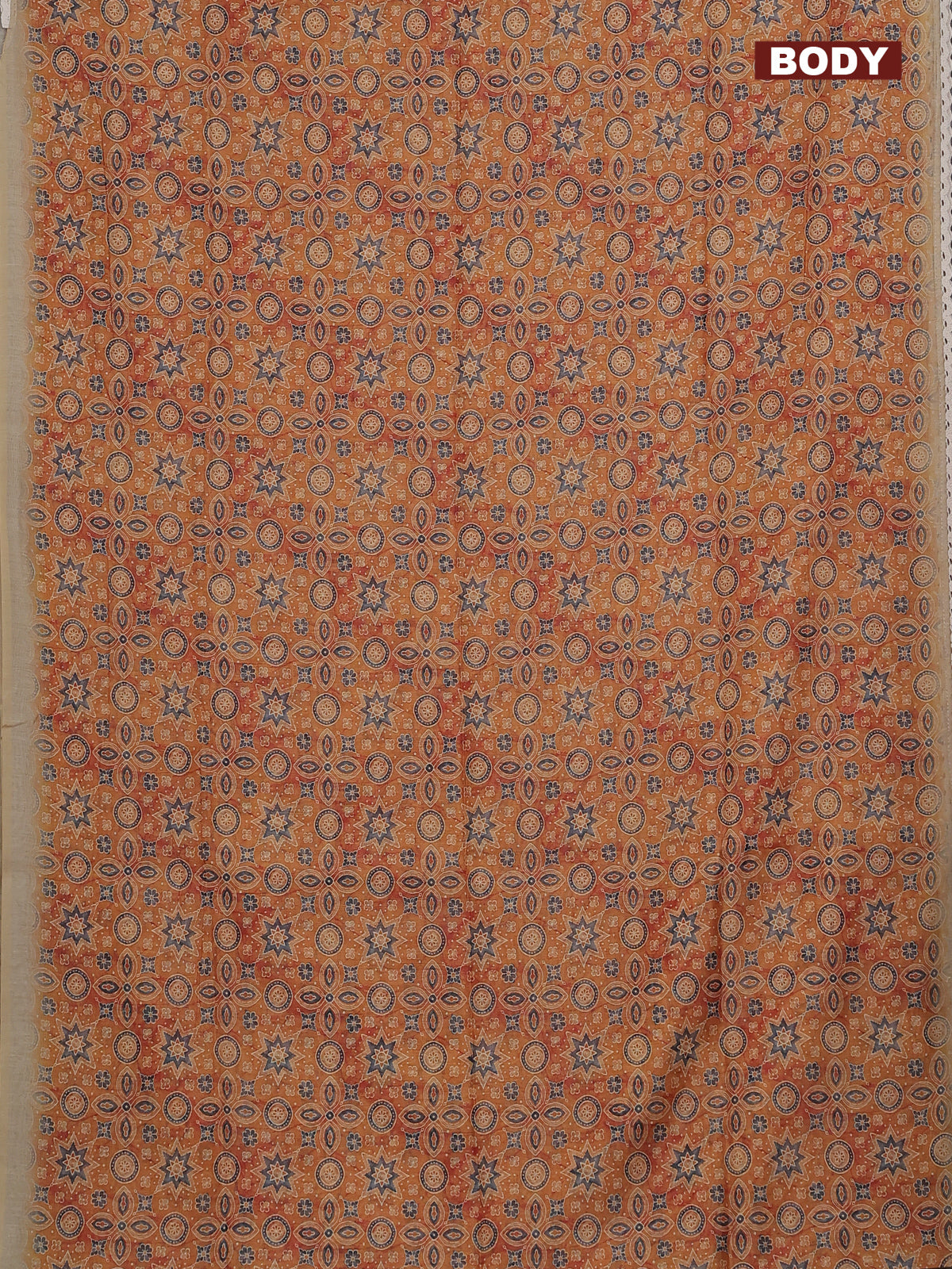 Semi chanderi saree mustard yellow and beige with allover ajrakh prints and embroidery pallu