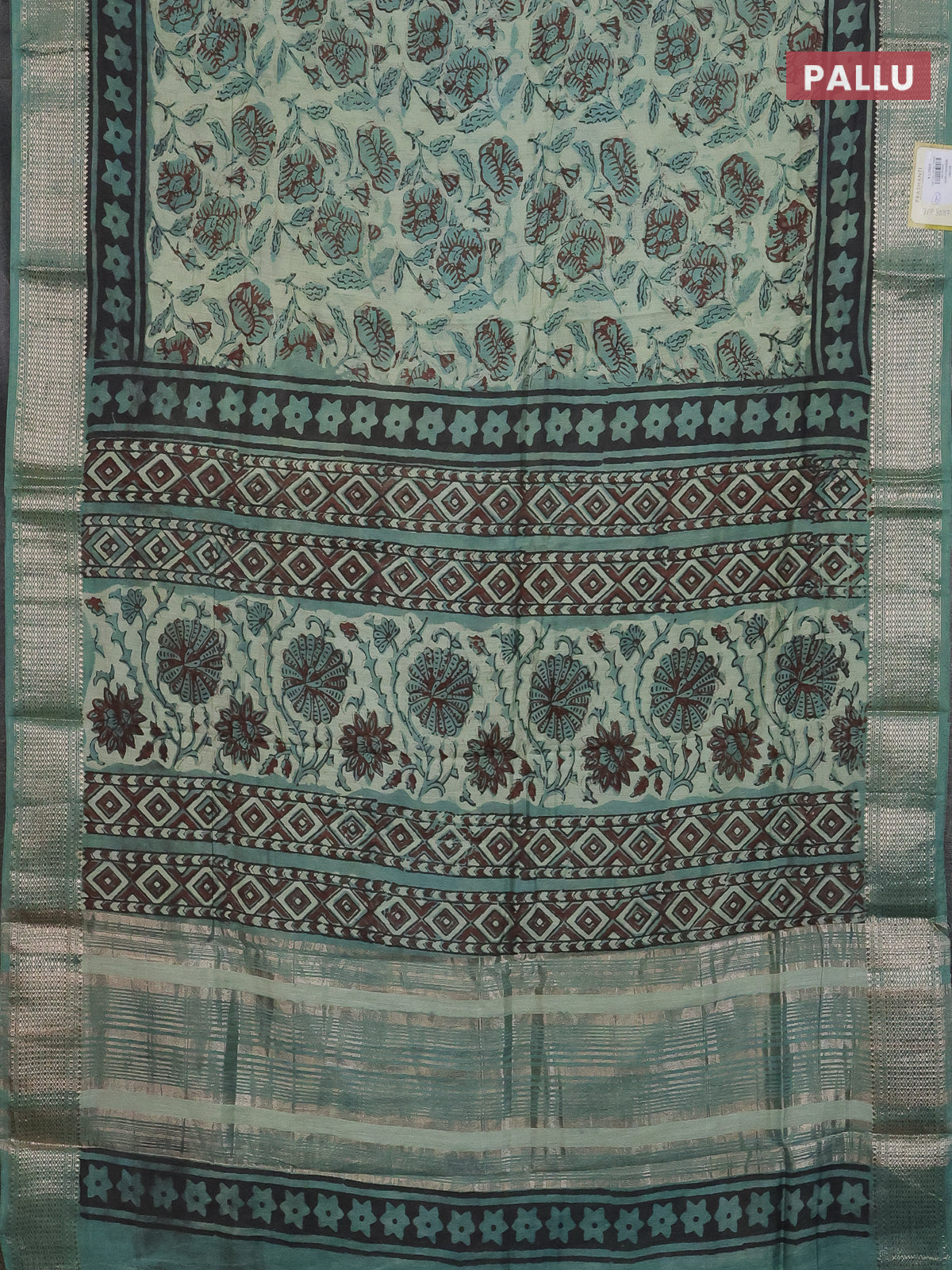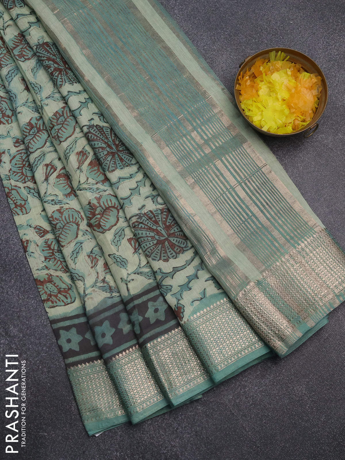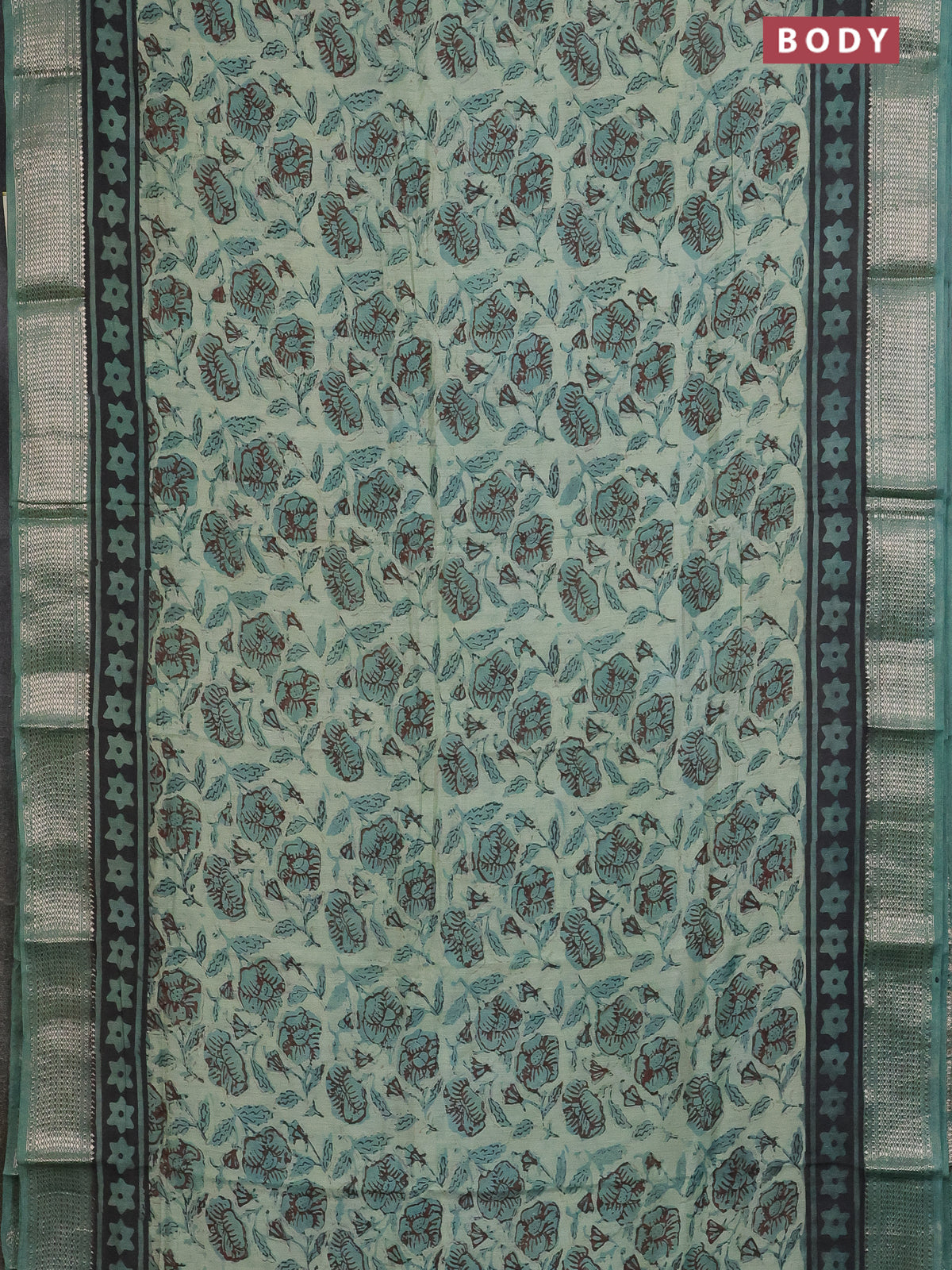 Semi chanderi saree pastel green and teal green shade with allover kalamkari prints and zari woven border