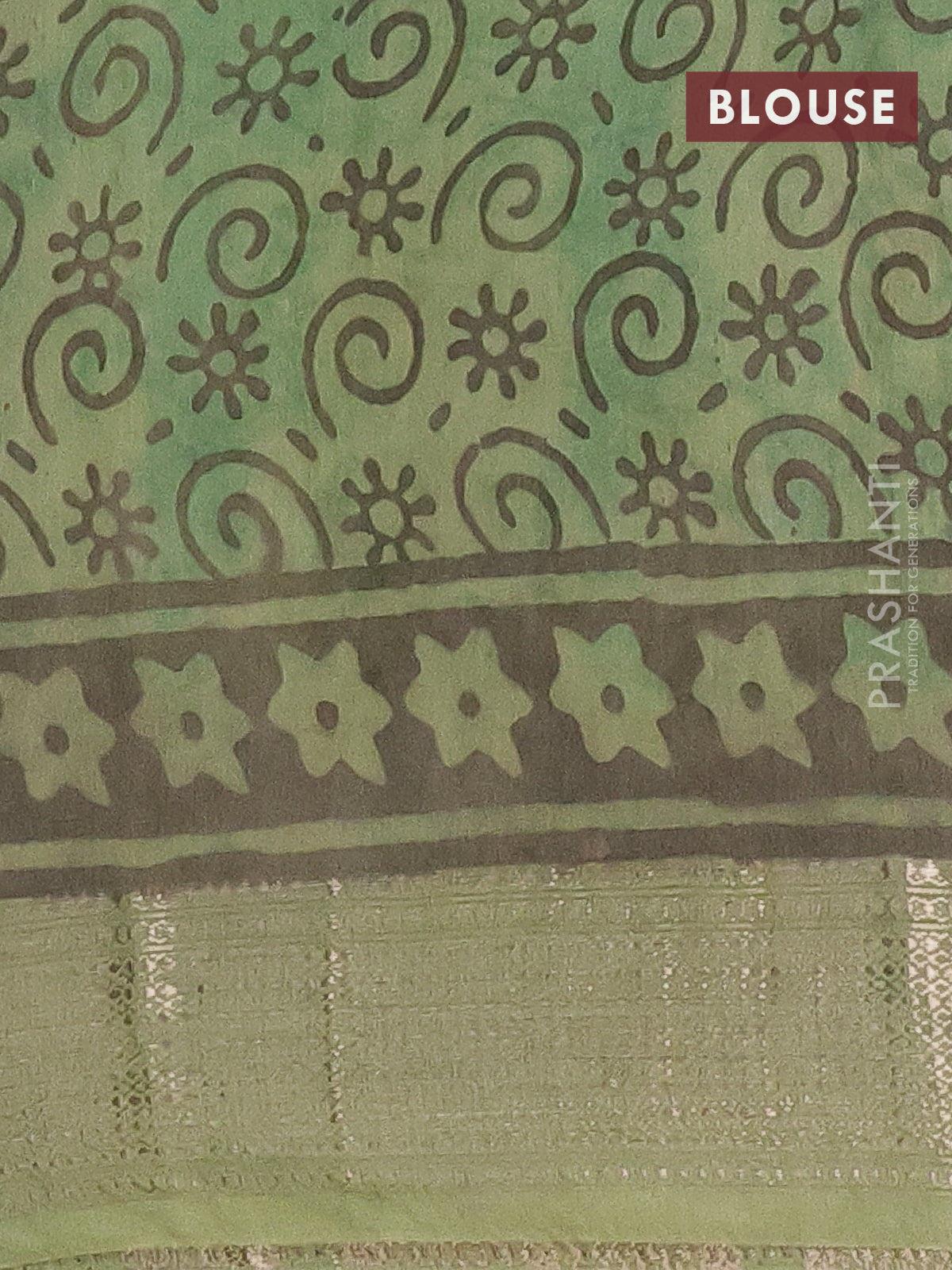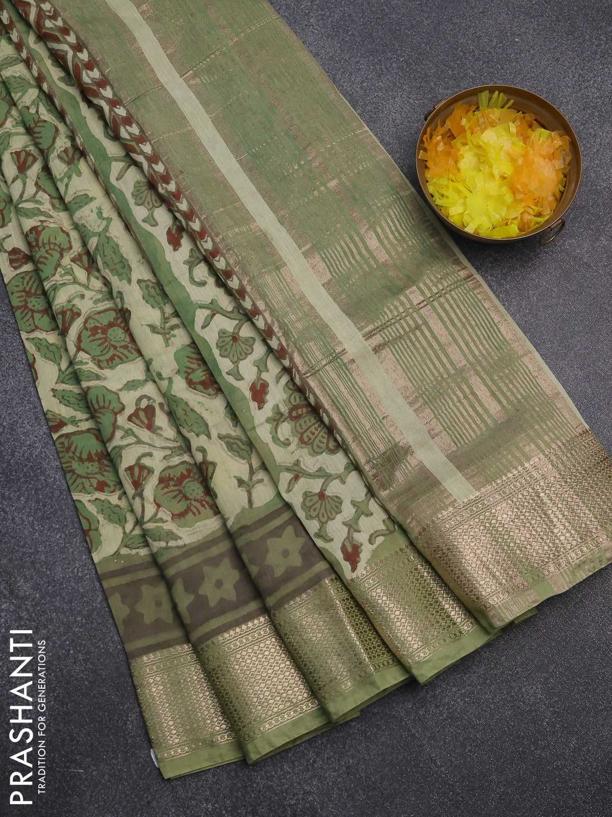 Semi chanderi saree pista green and green with allover kalamkari prints and zari woven border