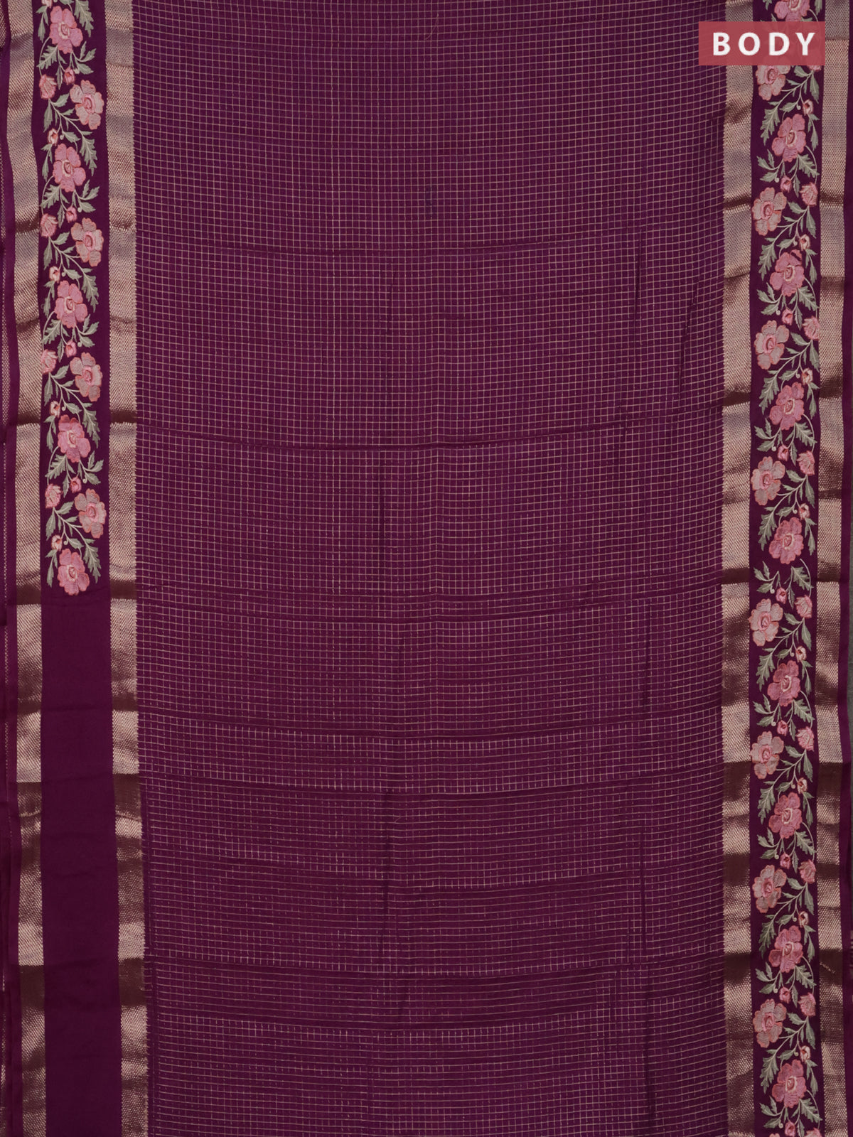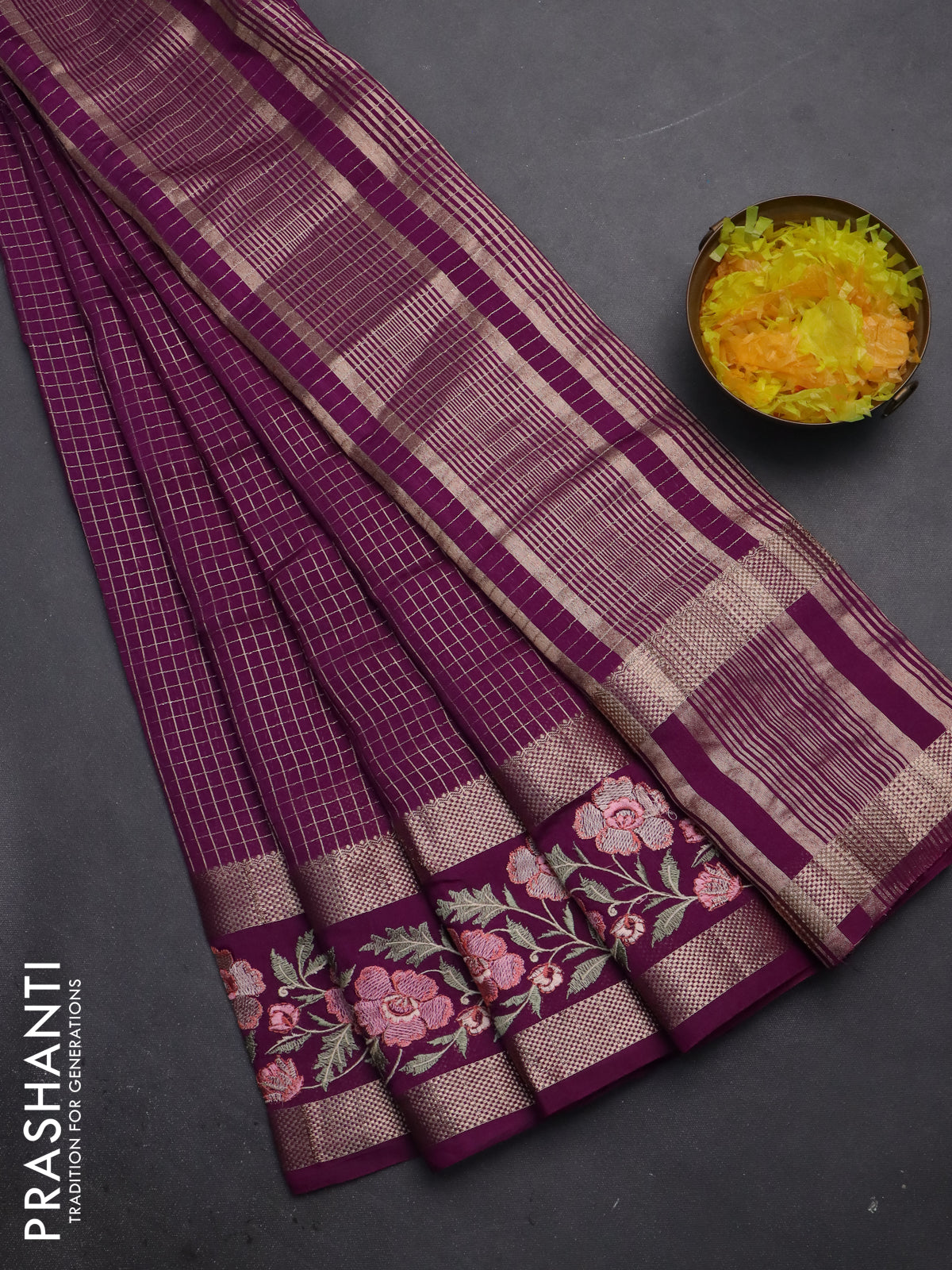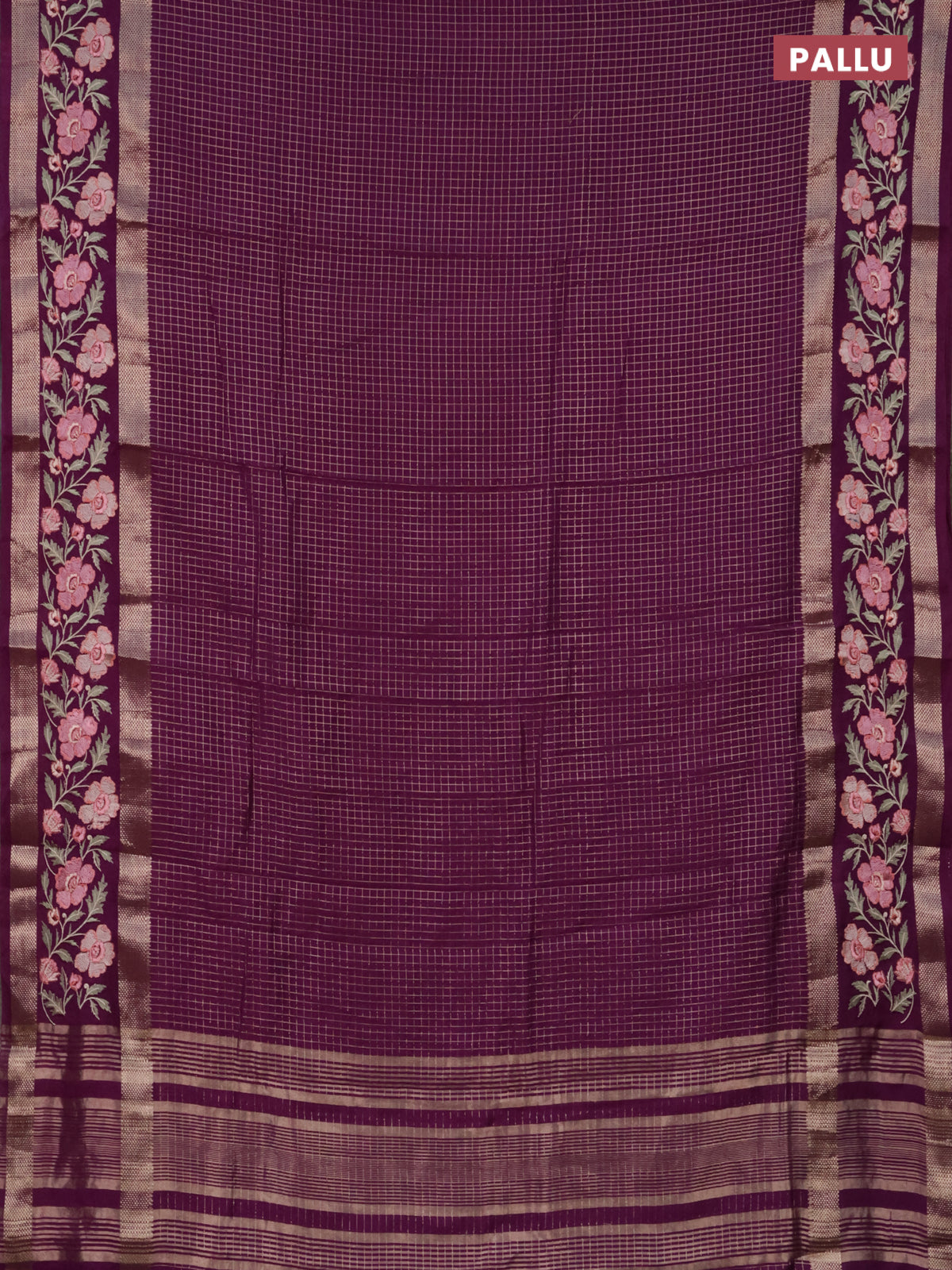 Semi chanderi saree purple with allover zari checked pattern and floral embroidery border