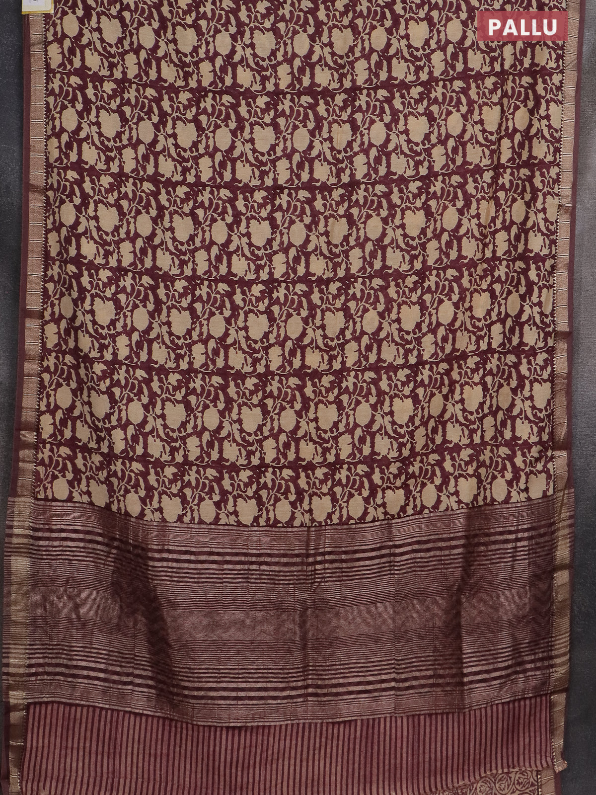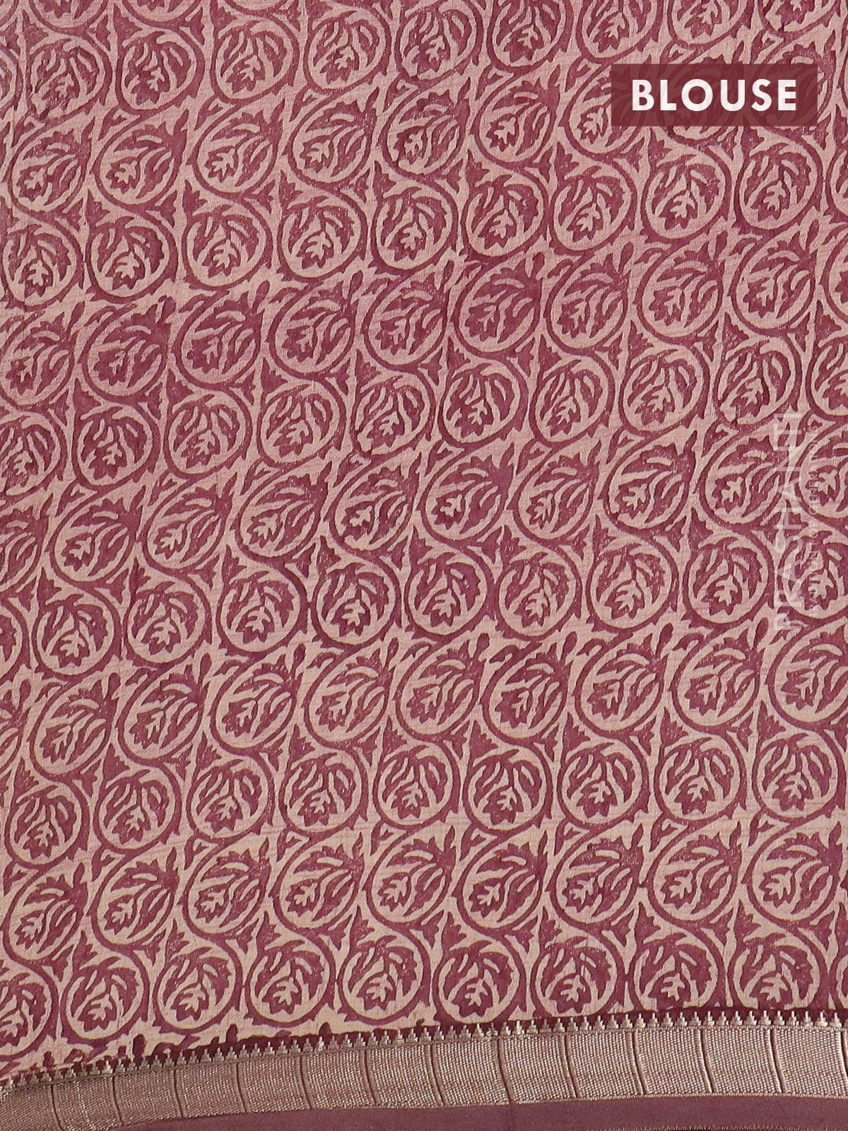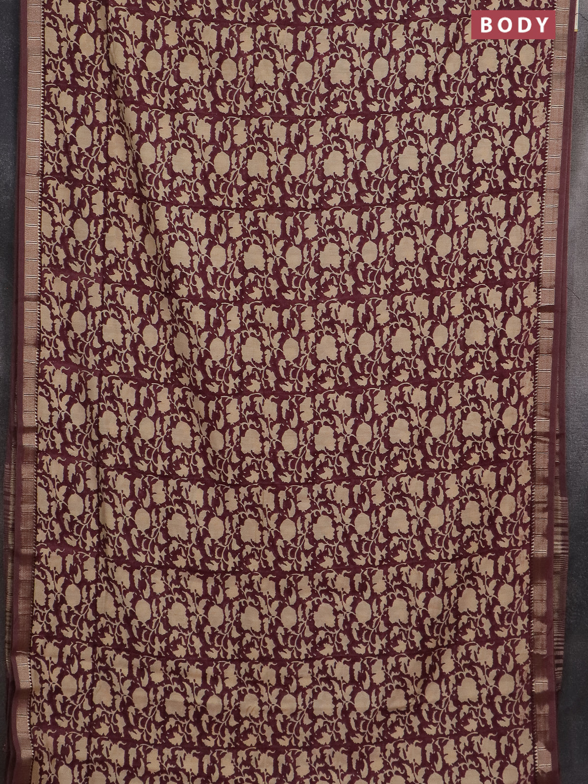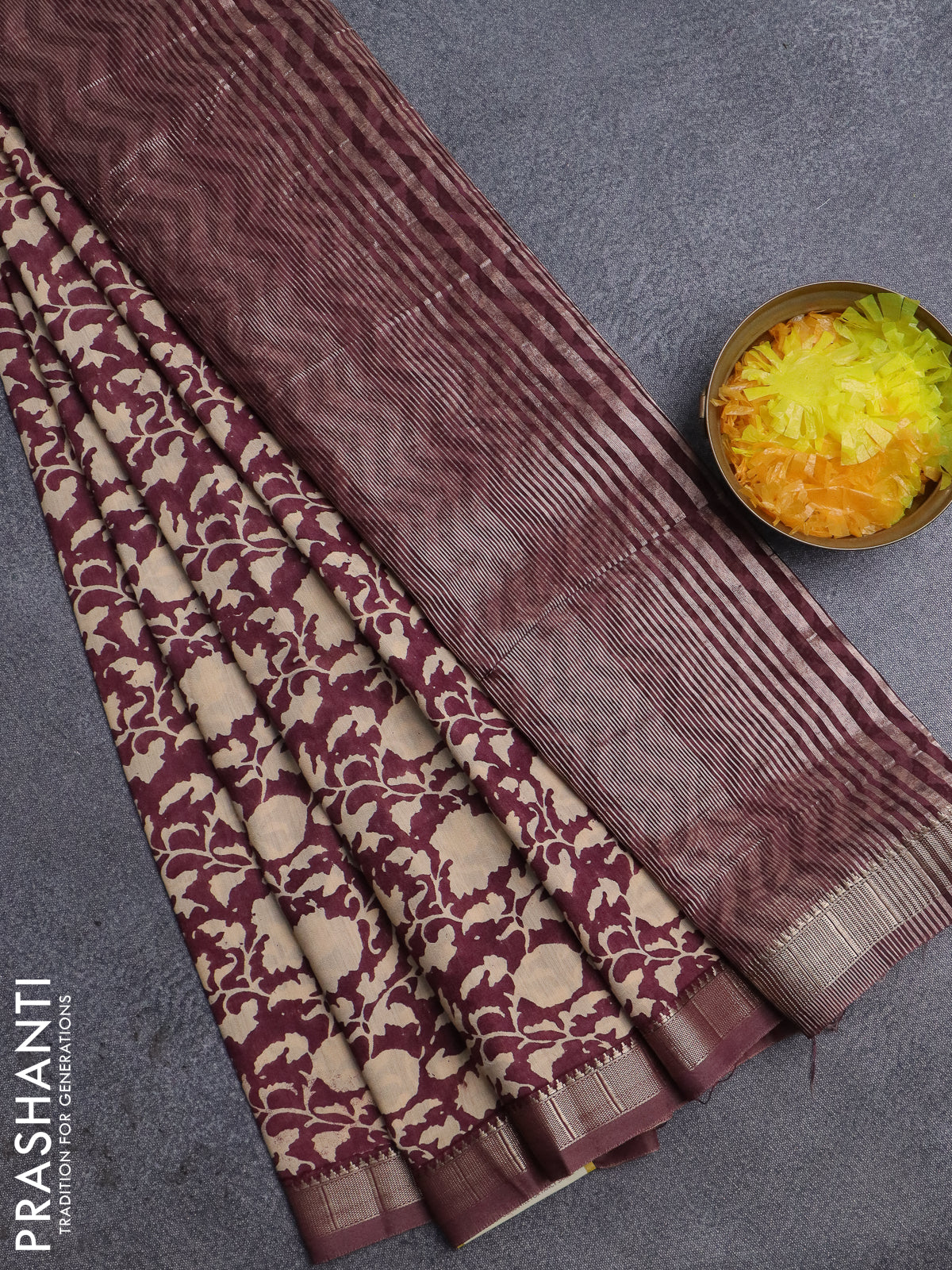 Semi chanderi saree wine shade and sandal with allover prints and zari woven border