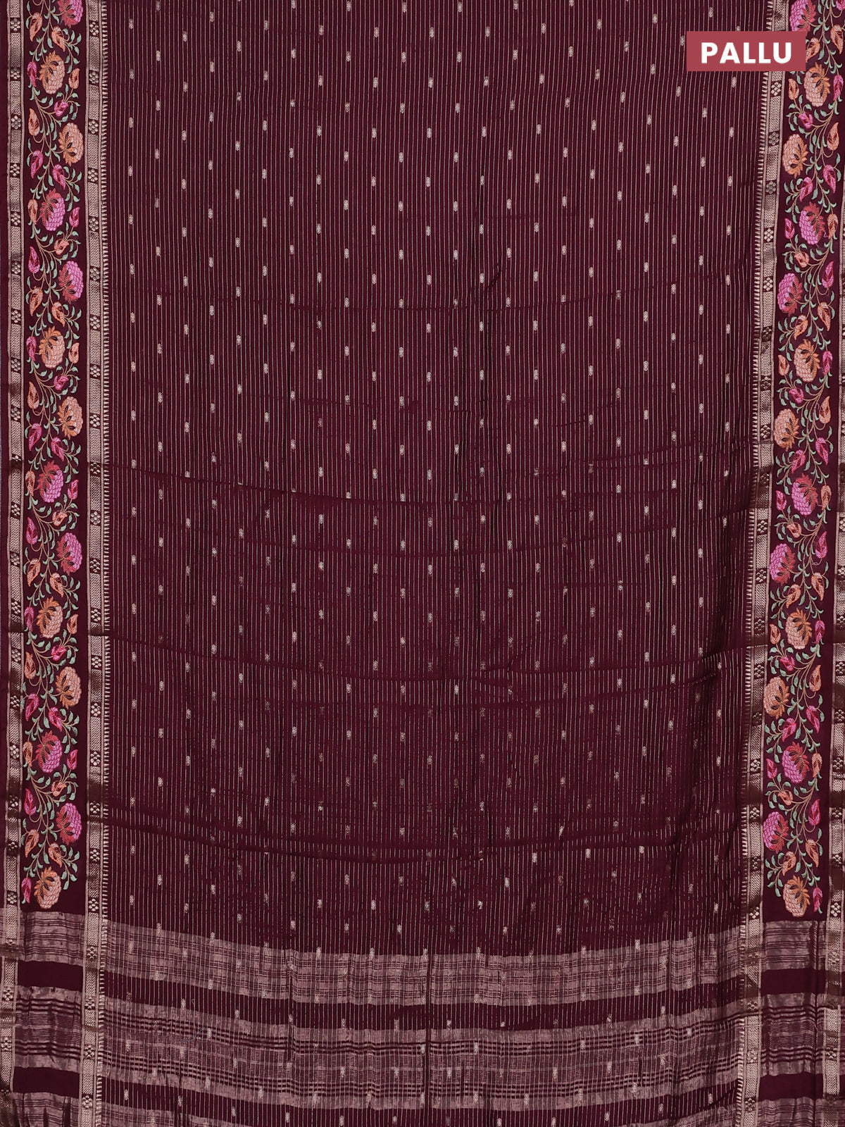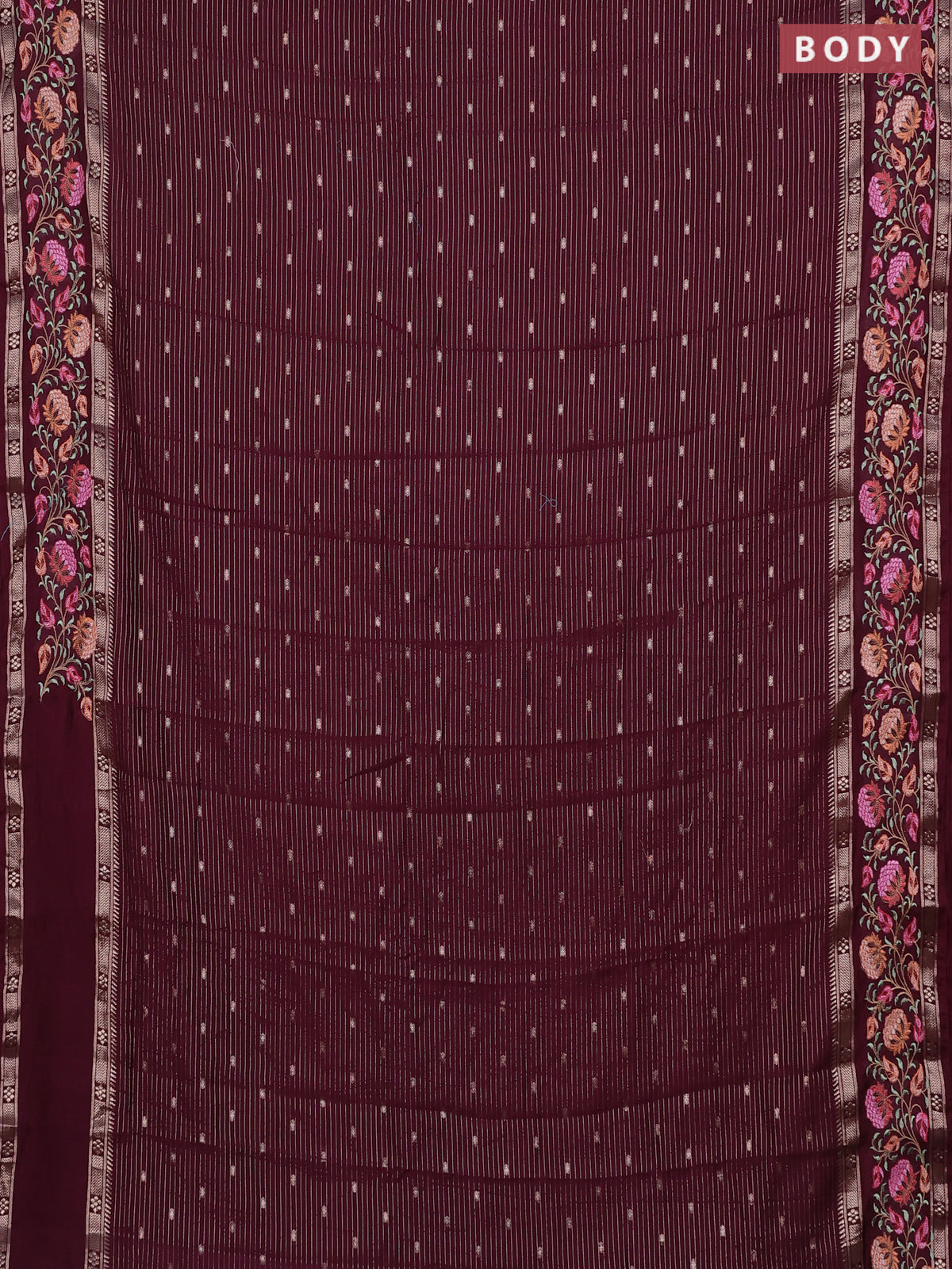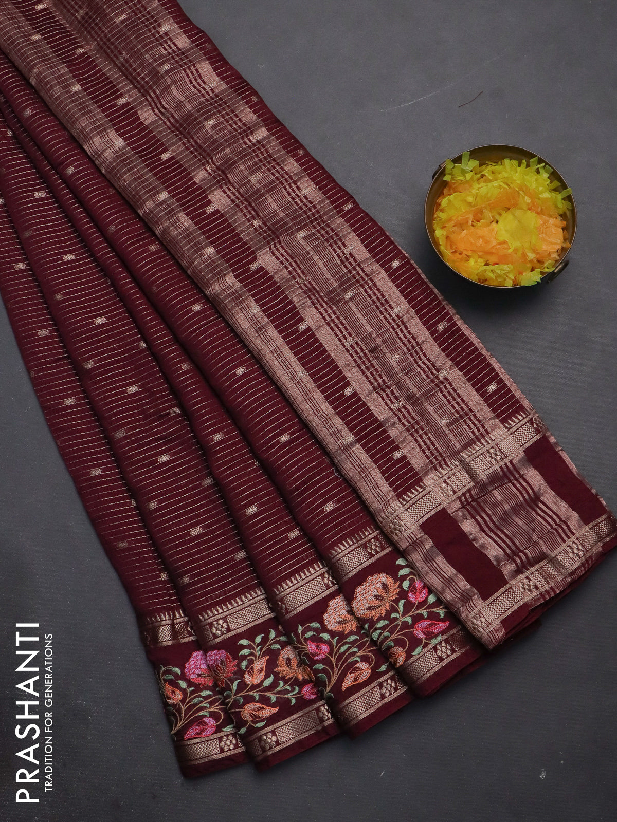 Semi chanderi saree wine shade with allover zari weaves & buttas and floral embroidery border