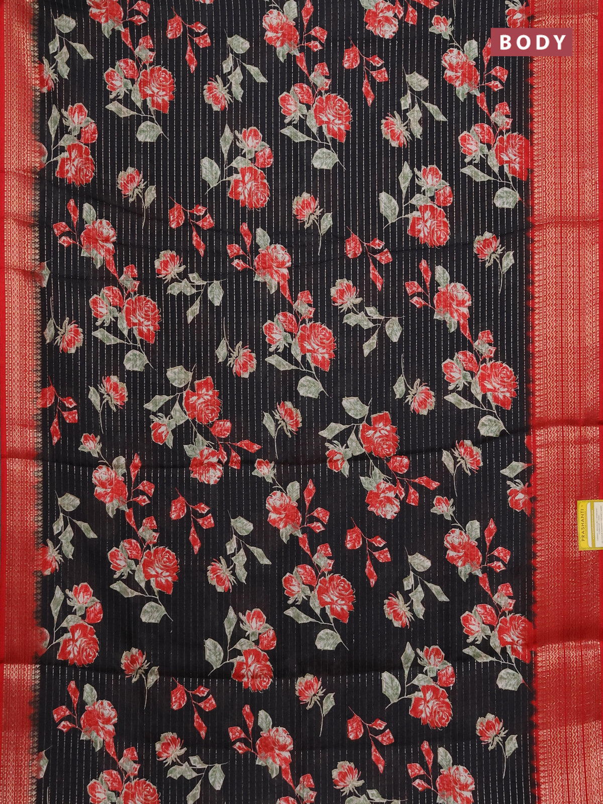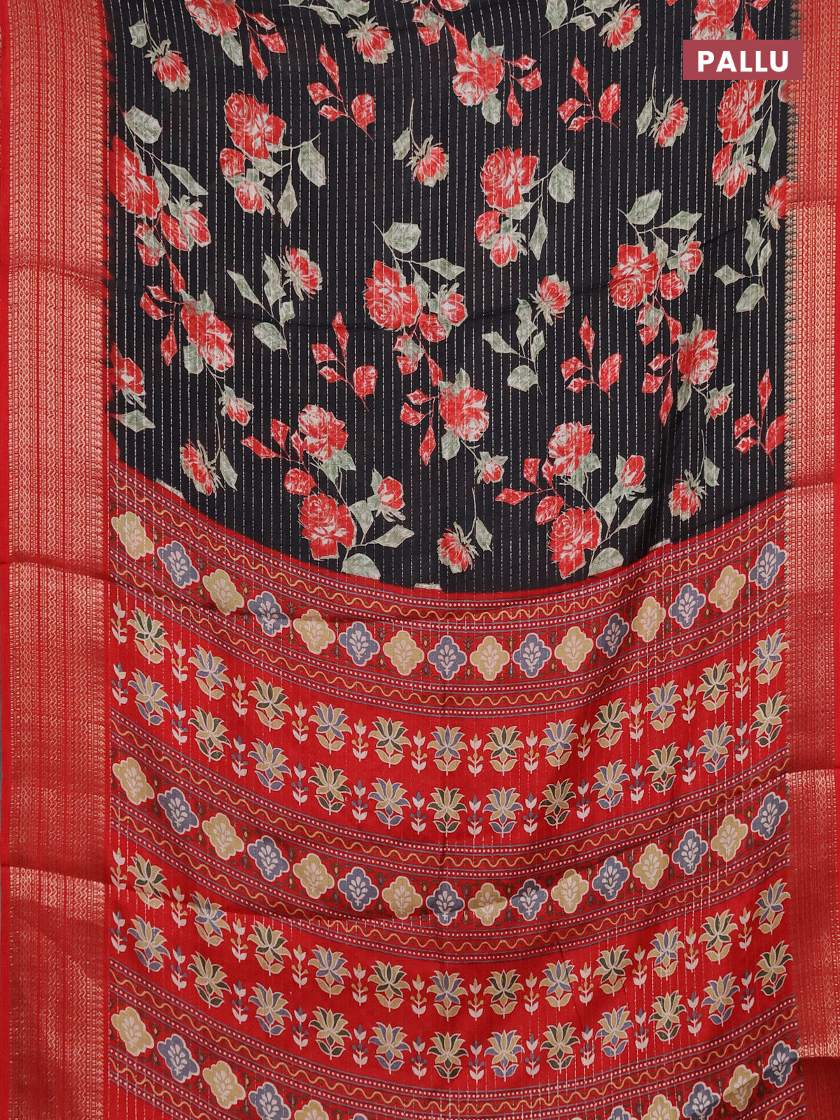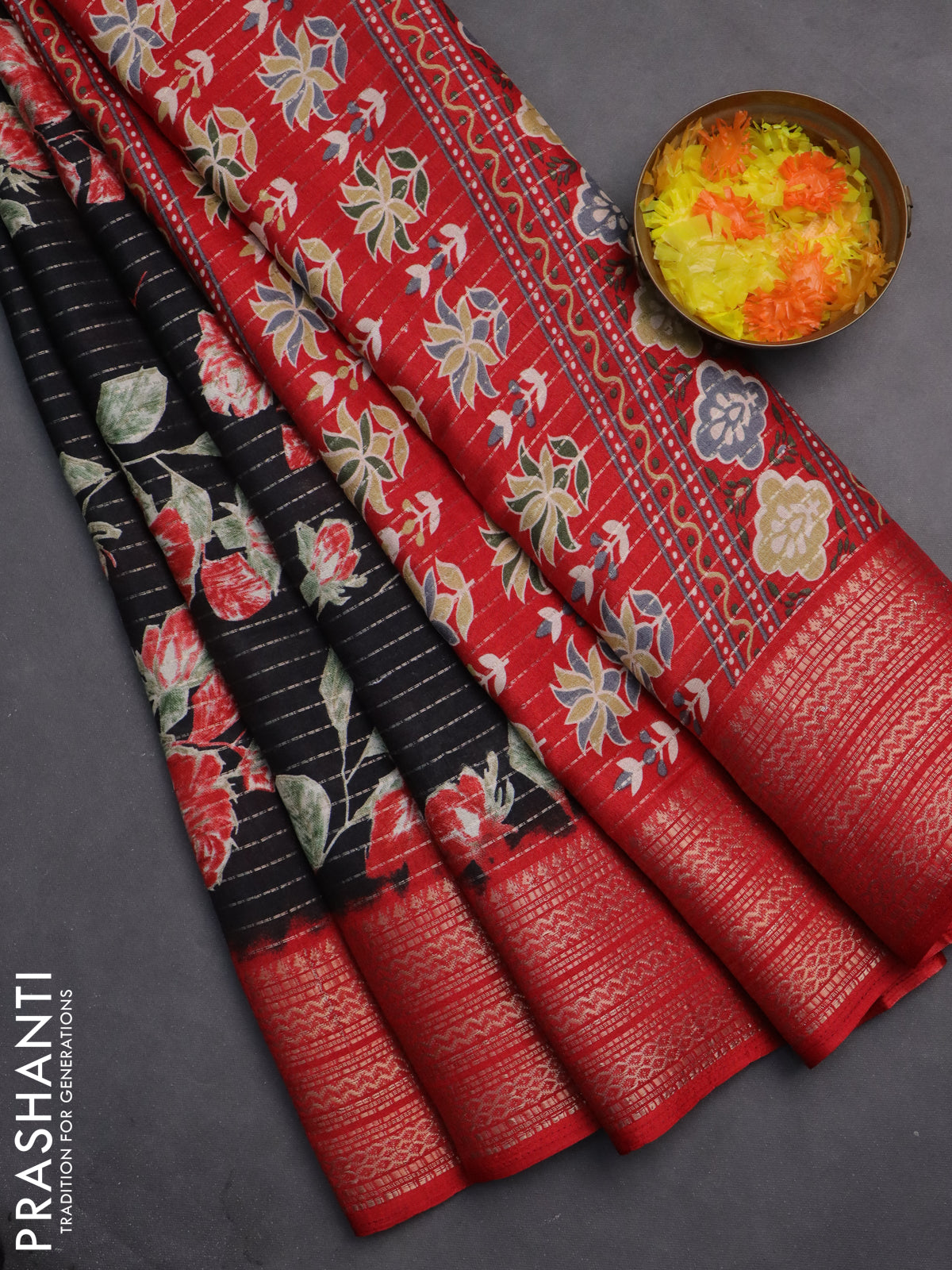 Semi dola saree black and red with allover zari weaves & floral prints and zari woven border