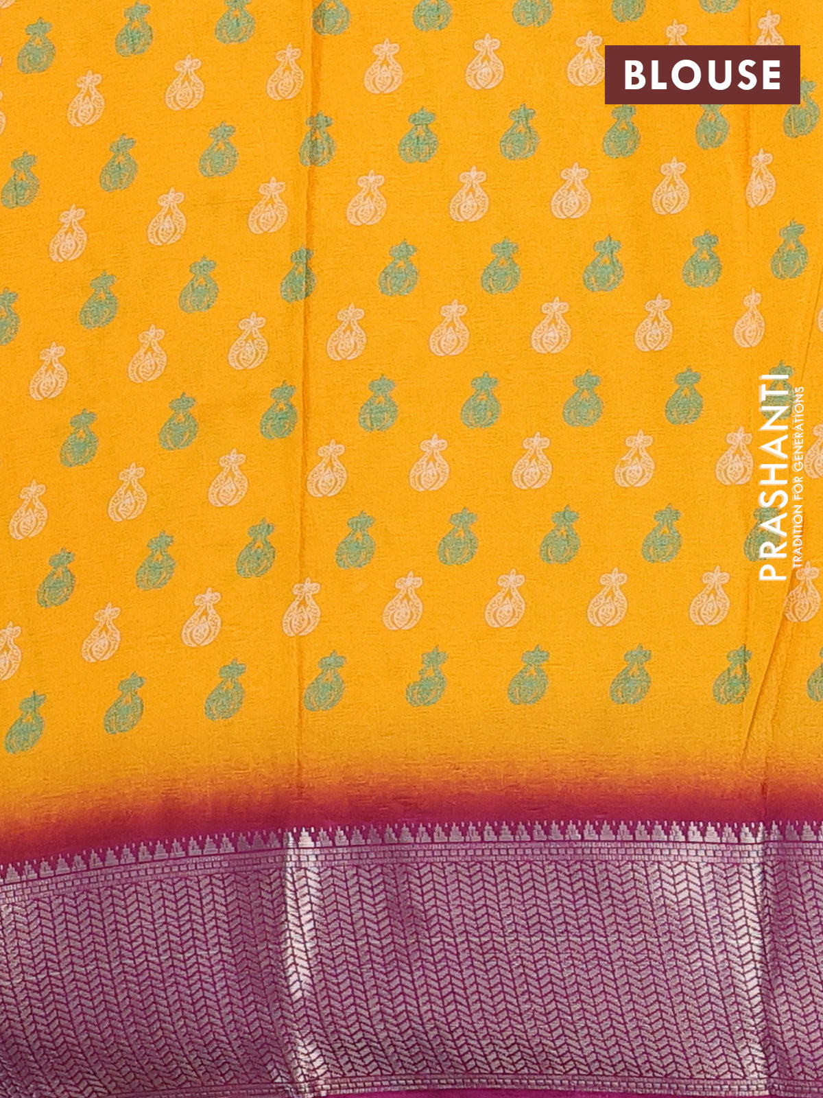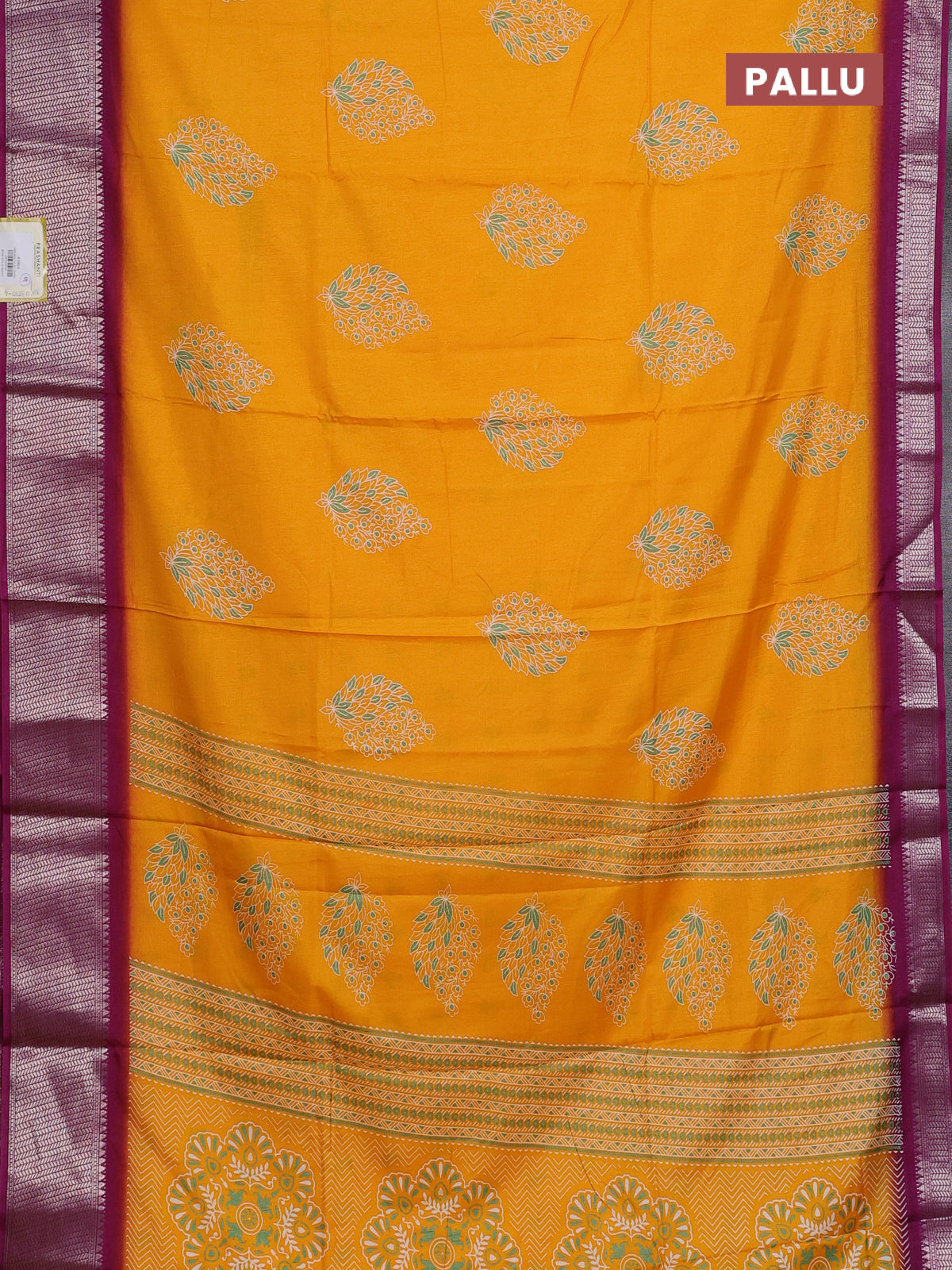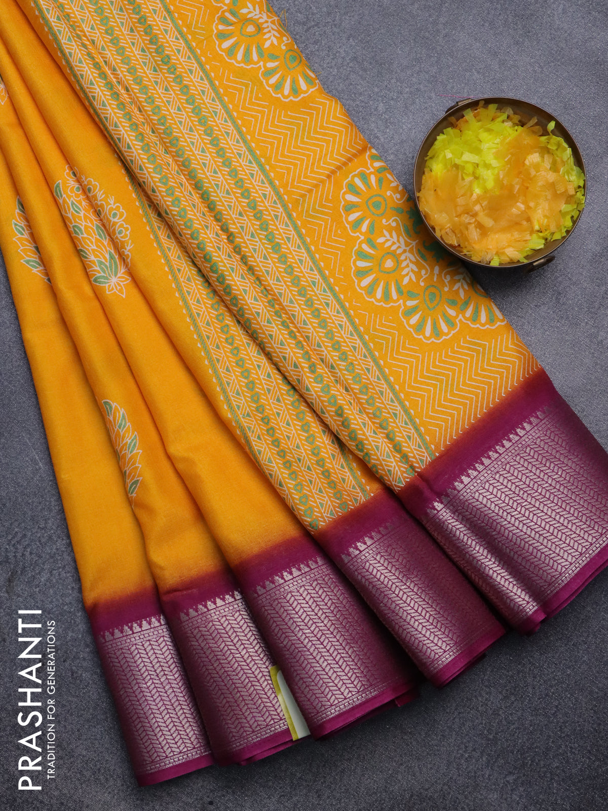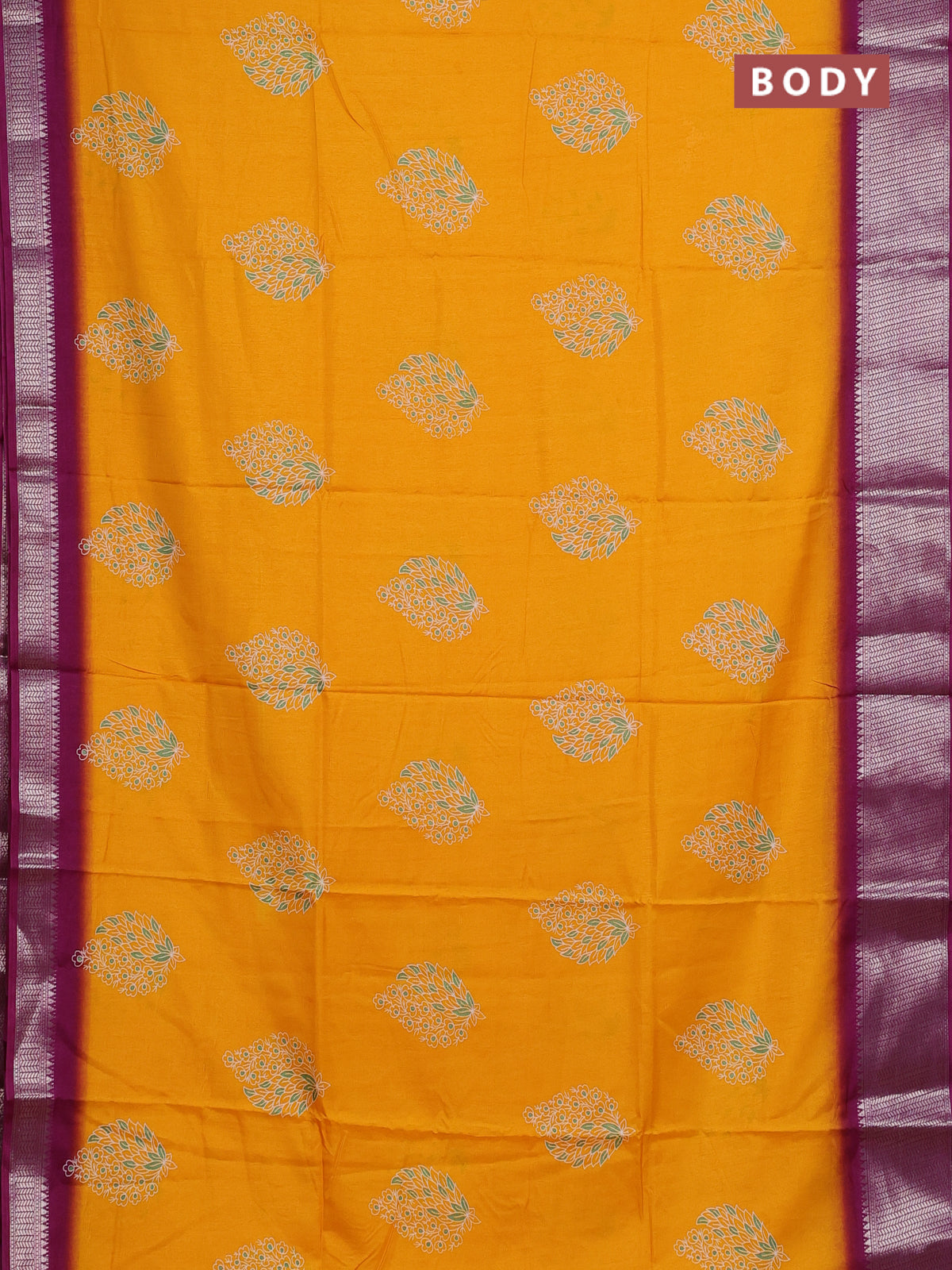 Semi dola saree mango yellow and wine shade with butta prints and zari woven border