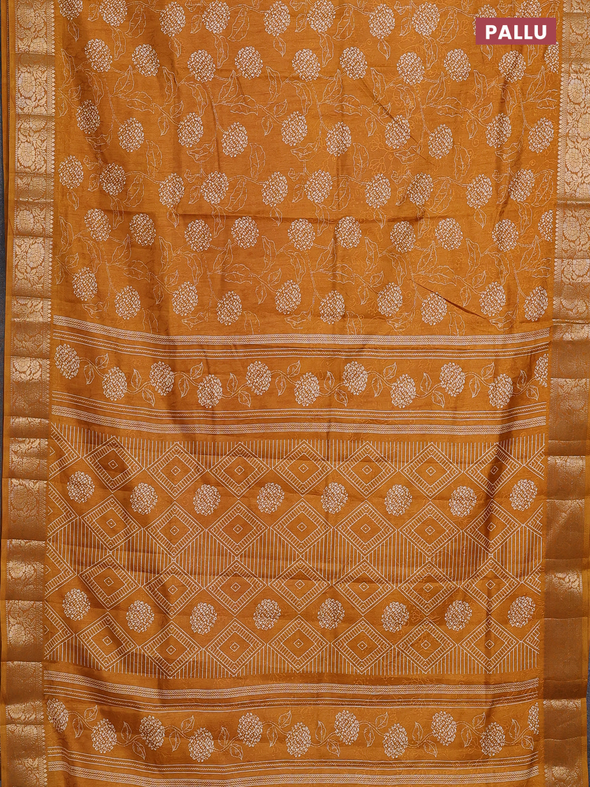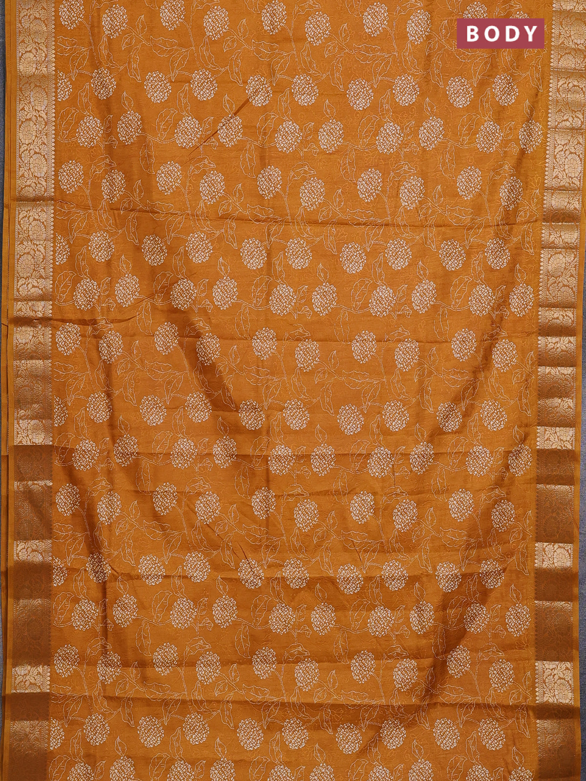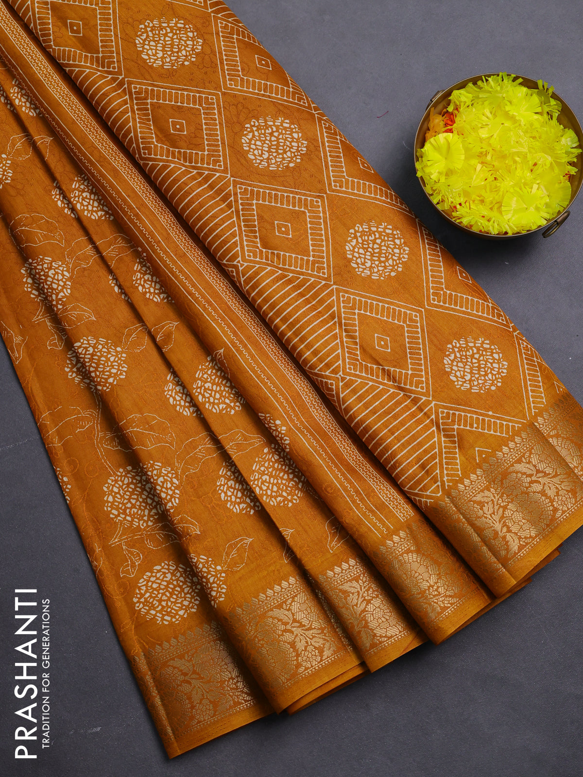 Semi dola saree mustard yellow with floral prints & self emboss and zari woven border