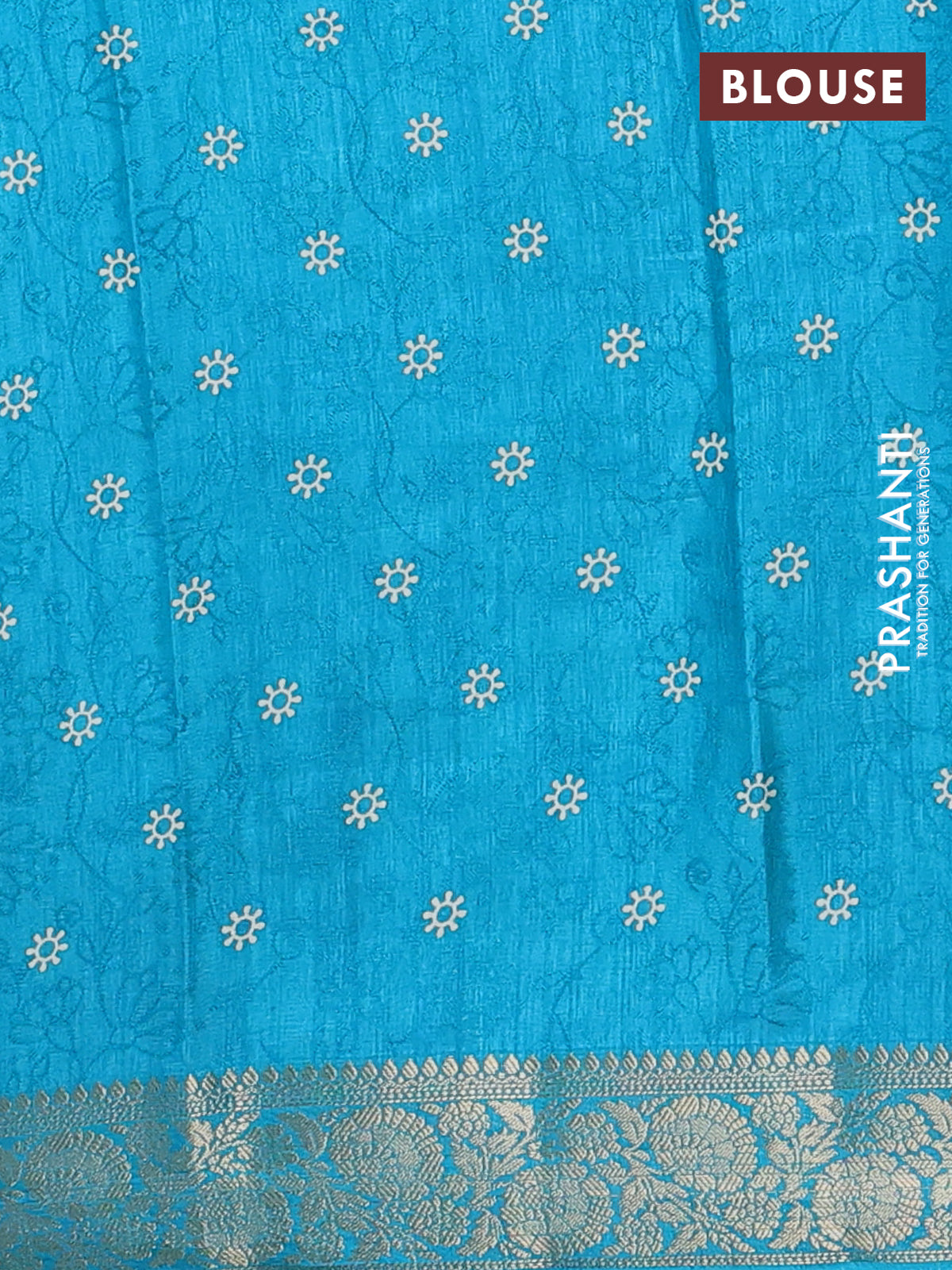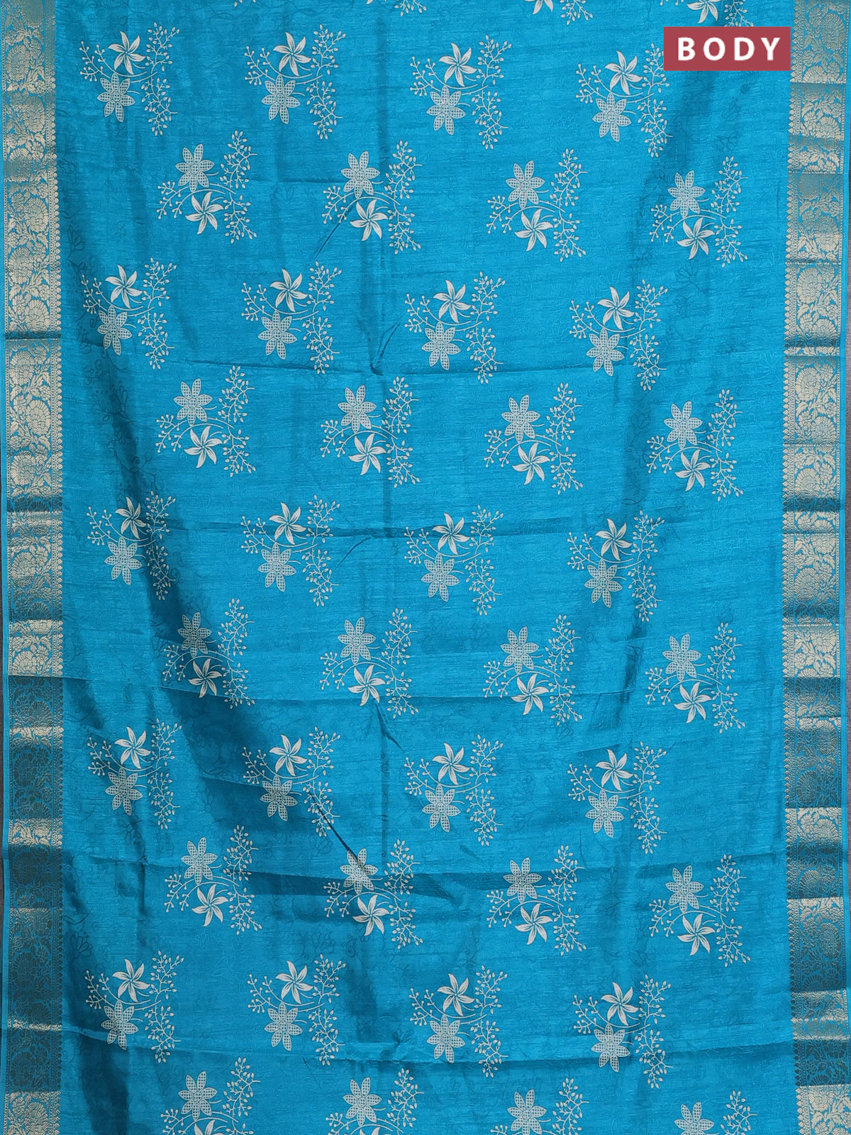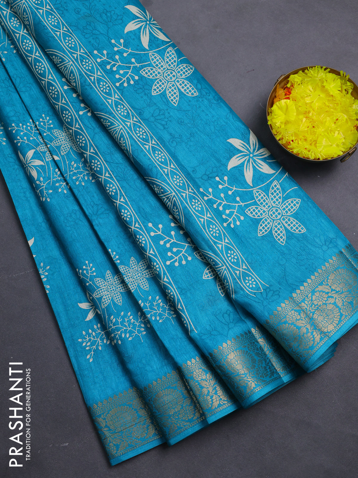 Semi dola saree teal blue with floral prints & self emboss and zari woven border