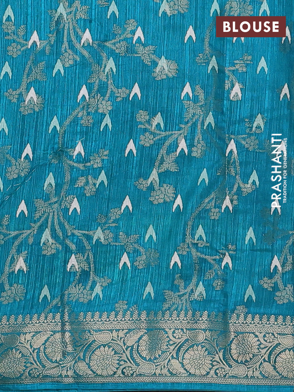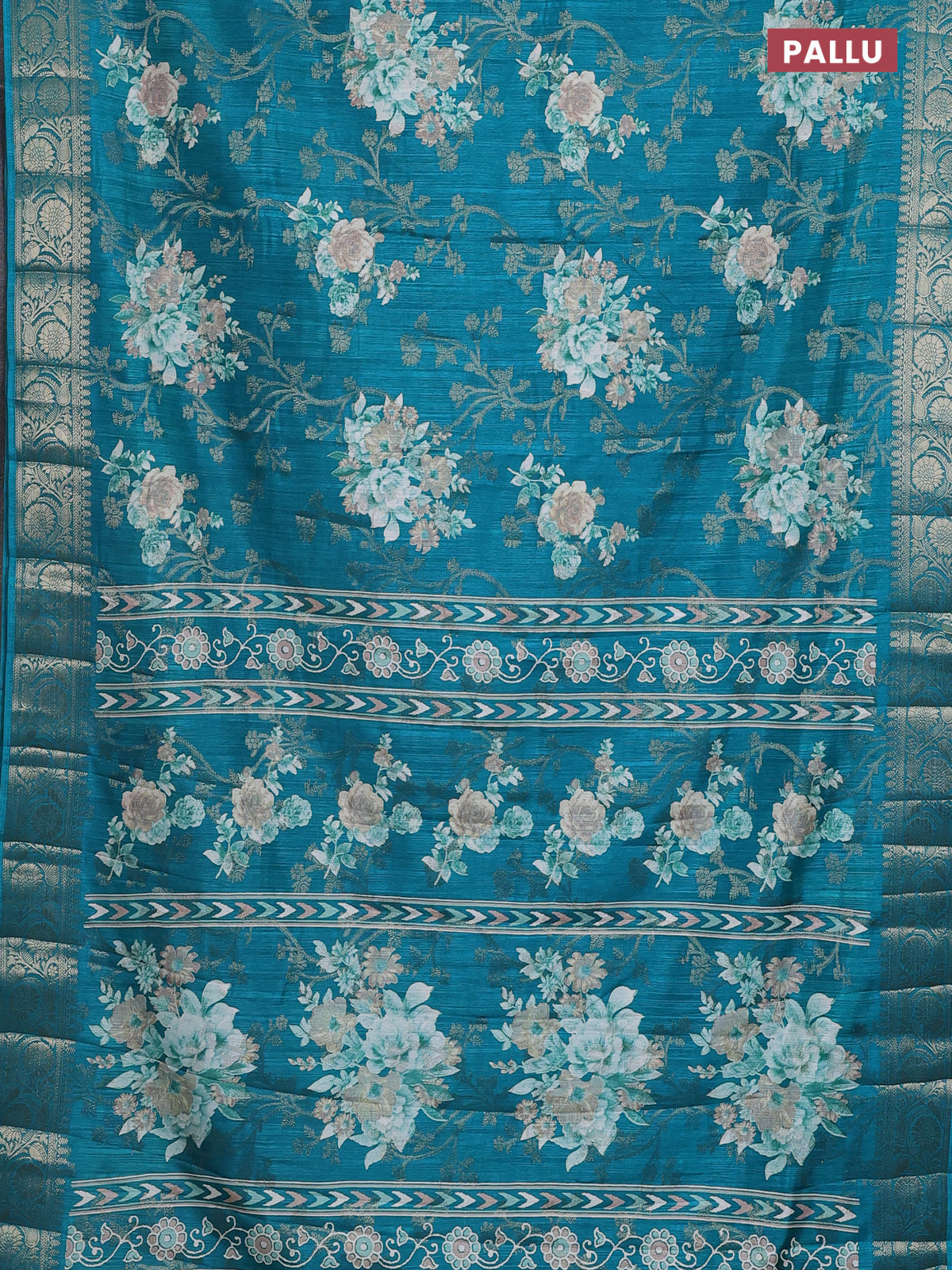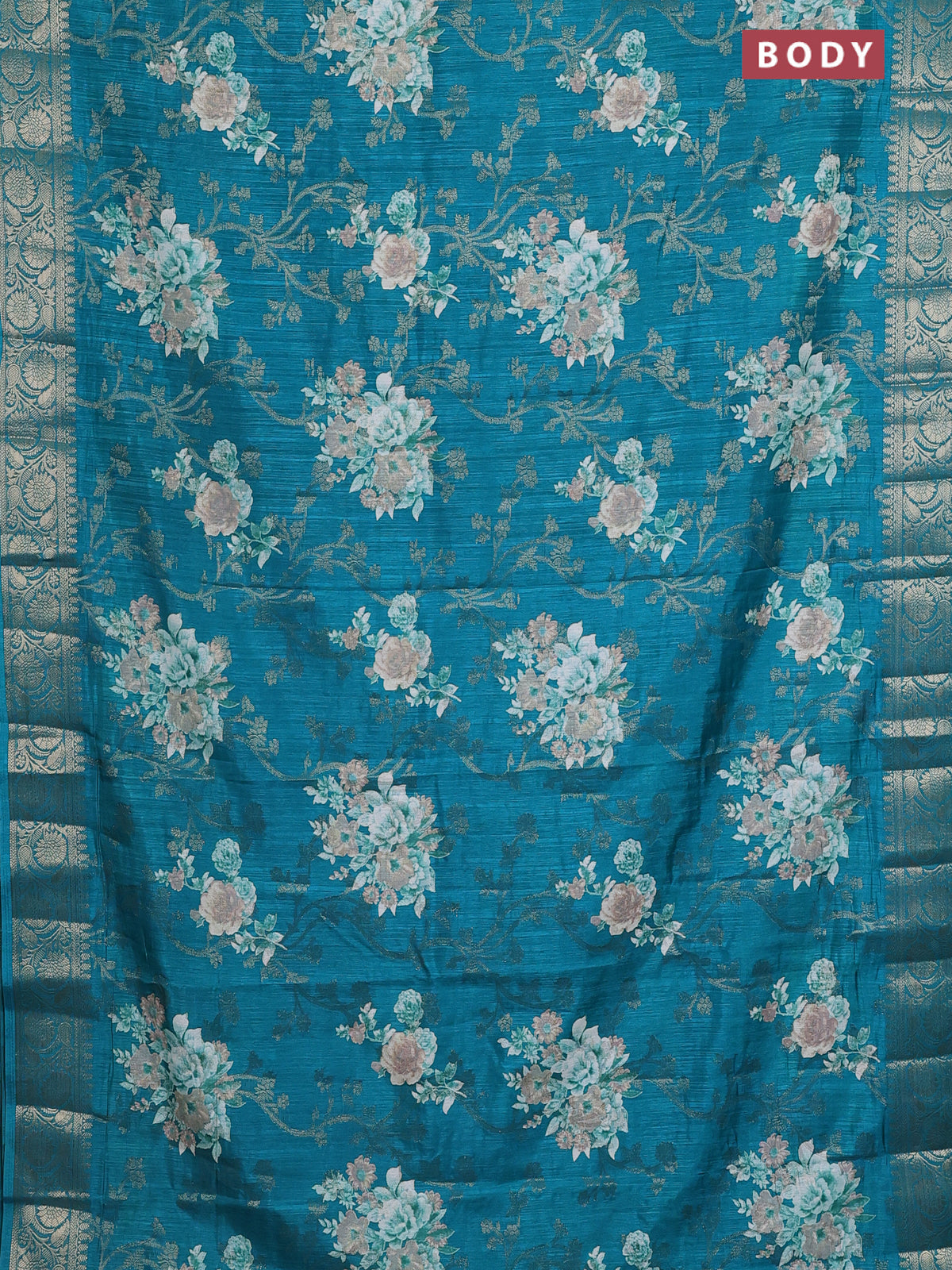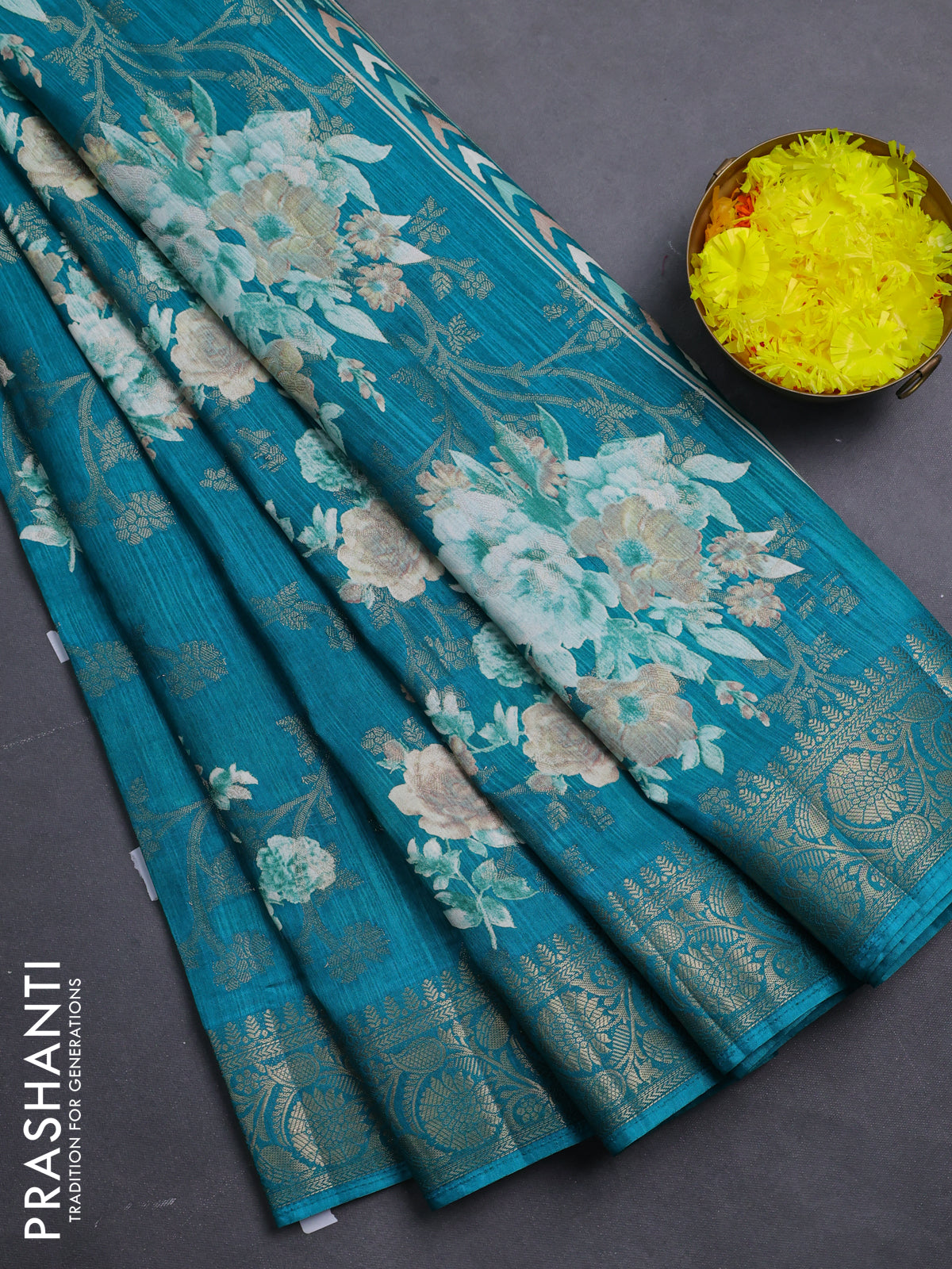 Semi dola saree teal blue with floral prints & zari weaves and zari woven border