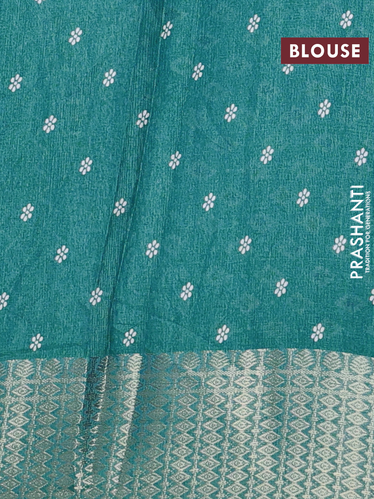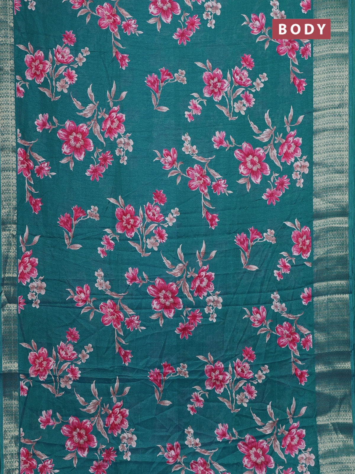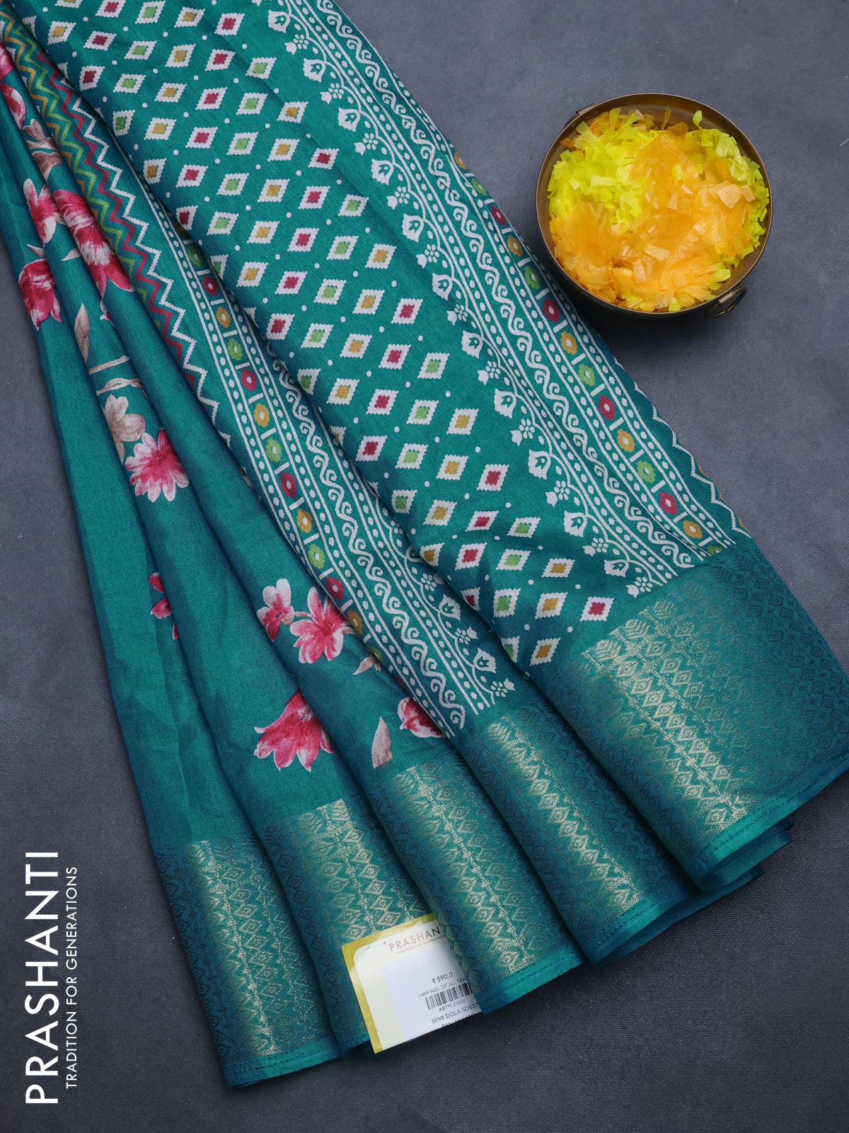 Semi dola saree teal shade with allover floral prints and zari woven border