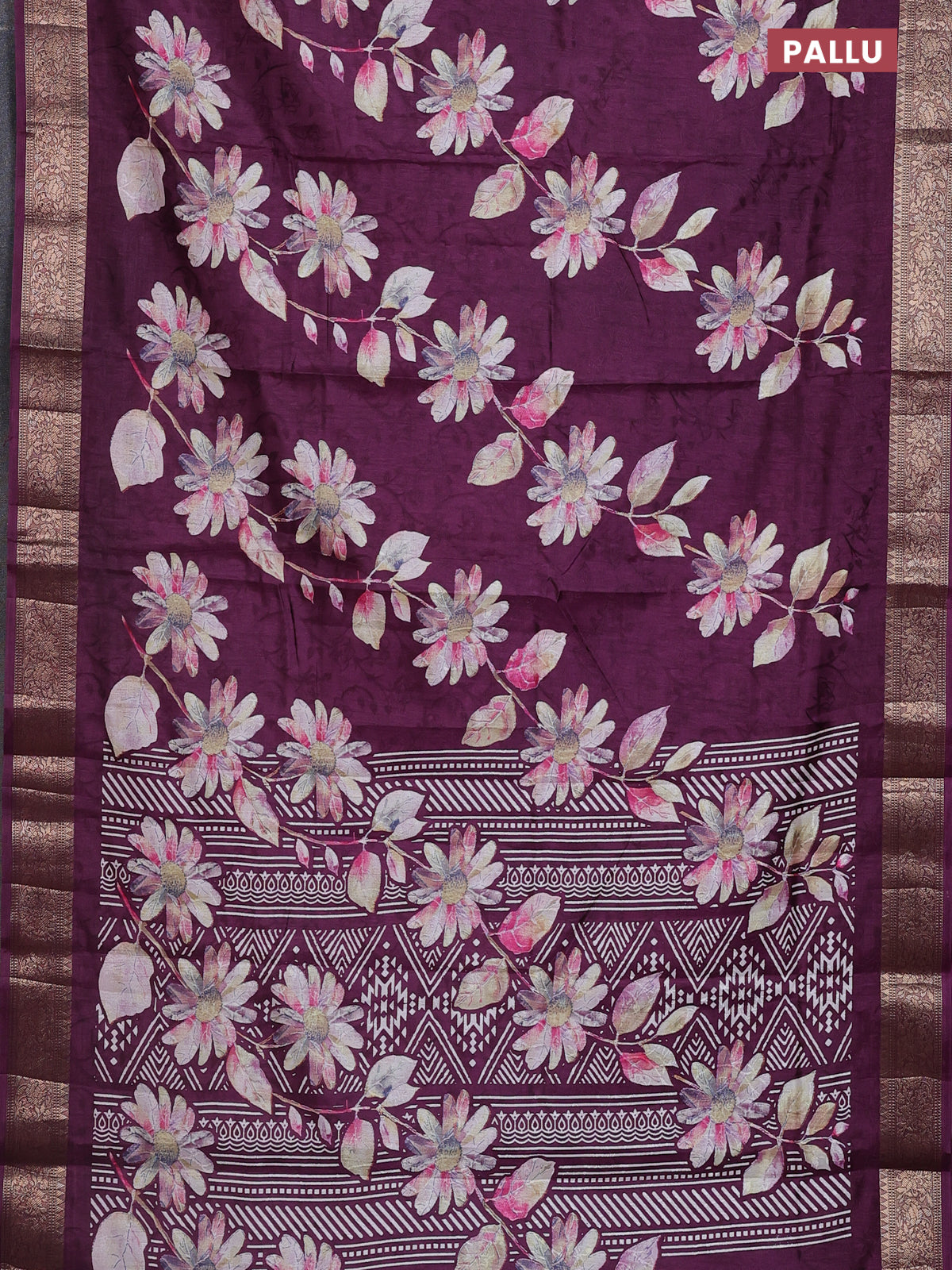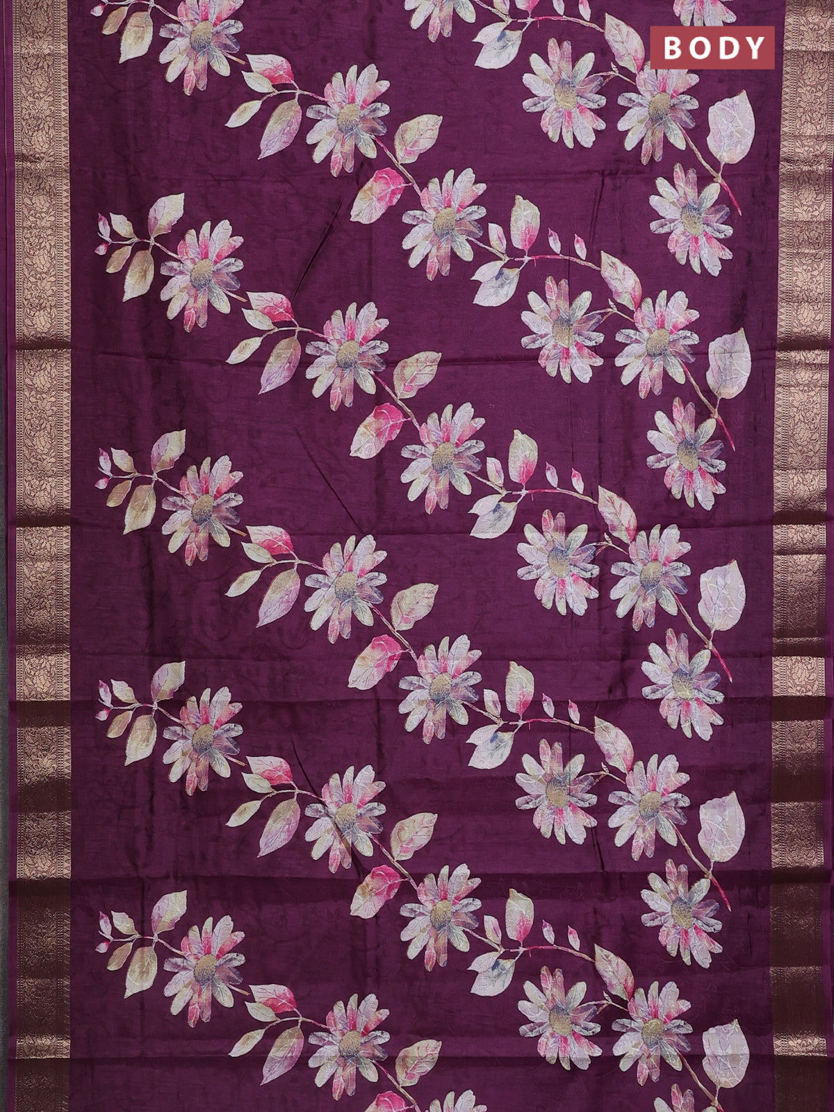 Semi dola saree wine shade with floral prints & self emboss and zari woven border