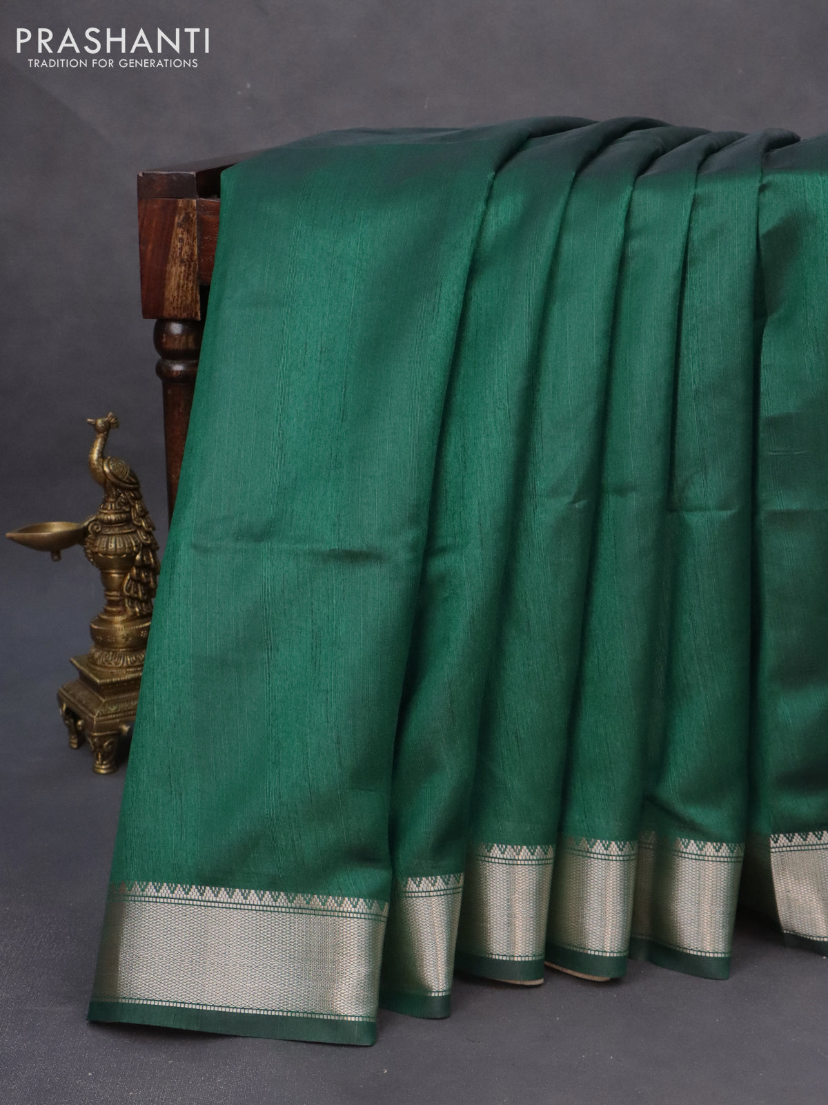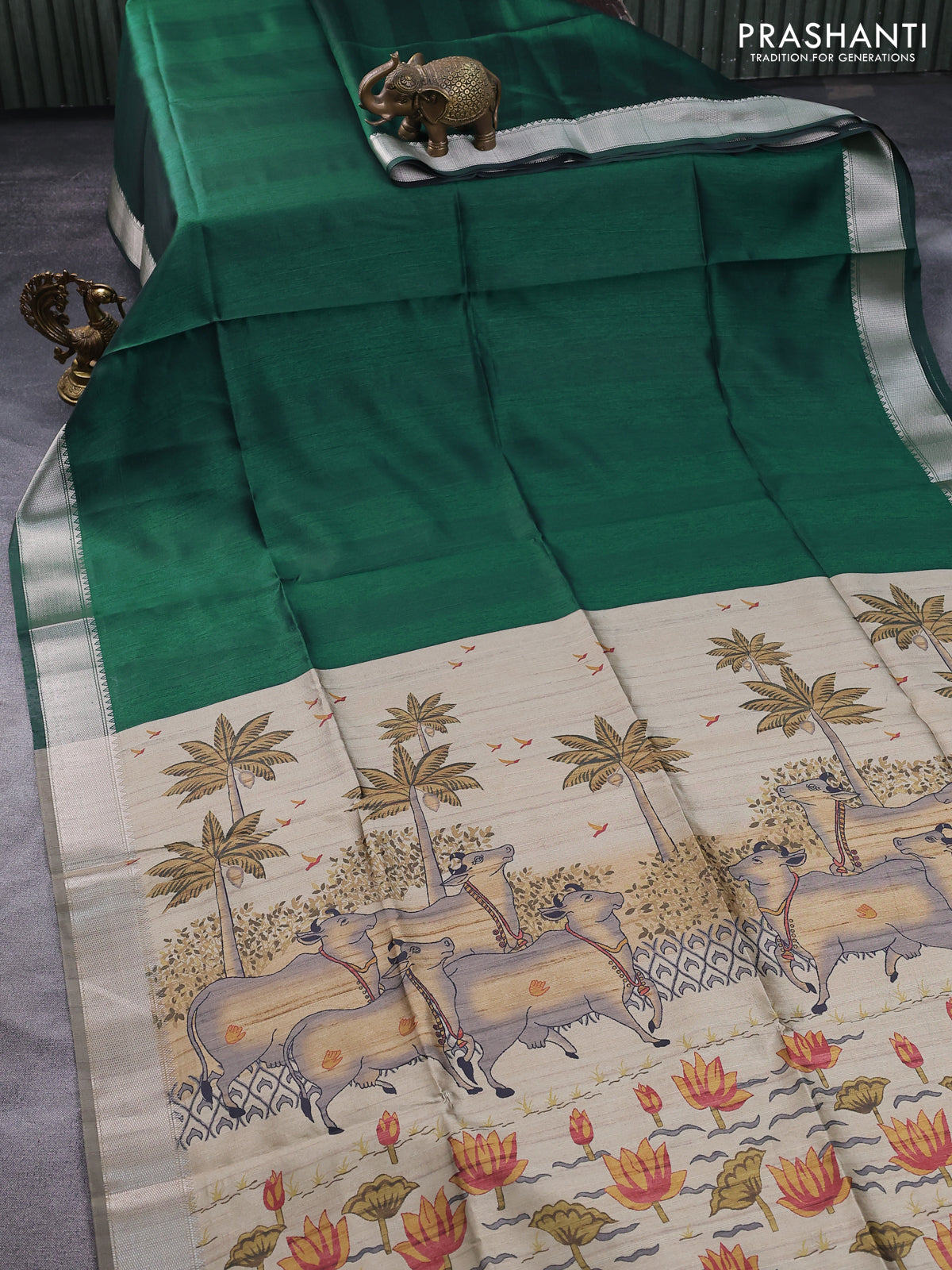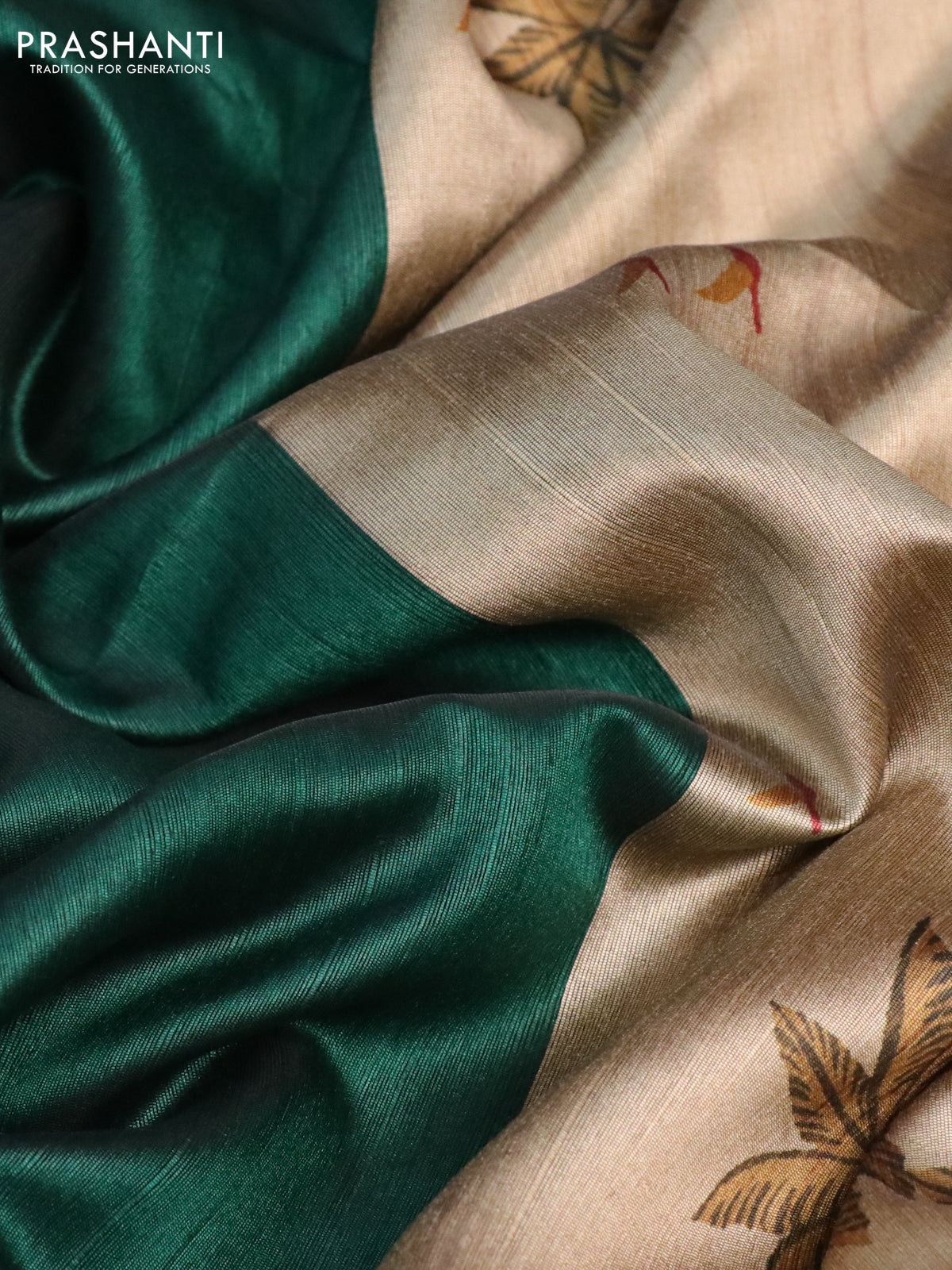 Semi dupion saree dark green and beige with plain body and printed pallu