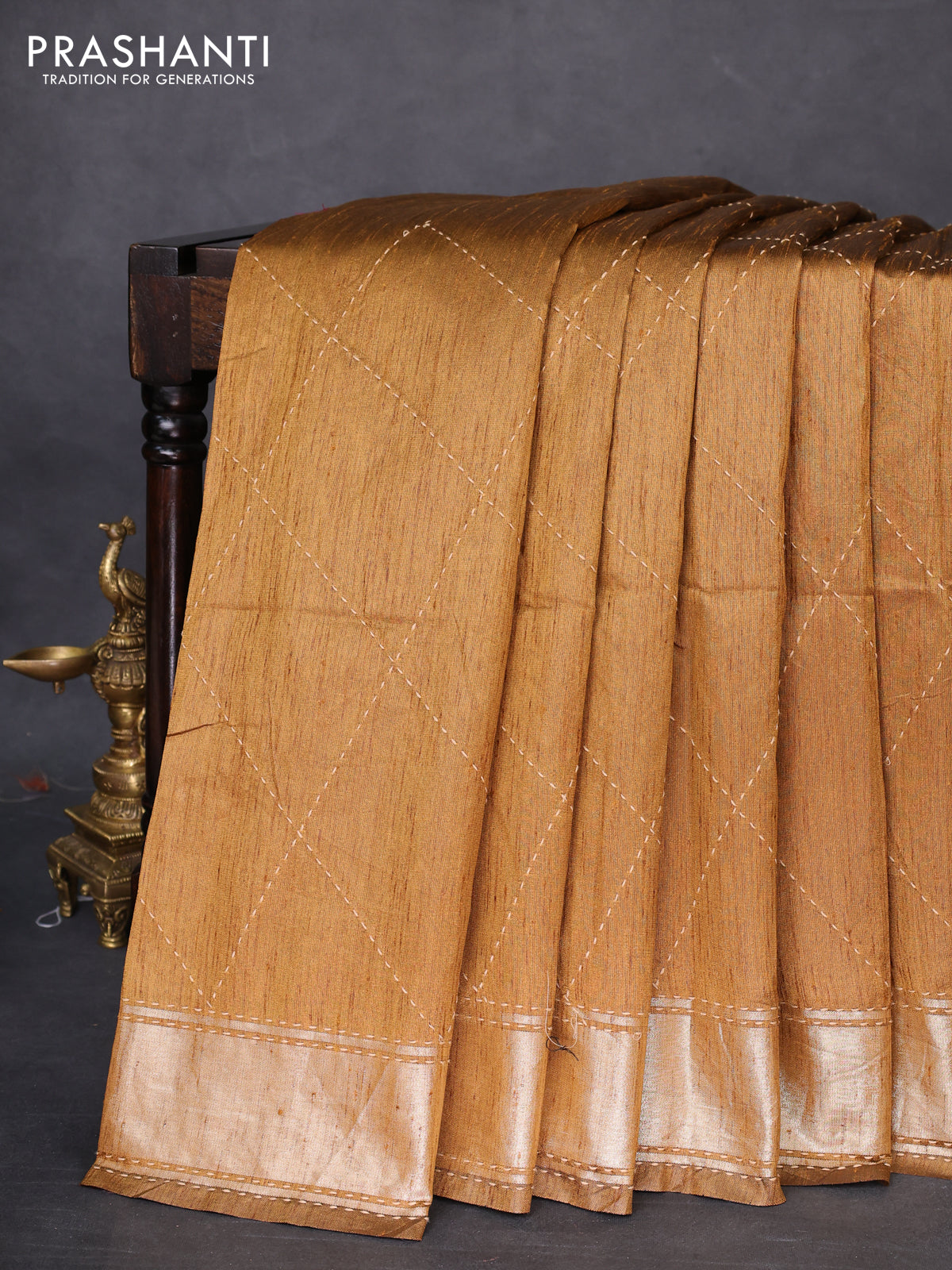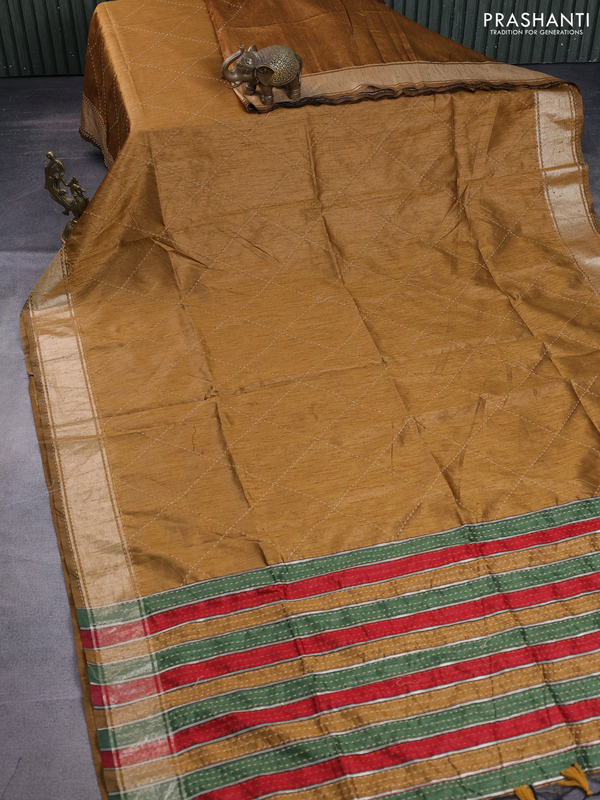 Semi dupion saree dark mustard and multi colour with allover kantha stitch work and zari woven border