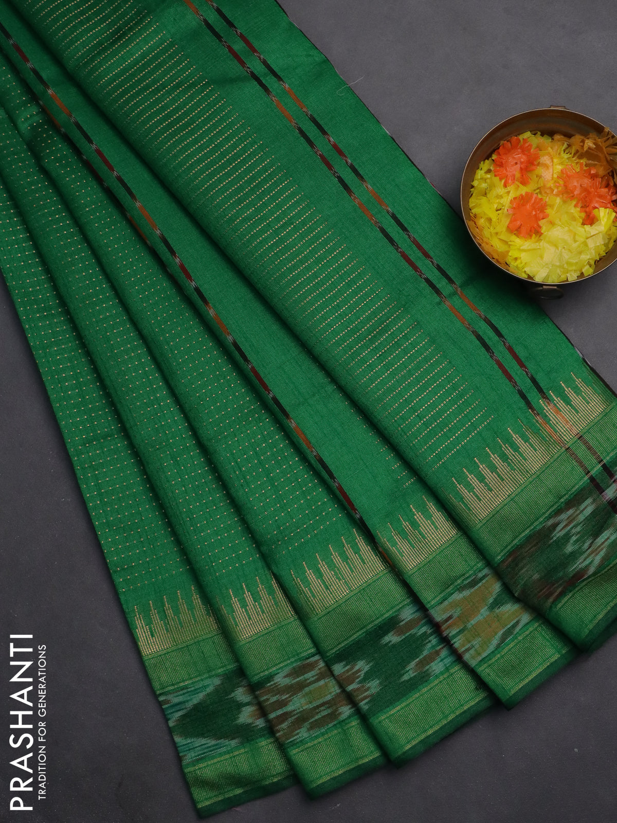 Semi dupion saree green with allover zari weaves and temple design zari woven ikat border