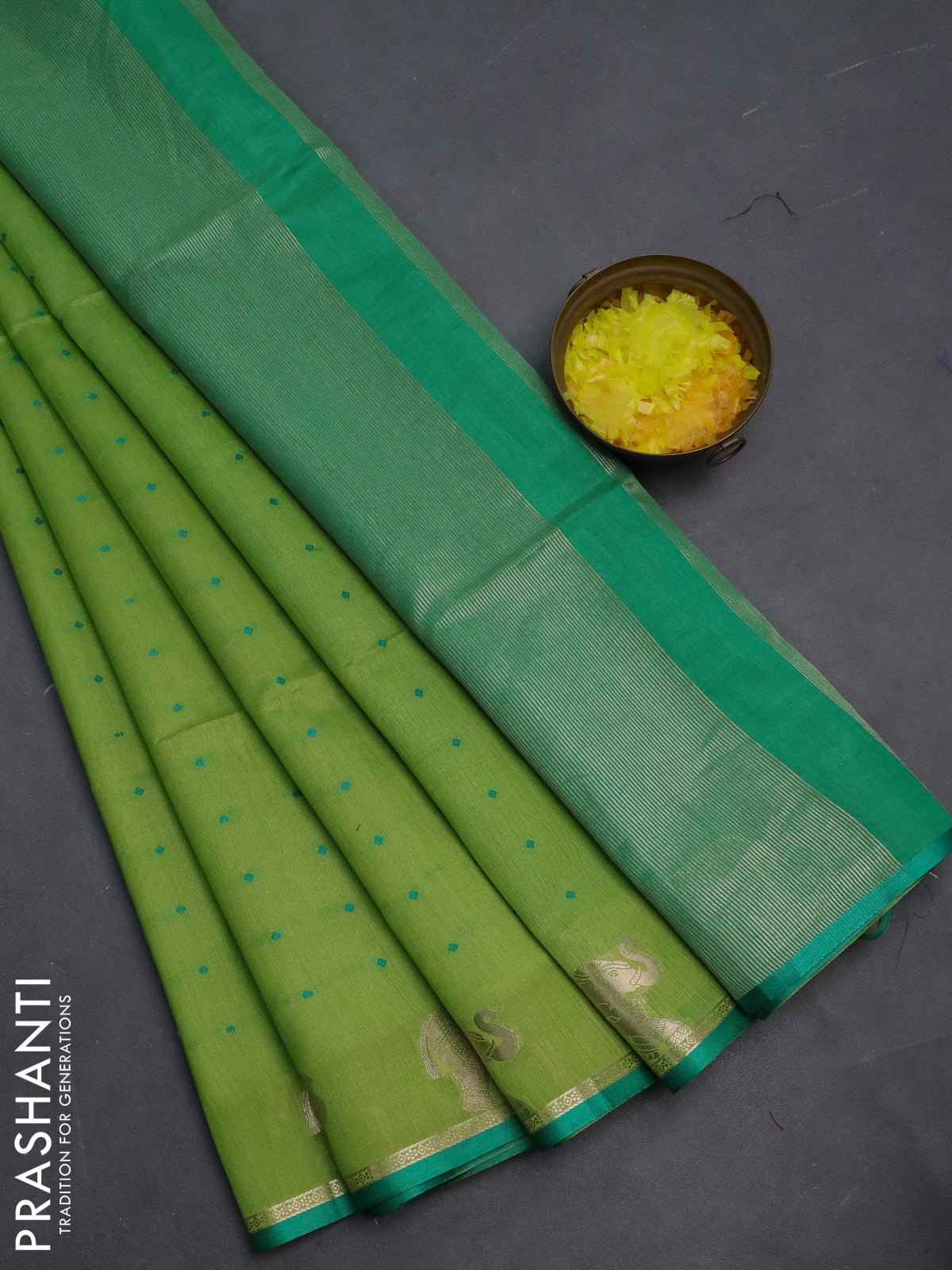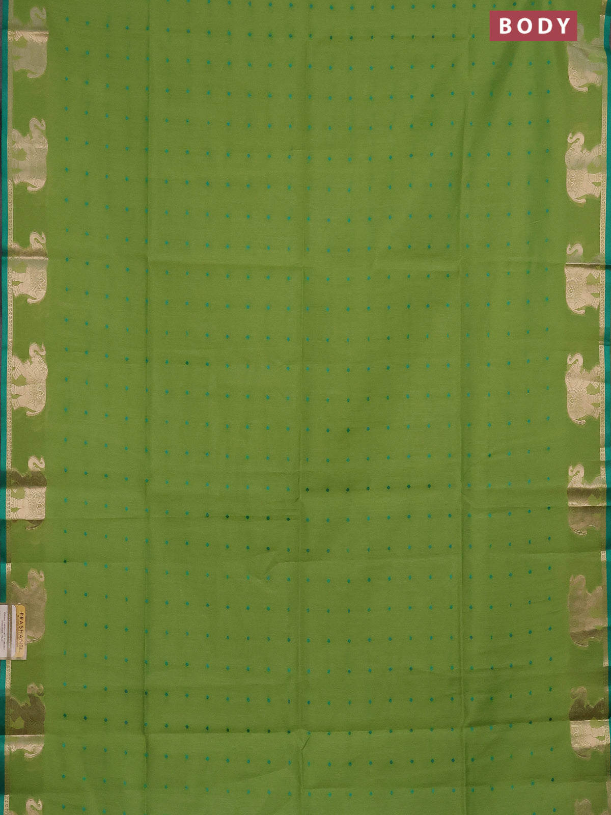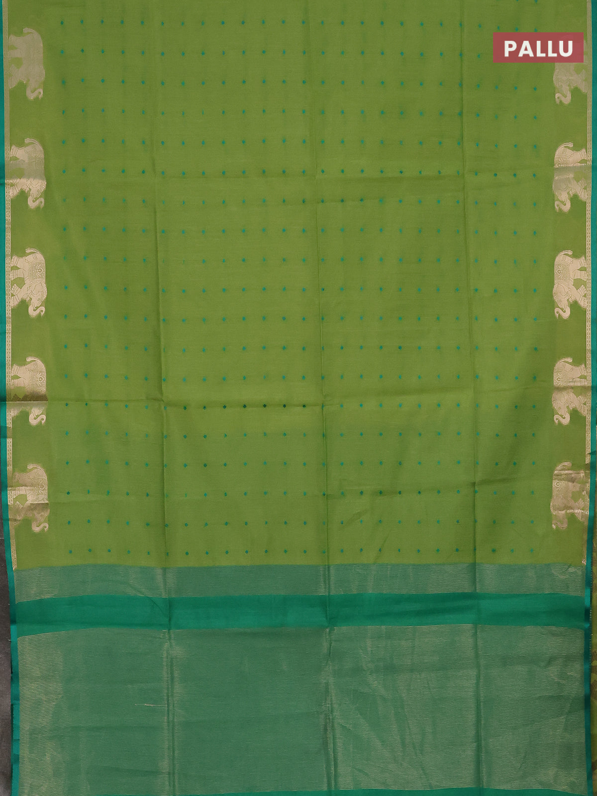 Semi dupion saree light green and teal green with thread woven buttas and elephant zari woven butta border