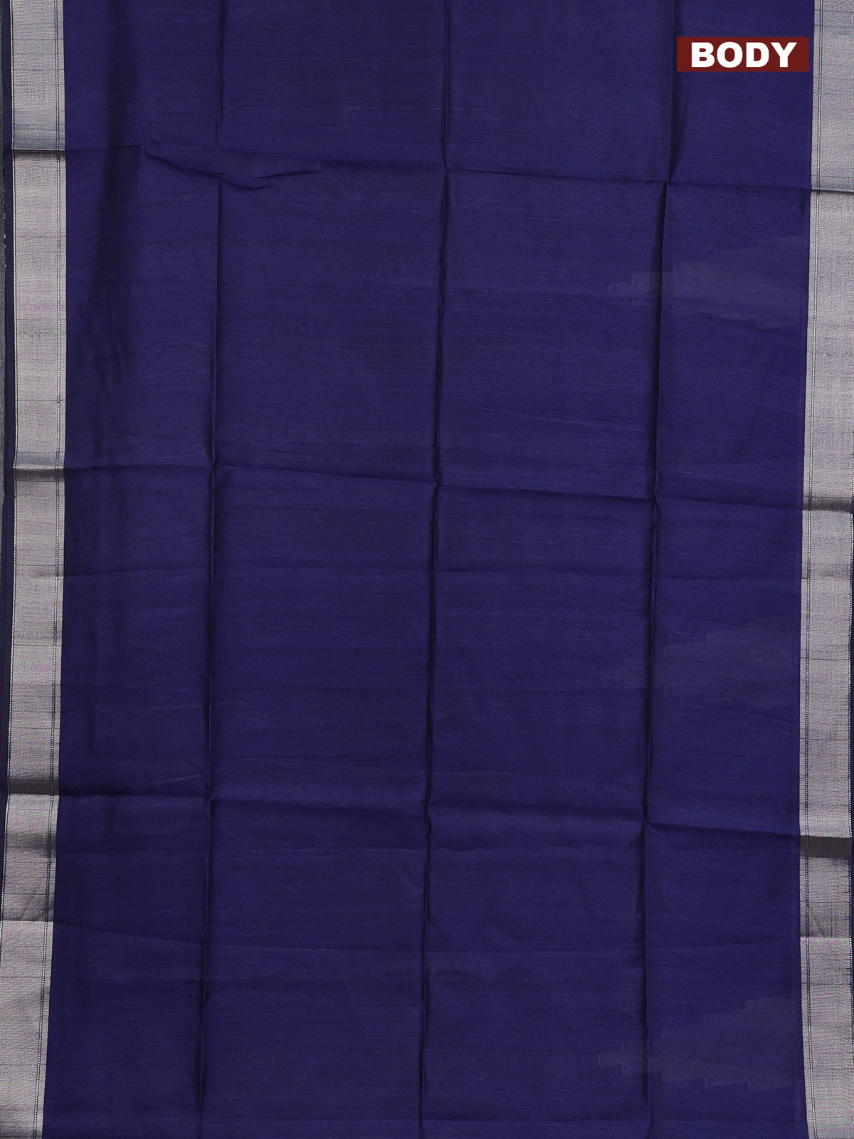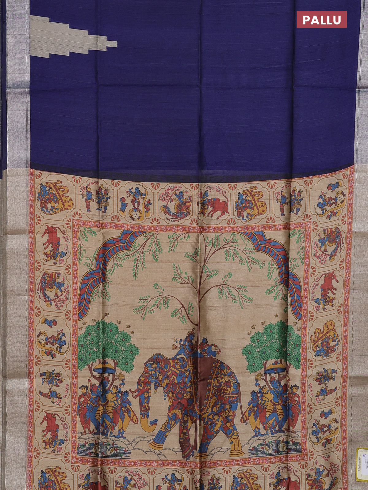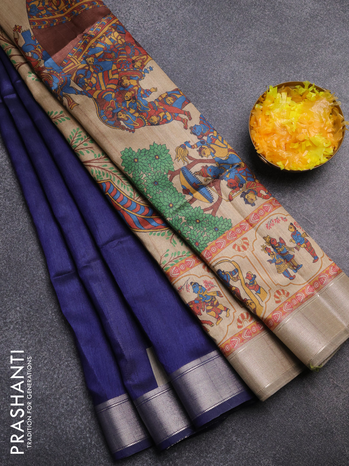 Semi dupion saree navy blue and beige with plain body and kalamkari printed pallu