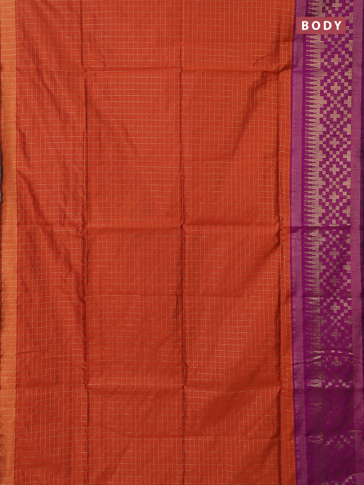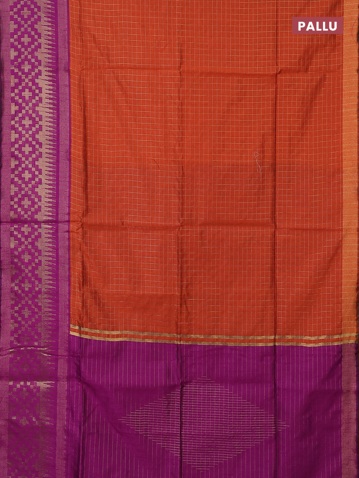 Semi dupion saree orange and purple with allover zari checked pattern and long temple zari woven border