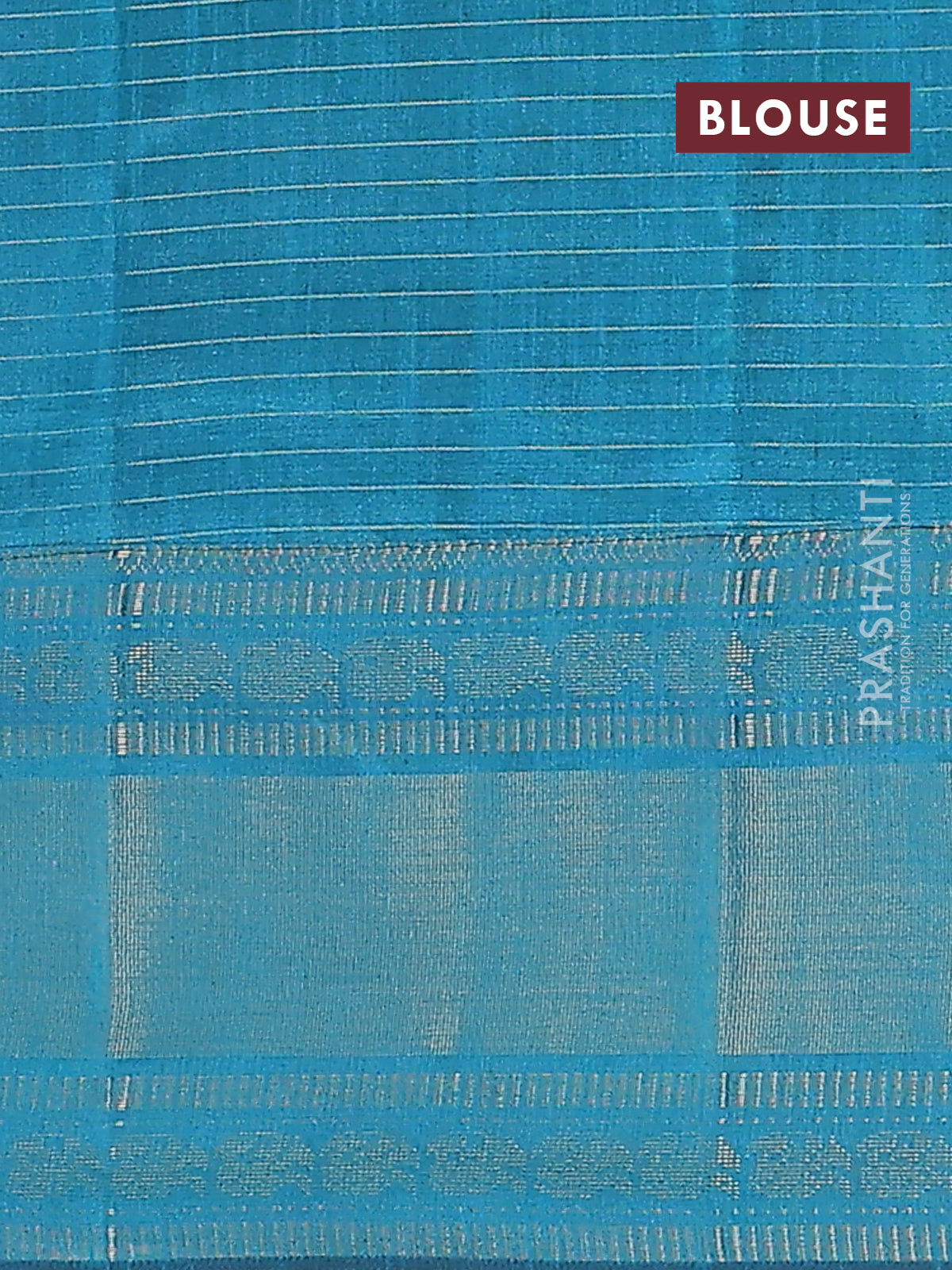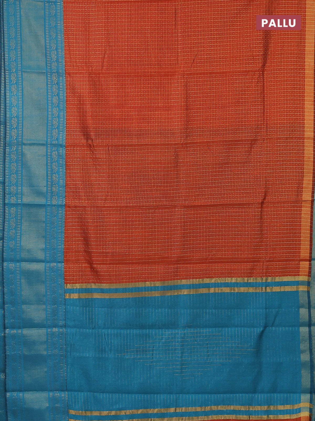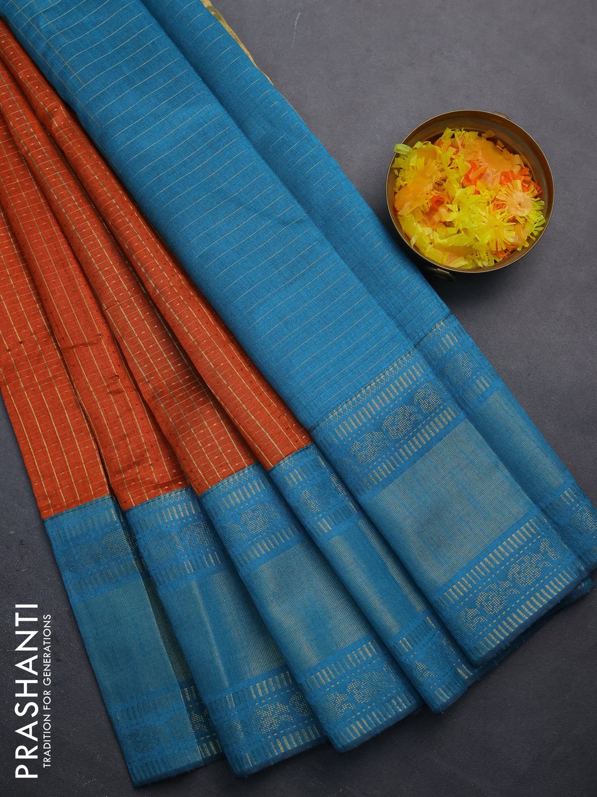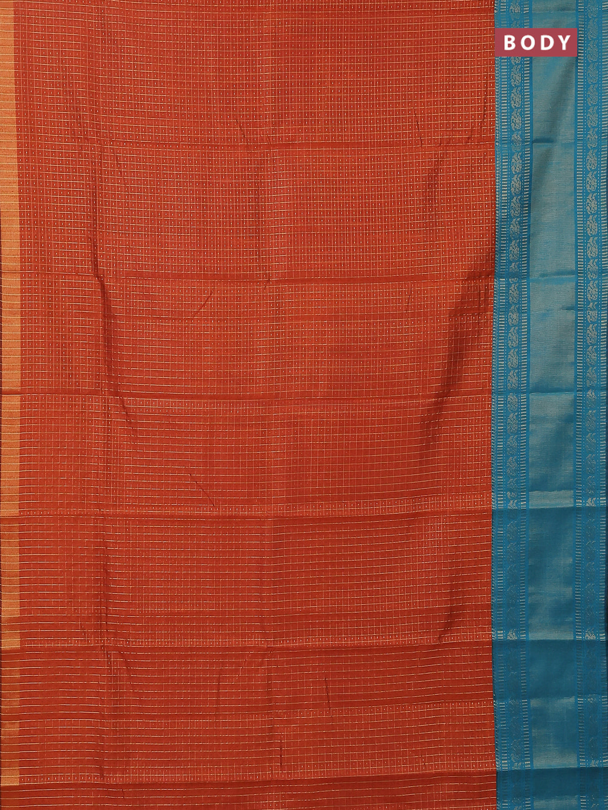 Semi dupion saree orange and teal blue with allover zari checks & buttas and long zari woven border