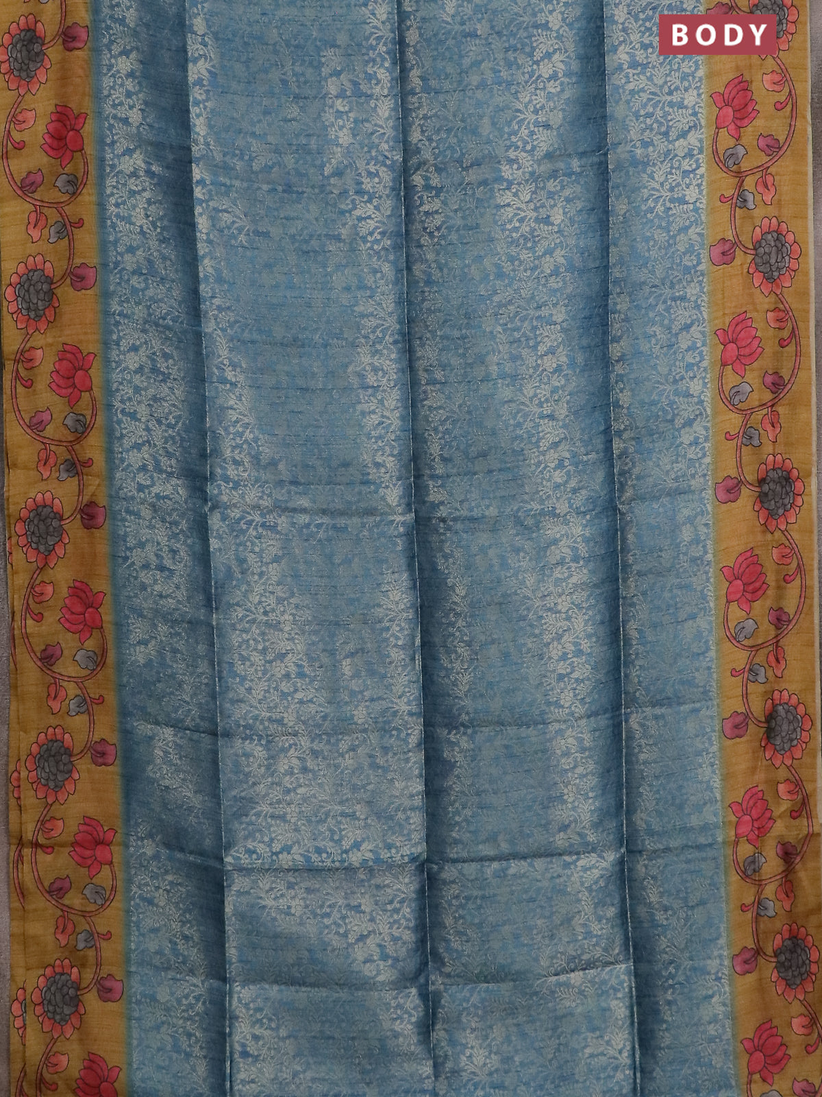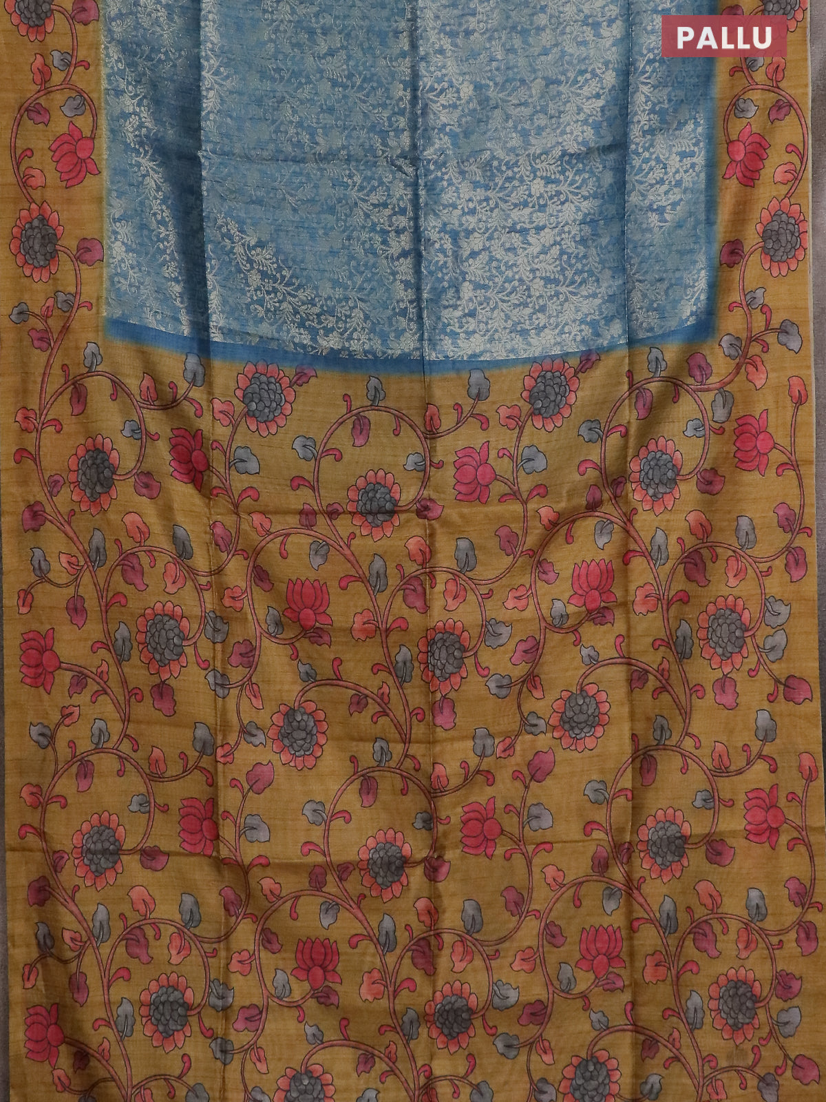 Semi jute silk saree bluish grey and mustard yellow with allover zari woven brocade weaves and kalamkari printed pallu