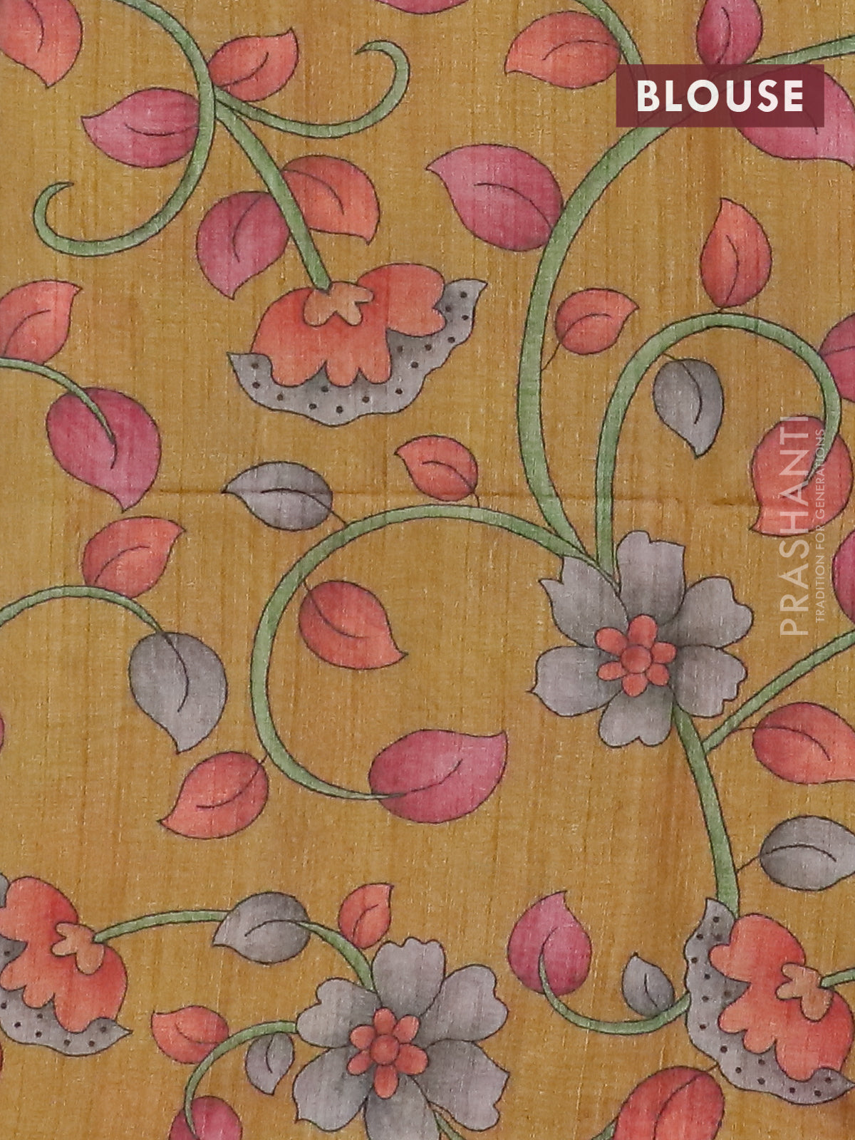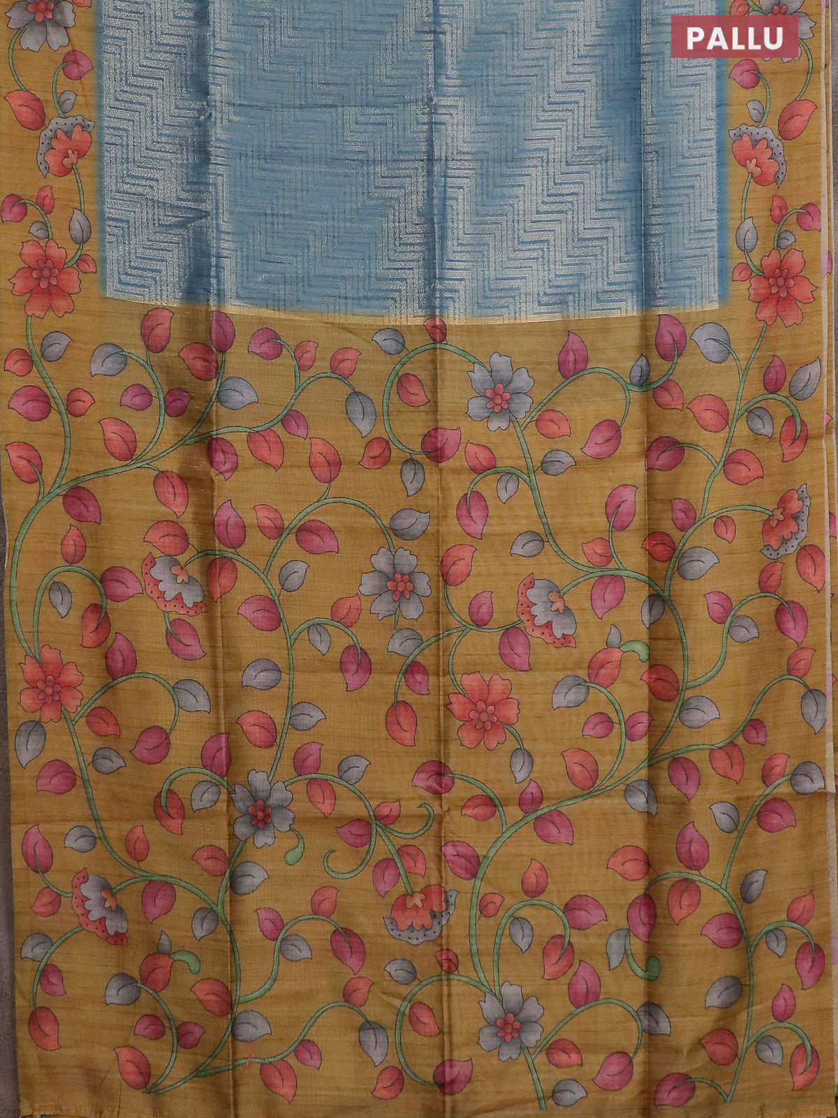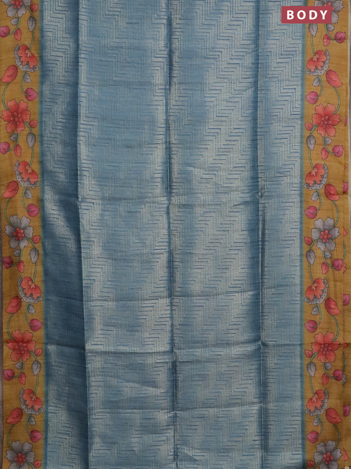 Semi jute silk saree bluish grey and mustard yellow with allover zari woven brocade weaves and kalamkari printed pallu