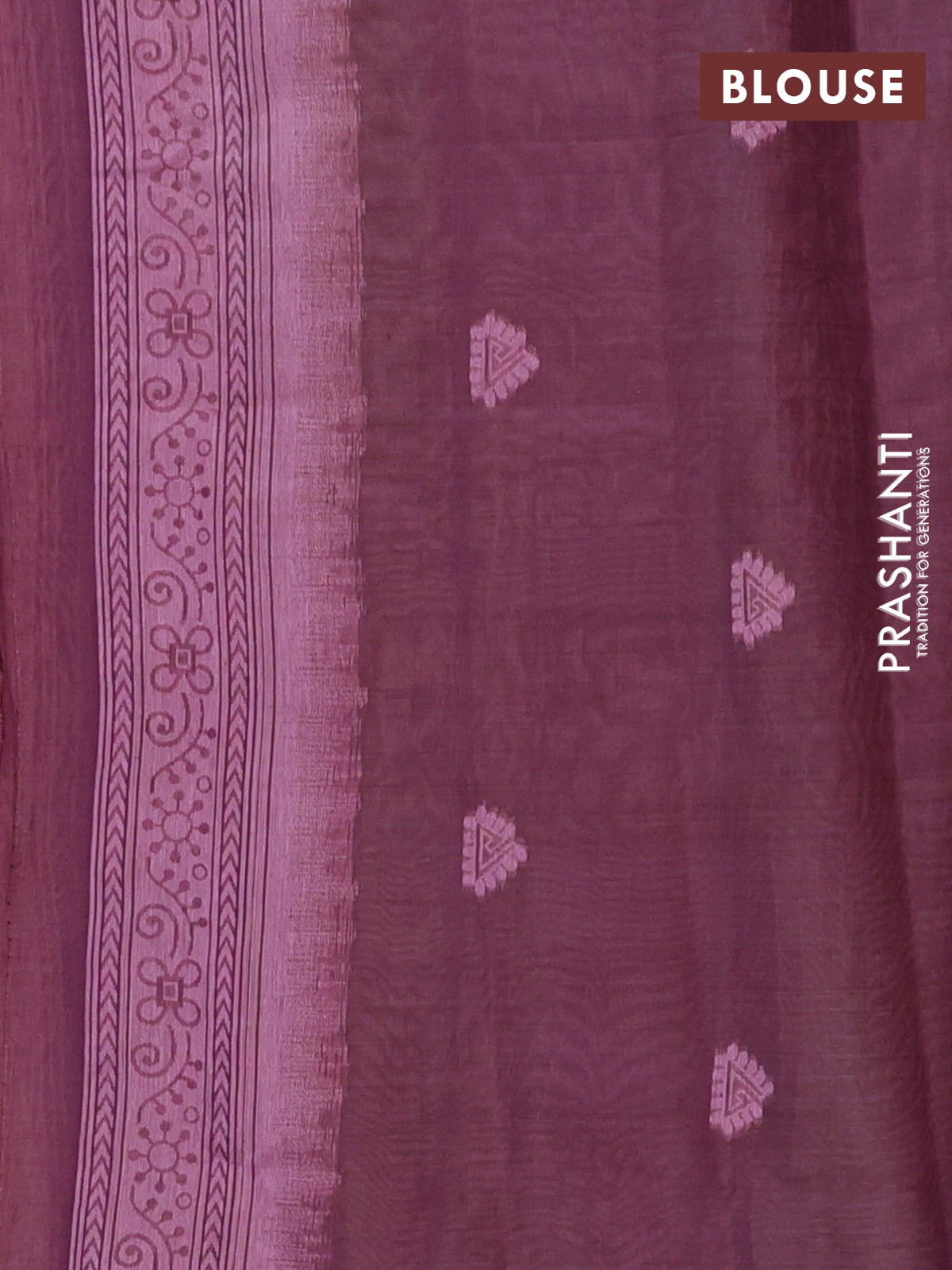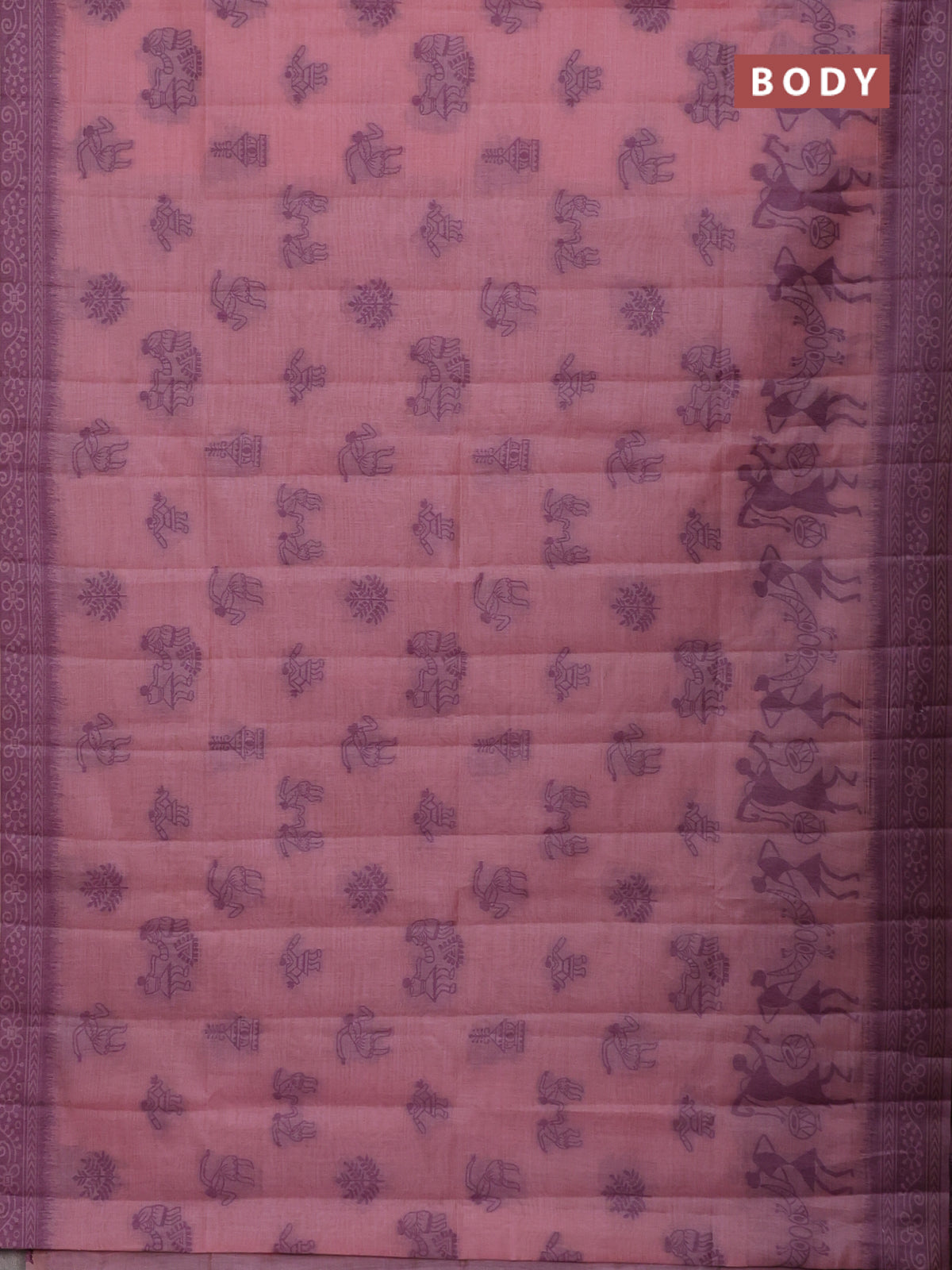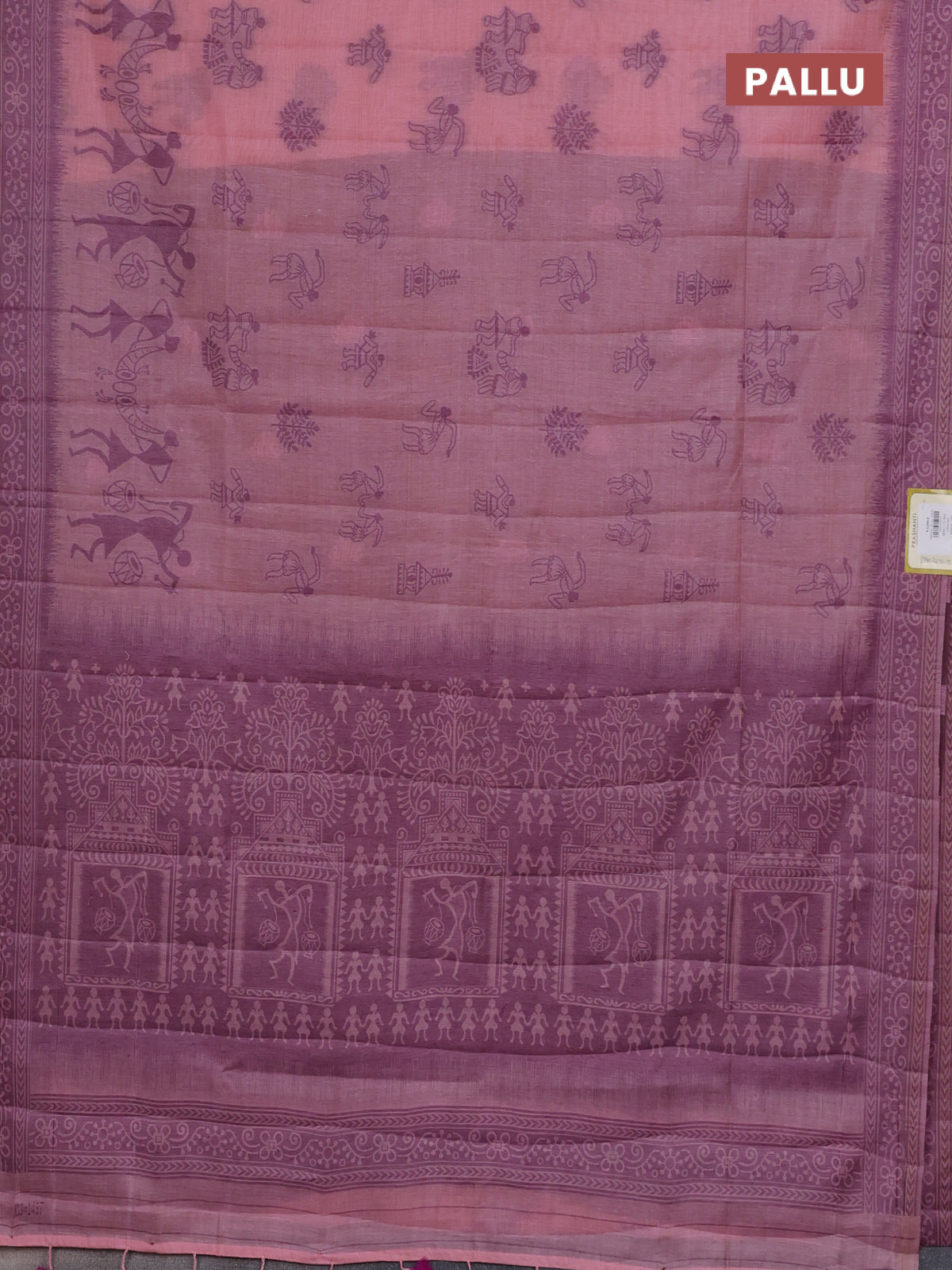 Semi jute silk saree mild peach pink and purple with thread woven buttas and warli design weaving pallu