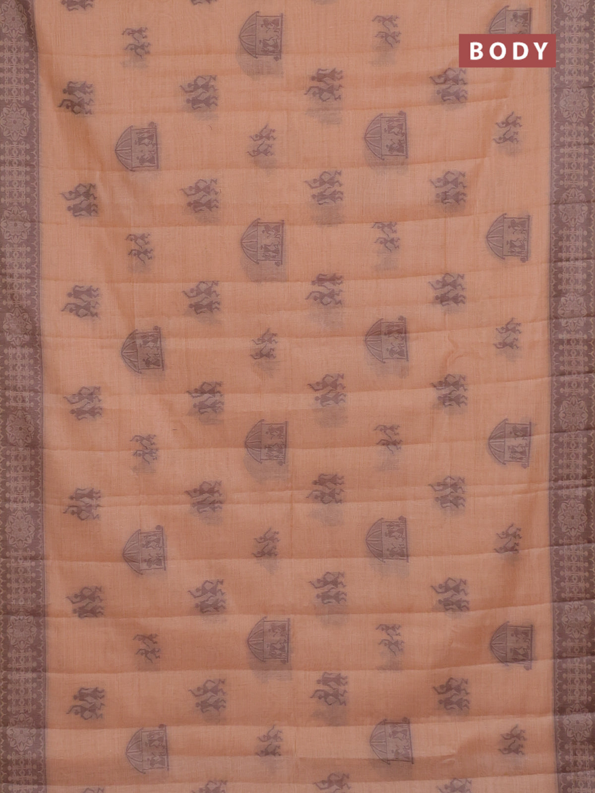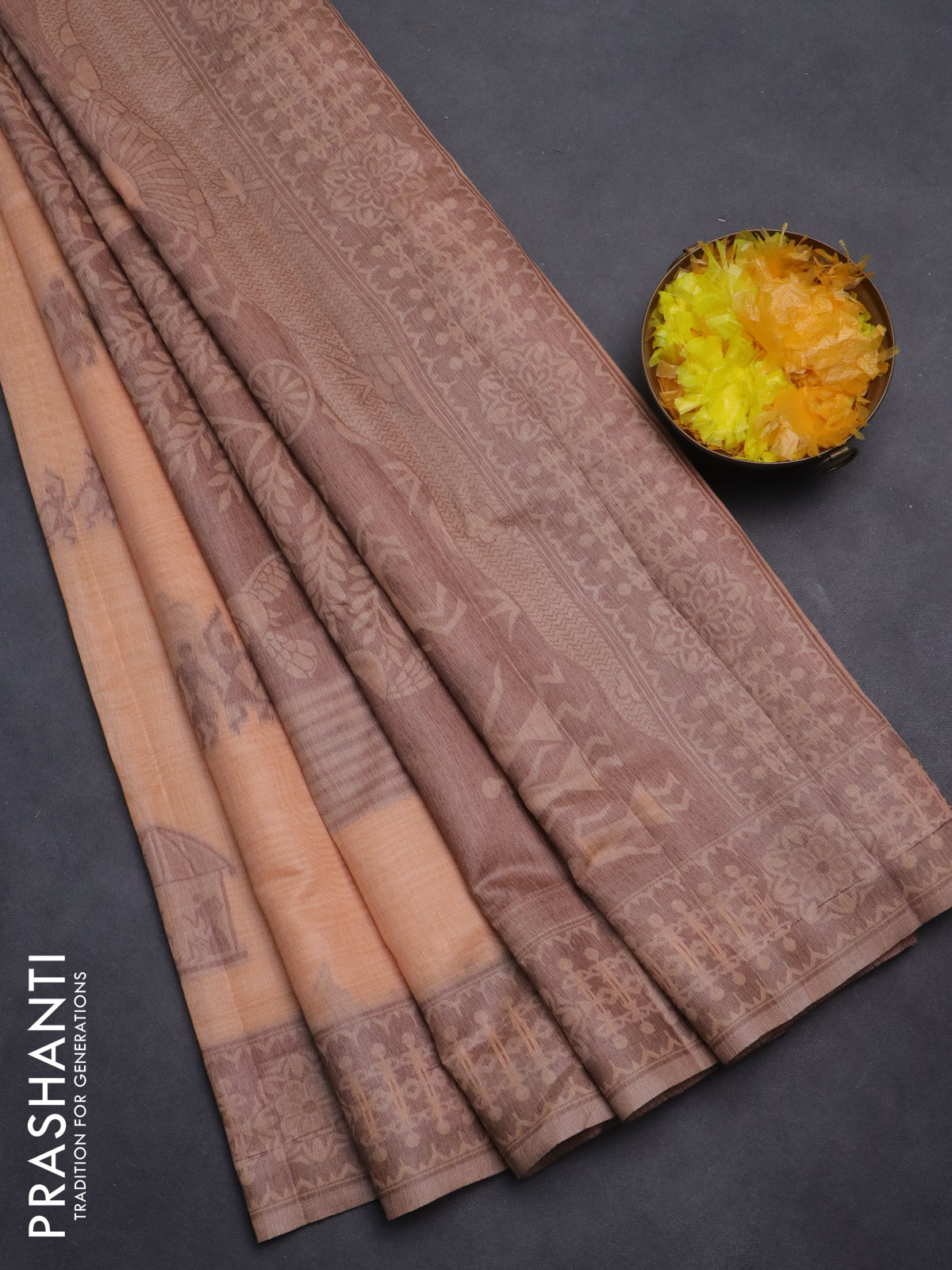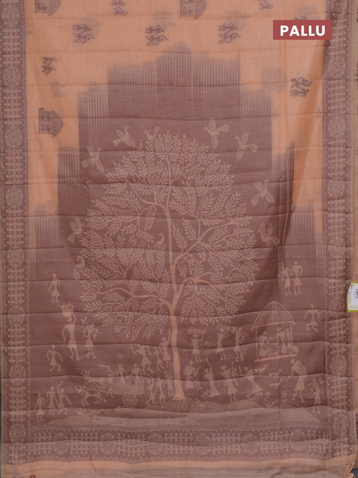 Semi jute silk saree pale orange and brown with thread woven warli buttas and warli design weaving pallu