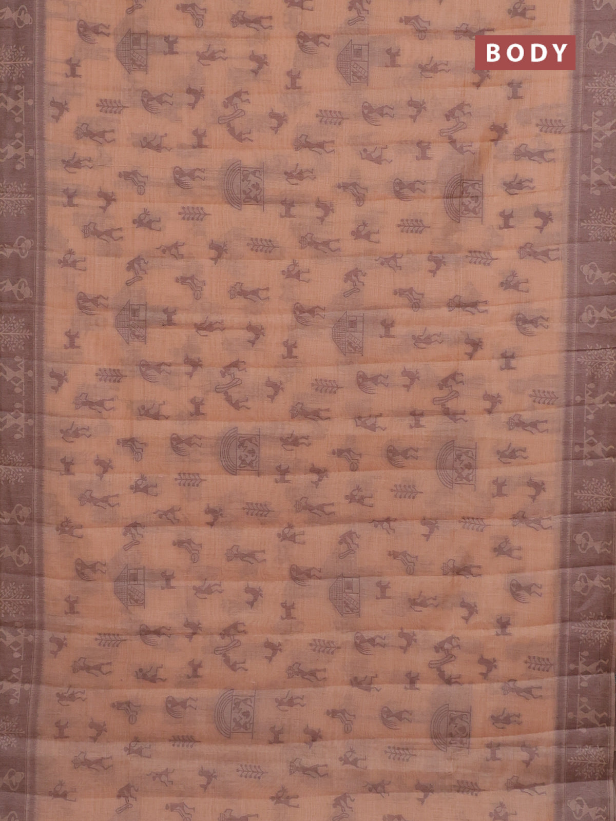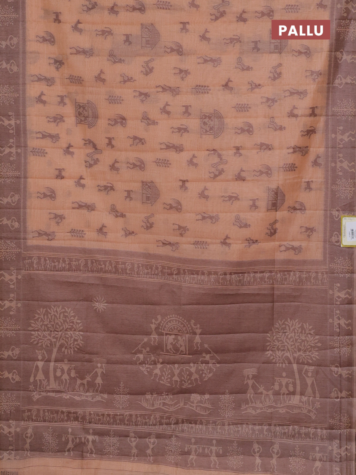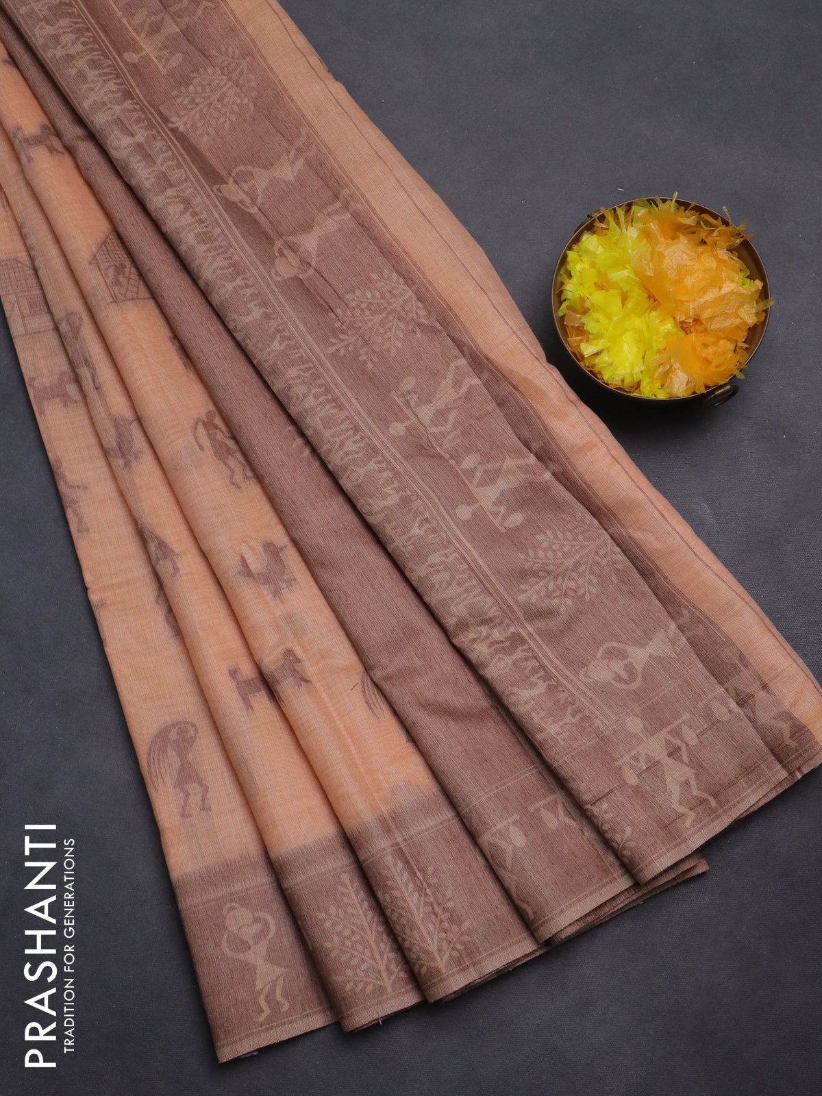 Semi jute silk saree pale orange and brown with warli thread woven buttas and warli design weaving pallu