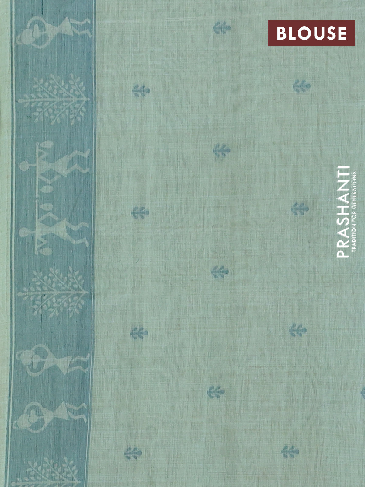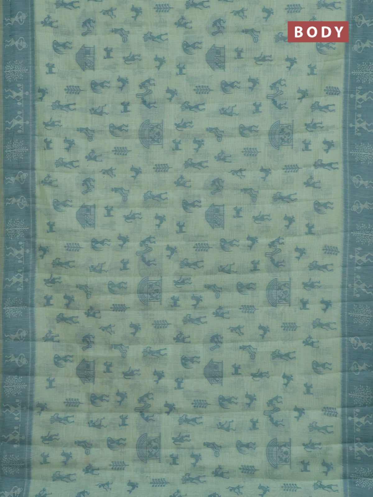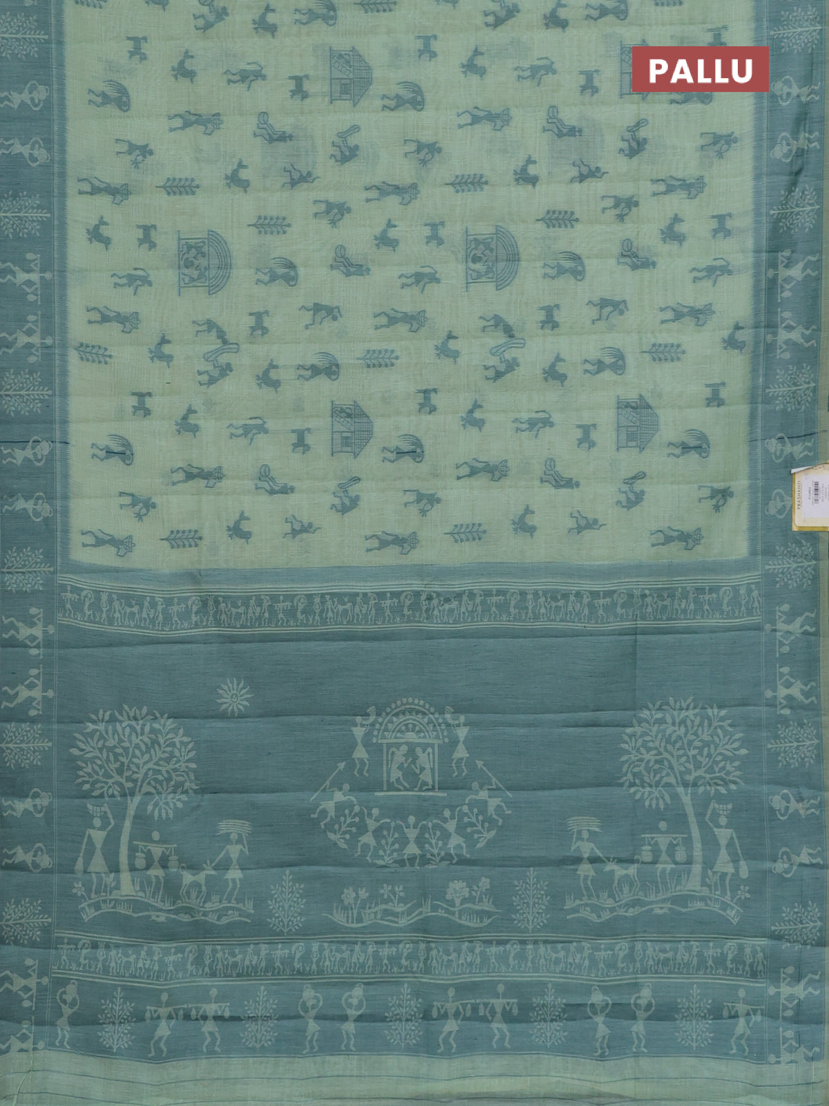 Semi jute silk saree pastel green and green with warli thread woven buttas and warli design weaving pallu