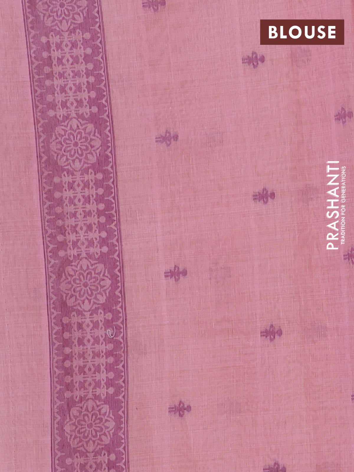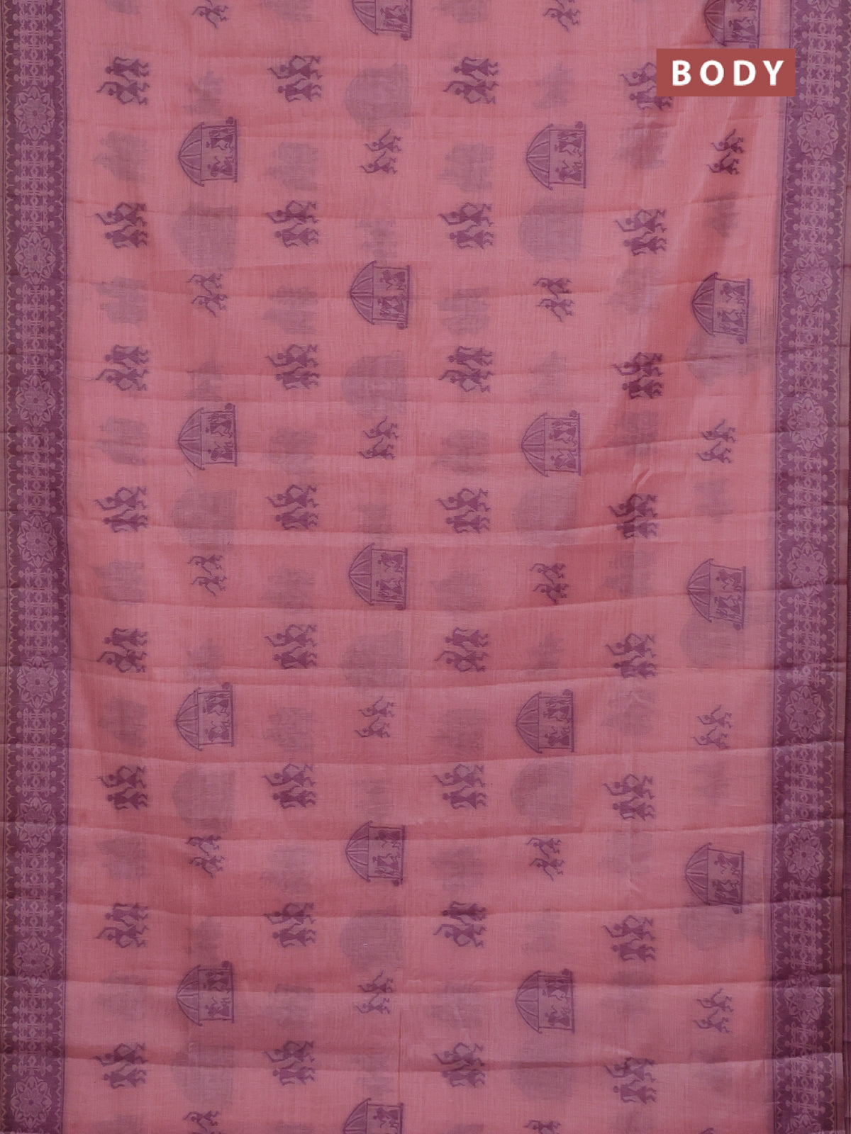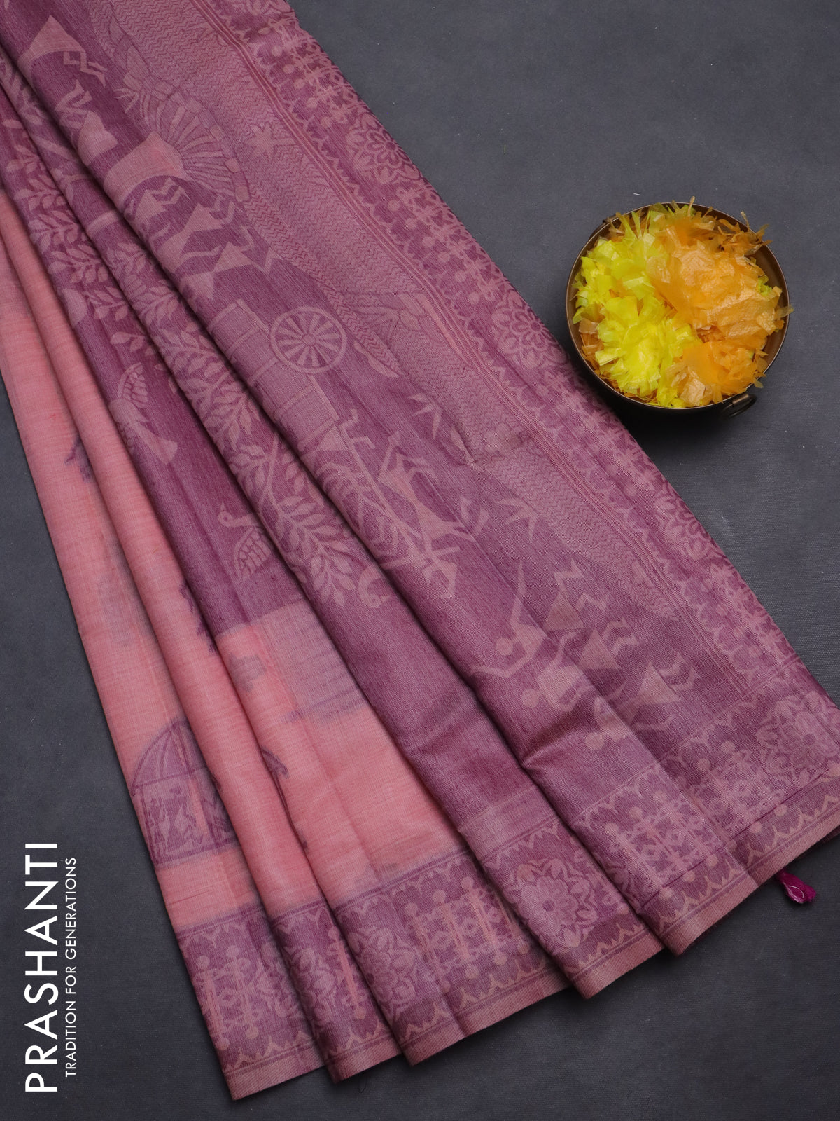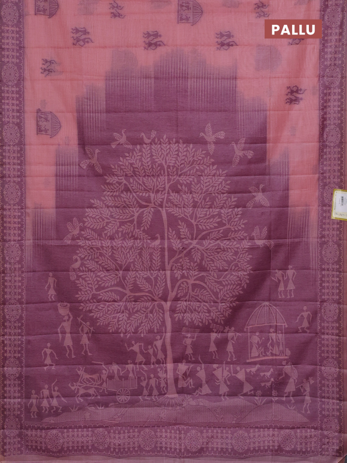 Semi jute silk saree peach pink and wine shade with thread woven warli buttas and warli design weaving pallu
