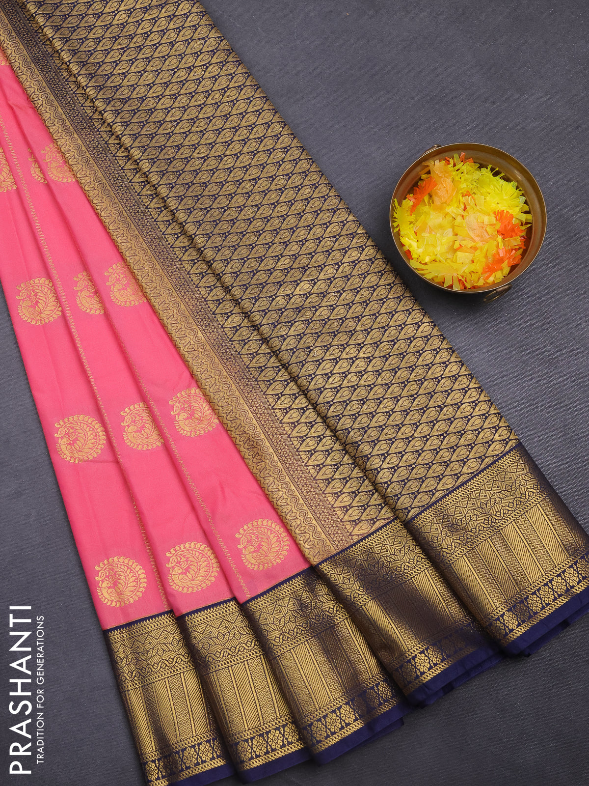 Semi kanchipuram silk saree peach pink and navy blue with allover zari weaves & buttas and zari woven korvai border