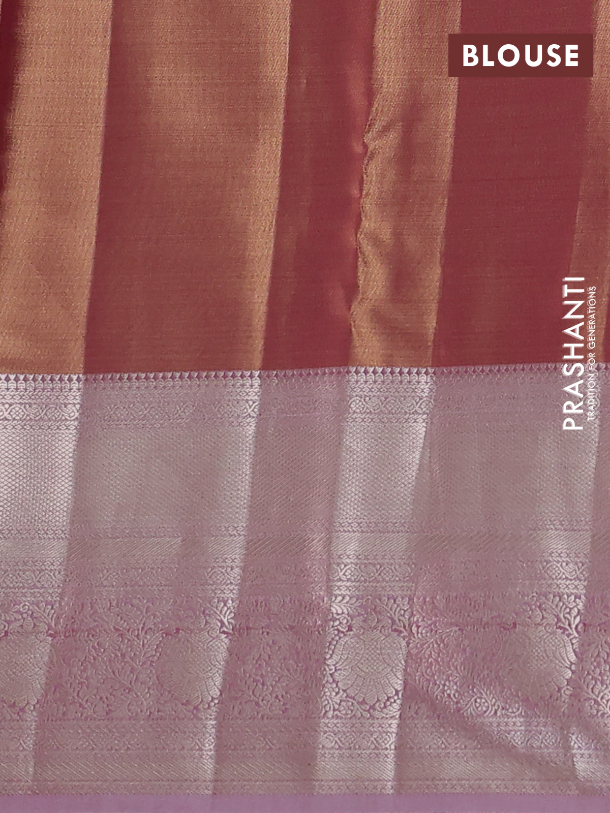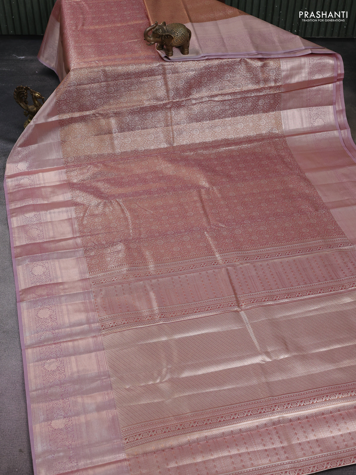 Semi kanchipuram tissue silk saree dual shade of pinkish gold and pastel pink with allover silver zari woven brocade weaves and long zari woven border