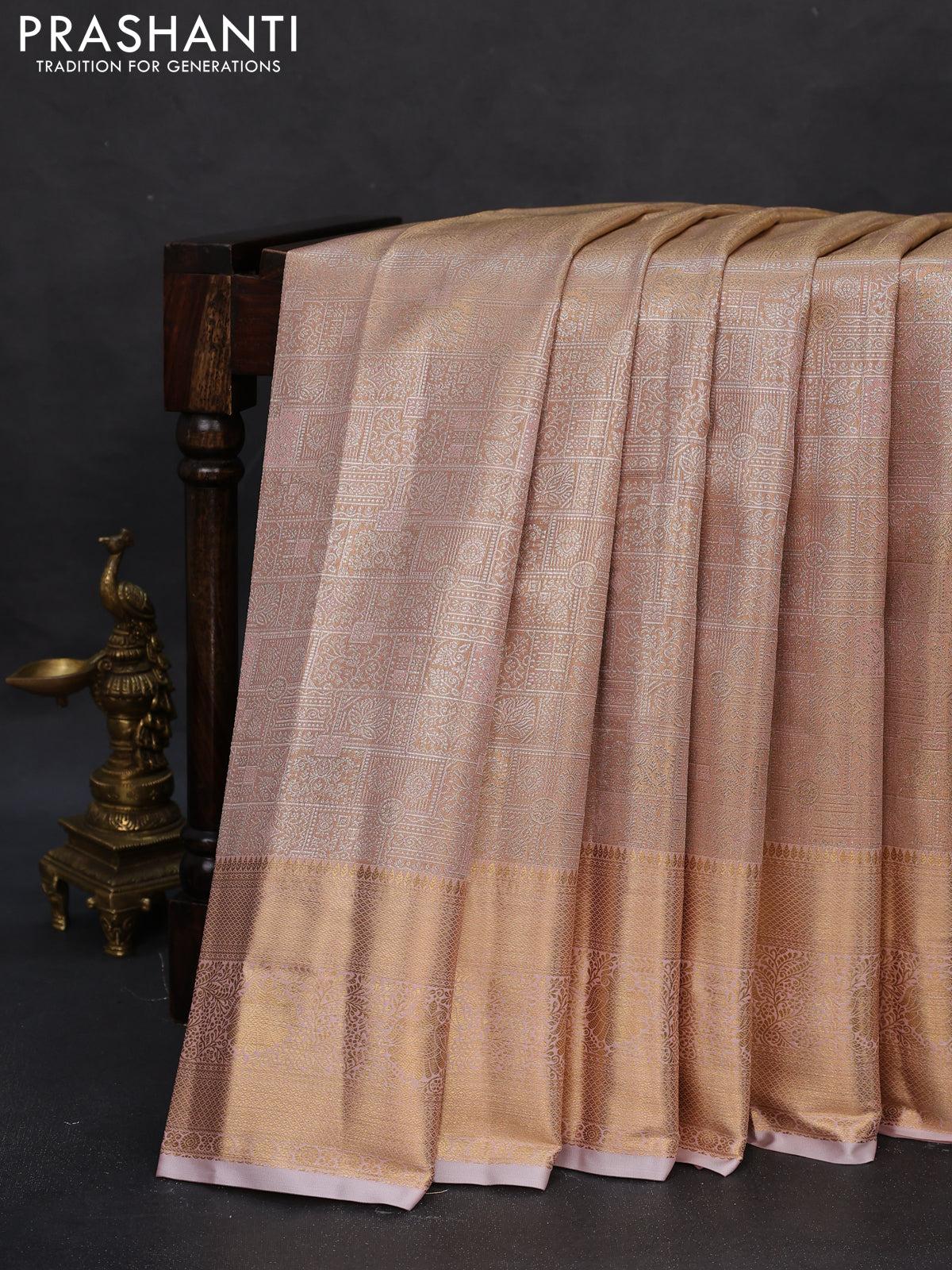 Semi kanchipuram tissue silk saree pastel peach with allover silver zari woven brocade weaves and zari woven border