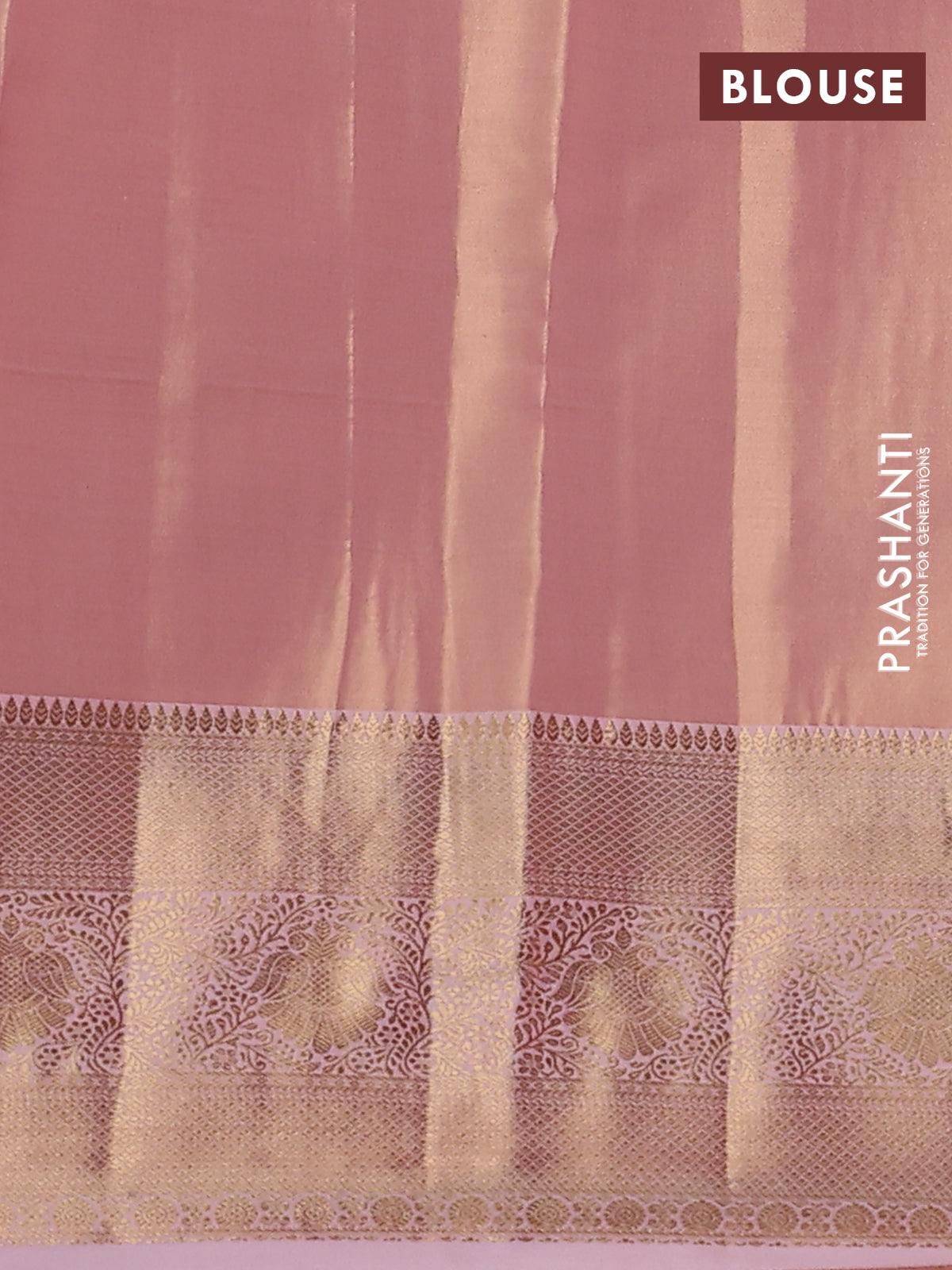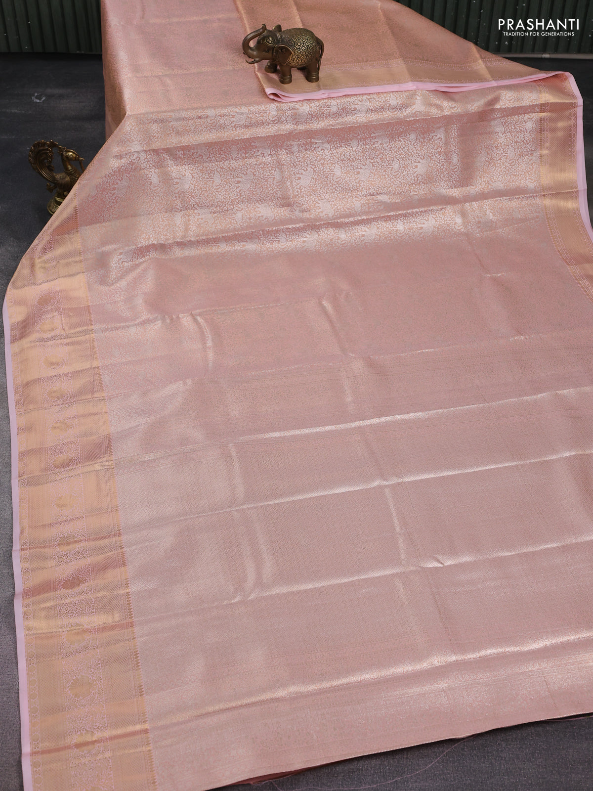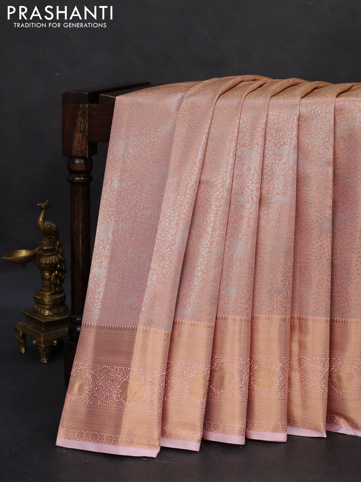 Semi kanchipuram tissue silk saree peach orange with allover silver zari woven brocade weaves and zari woven border