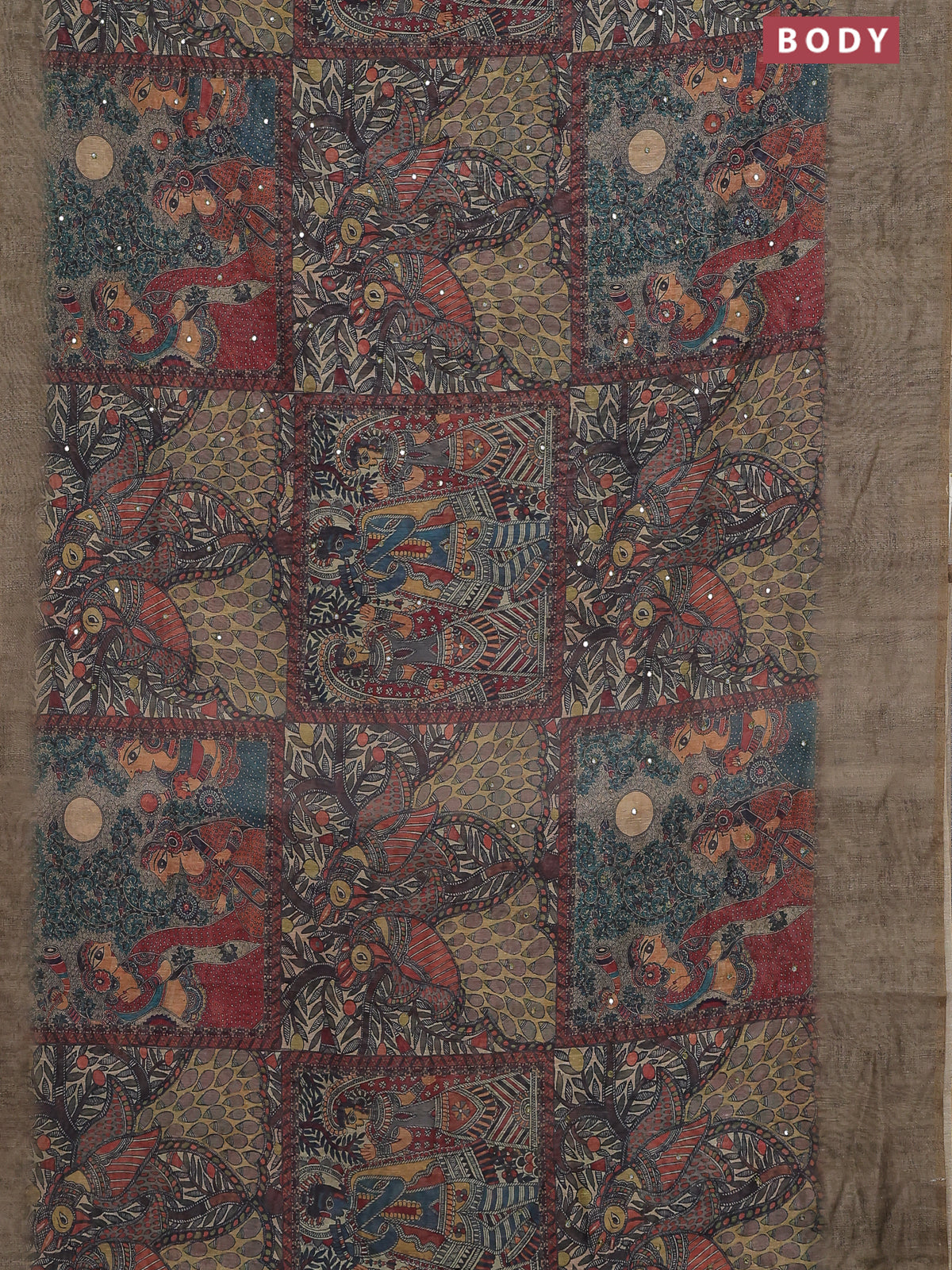 Semi linen saree elaichi green with allover madhubani prints & mirror work