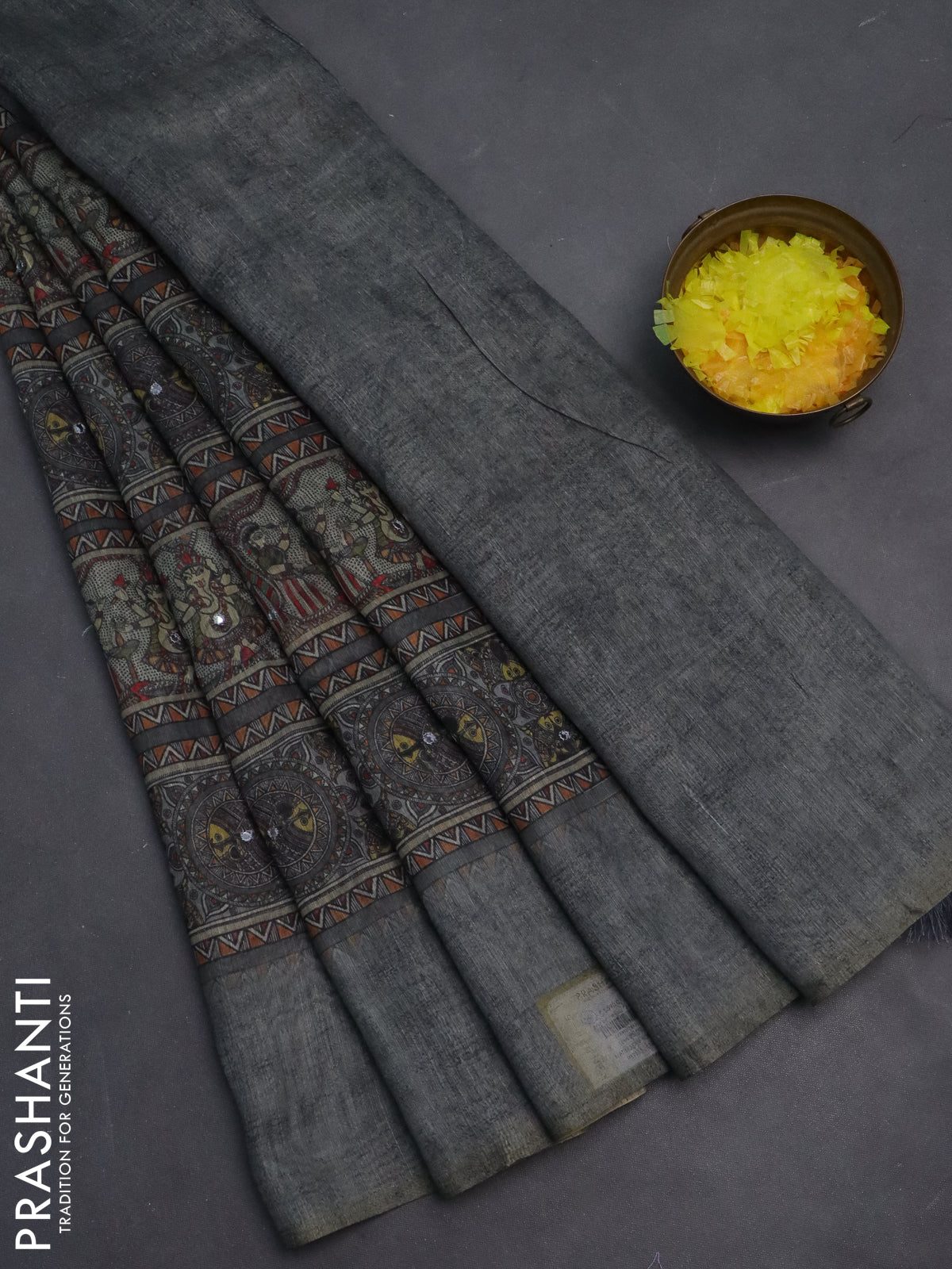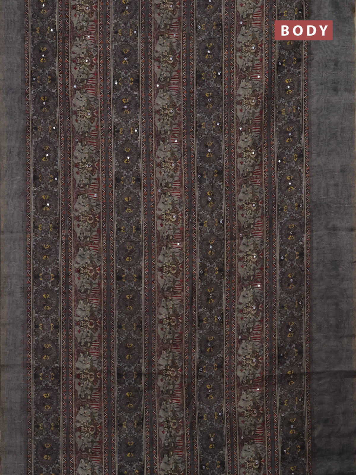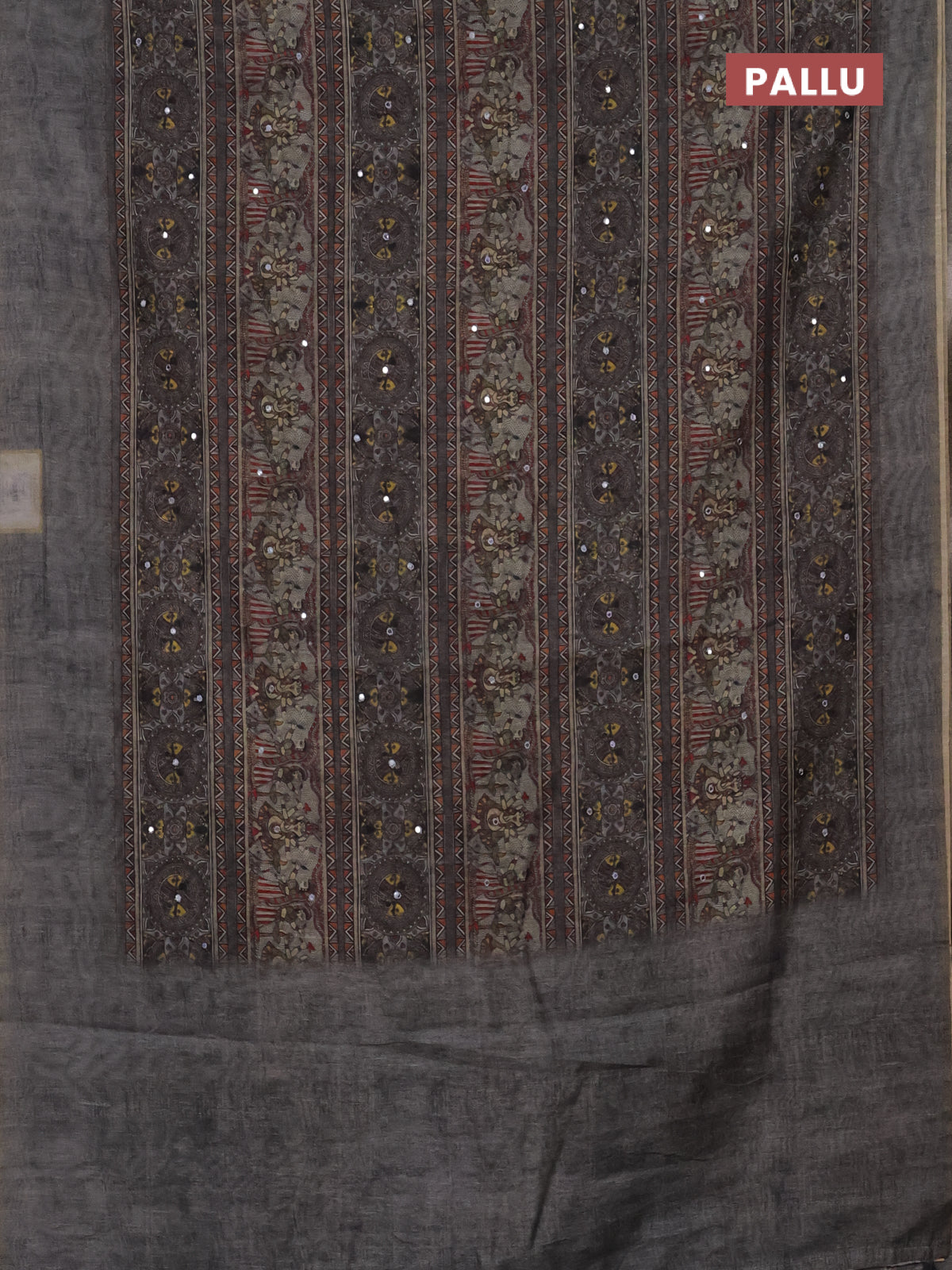 Semi linen saree grey shade with allover madhubani prints & mirror work