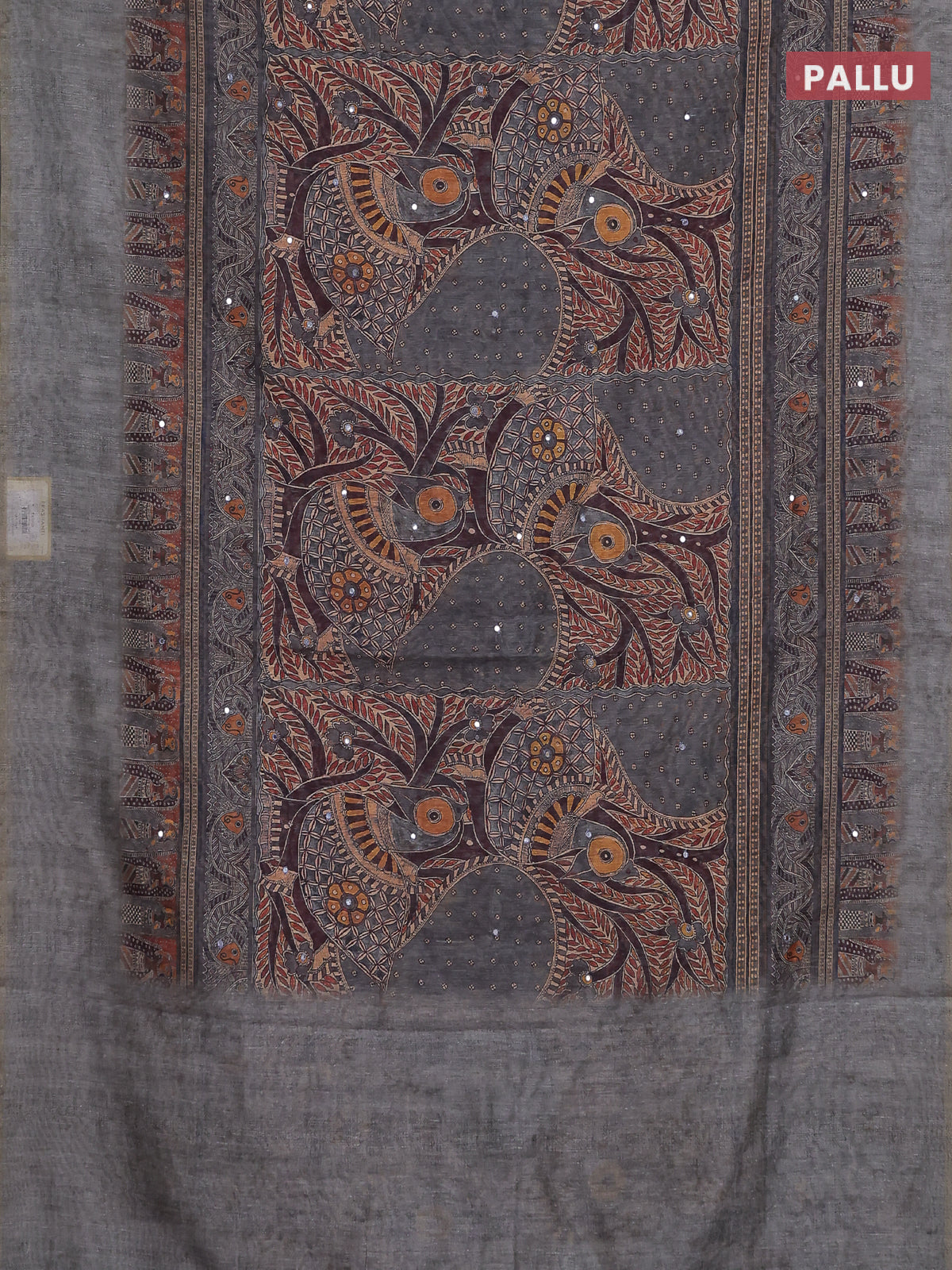 Semi linen saree grey shade with allover madhubani prints & mirror work