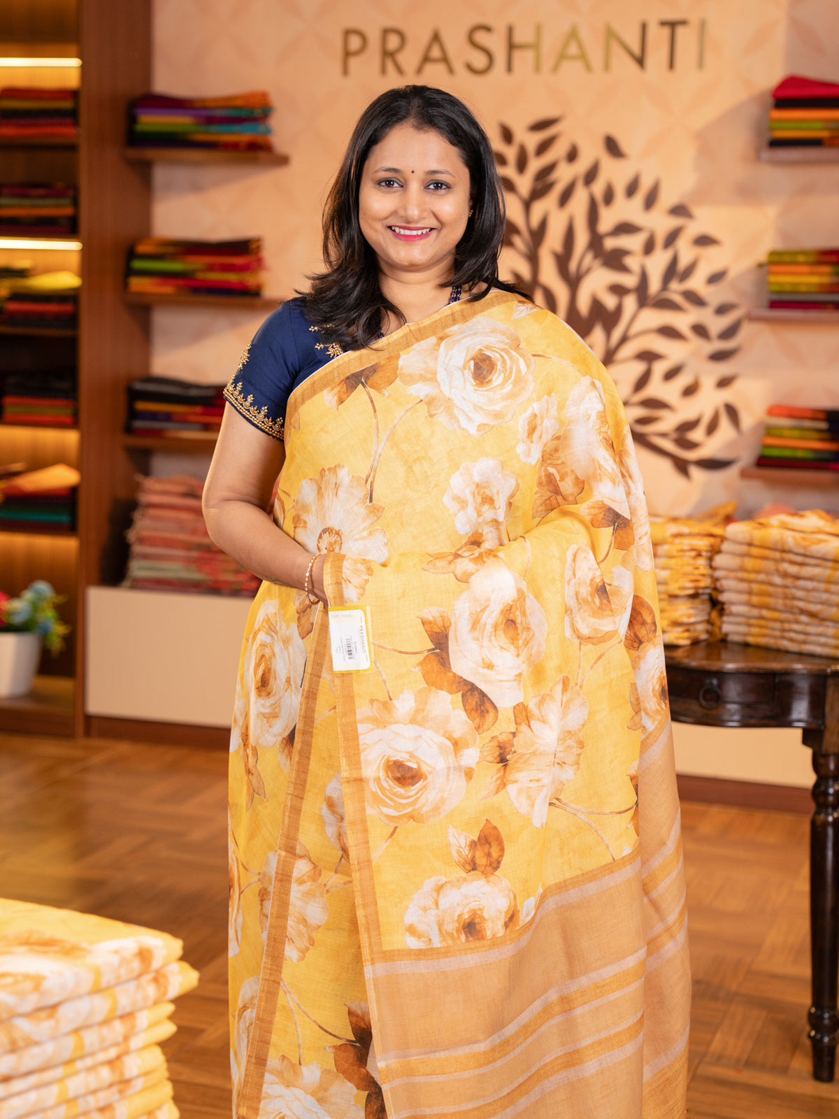 semi linen saree mustard yellow with allover floral digital prints and piping border