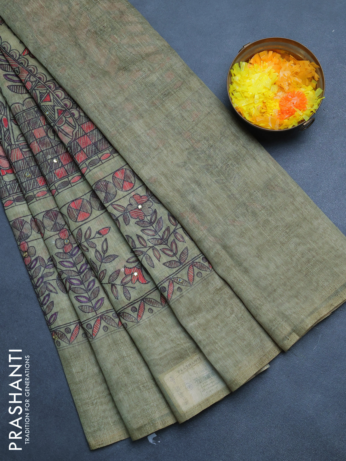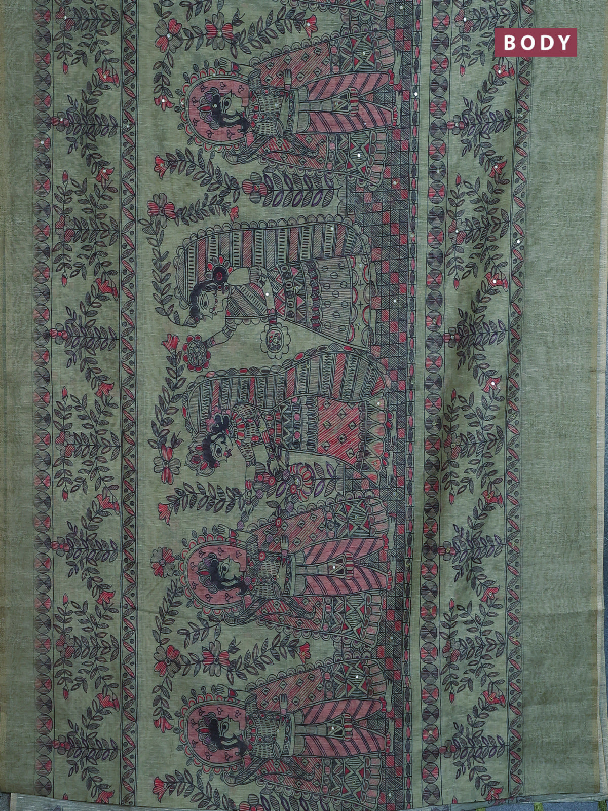 Semi linen saree pastel green with allover madhubani prints & mirror work